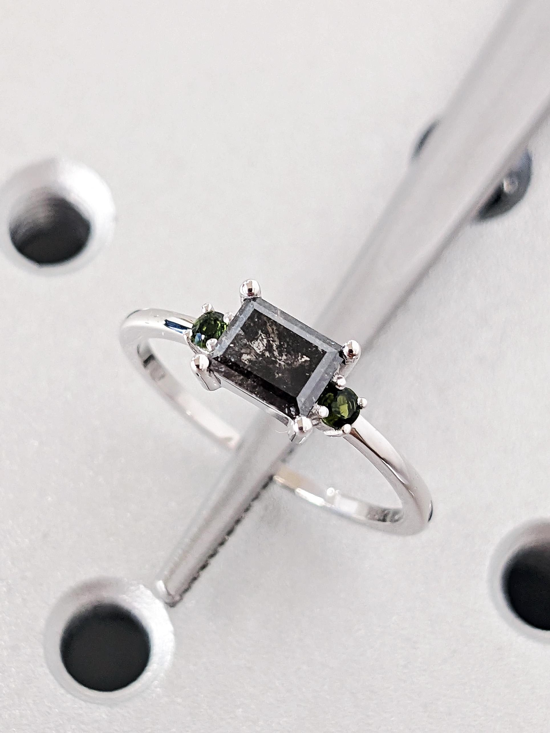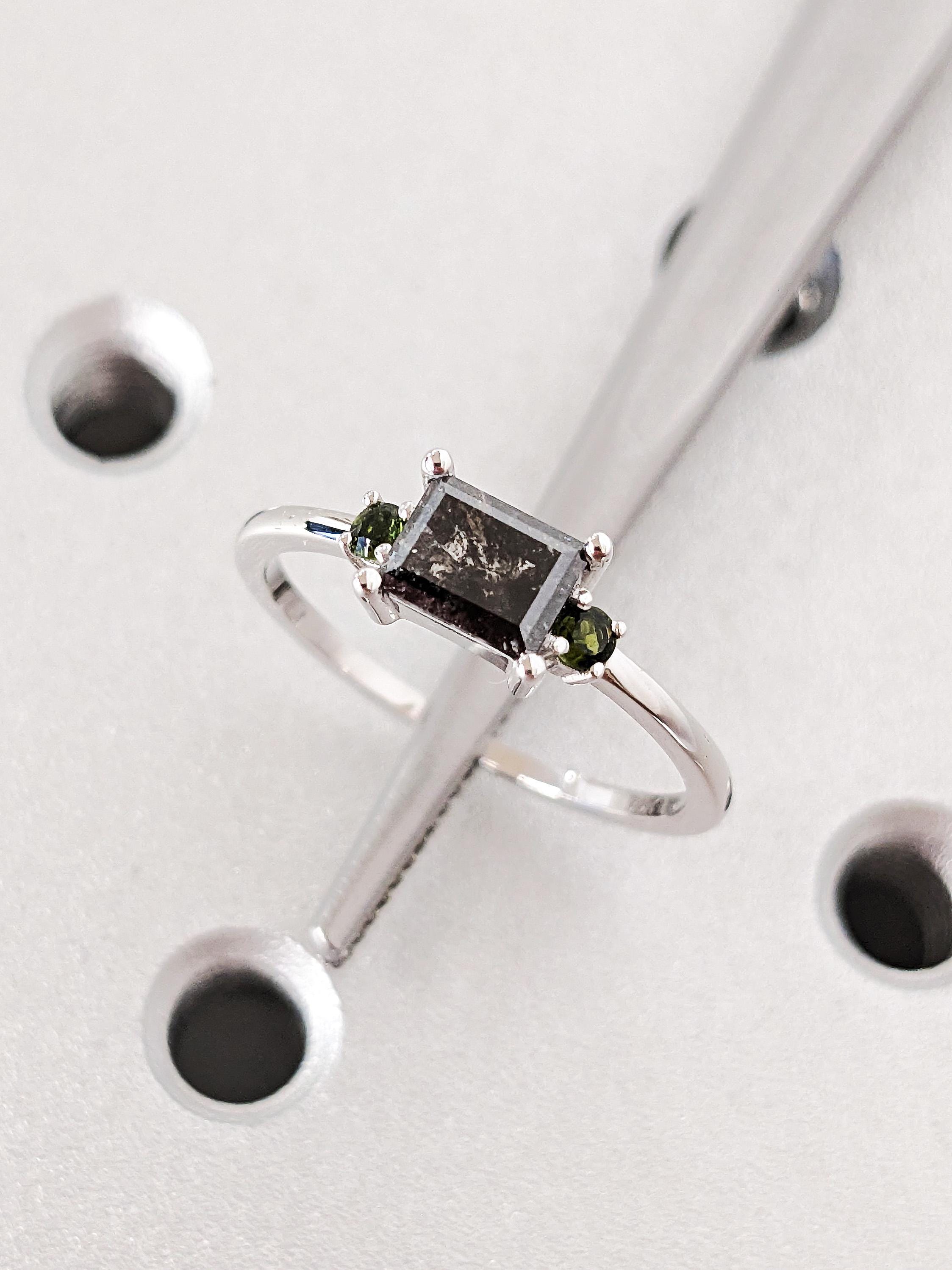 A striking combination of modern edge and timeless charm, this ring features a baguette cut Salt and Pepper Diamond framed by two deep green Tourmaline stones. Each gemstone carries its own unique inclusions and hues, creating a one of a kind piece that symbolizes individuality and balance.