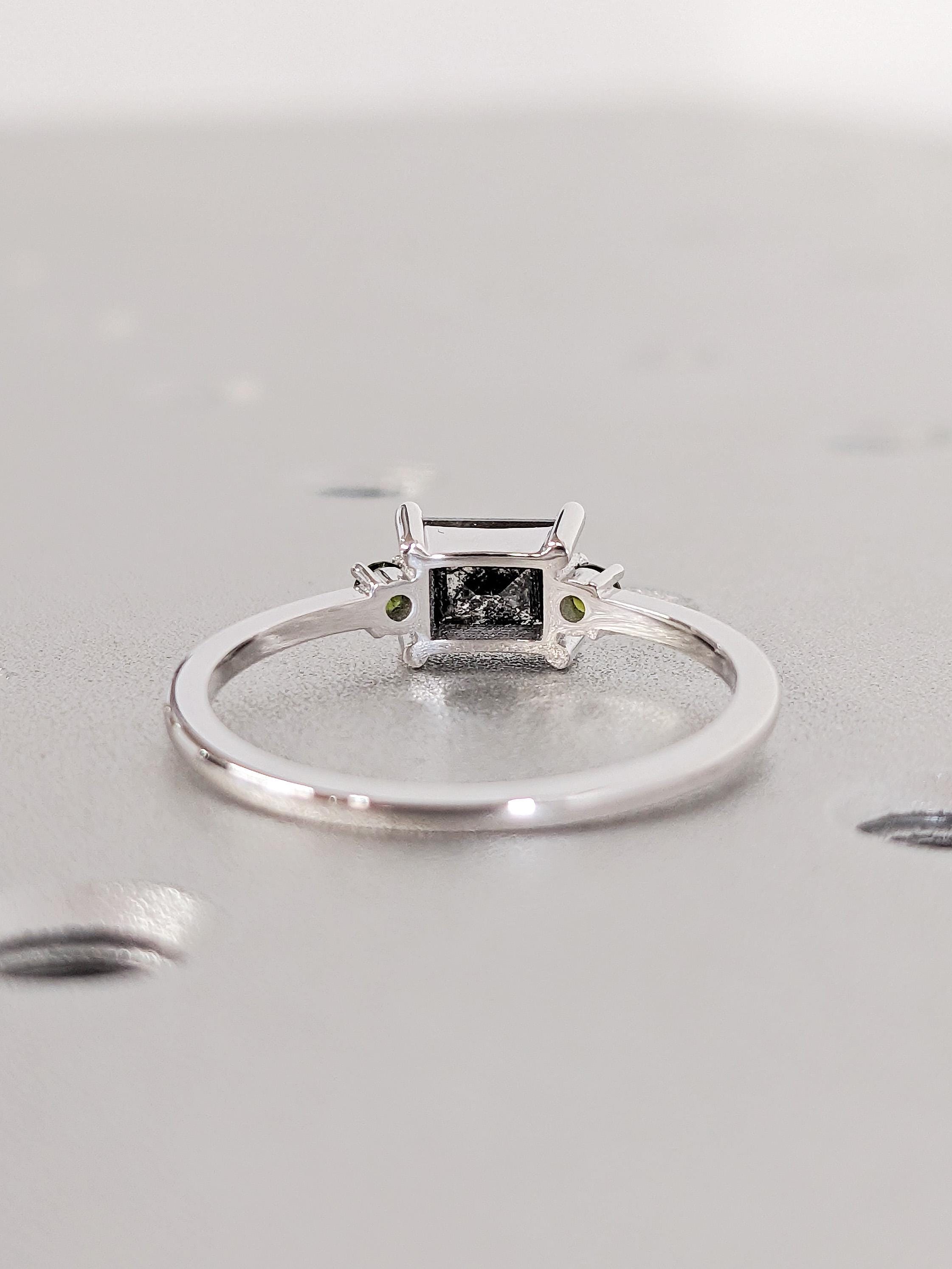18K White Gold Salt and Pepper Diamond Engagement Ring, Unique Green Tourmaline Birthstone Wedding Band
