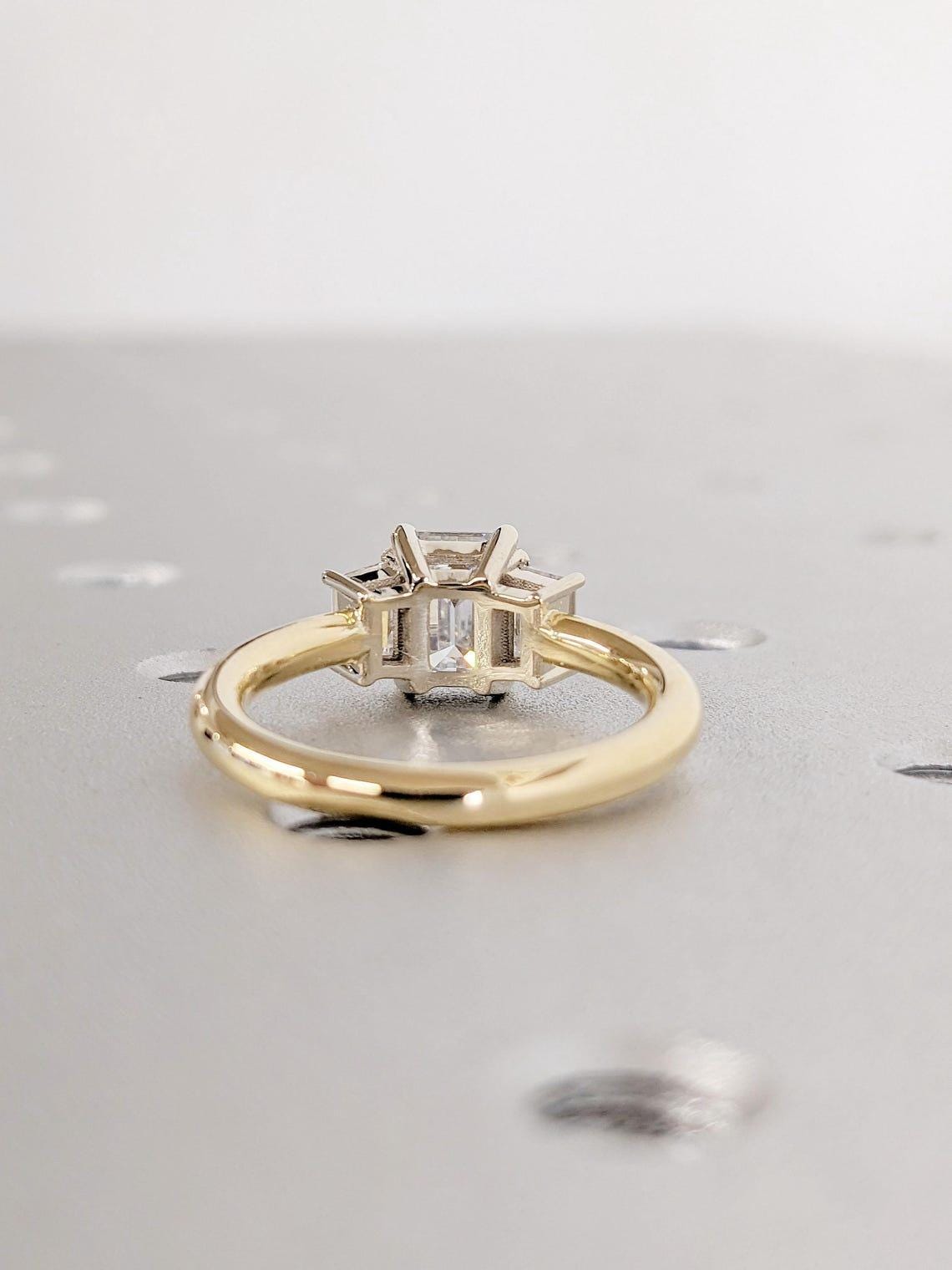 18k Yellow and White Gold Two Tone Wedding Anniversary Ring | Emerald cut CVD Diamond with Trapezoid Side Stone