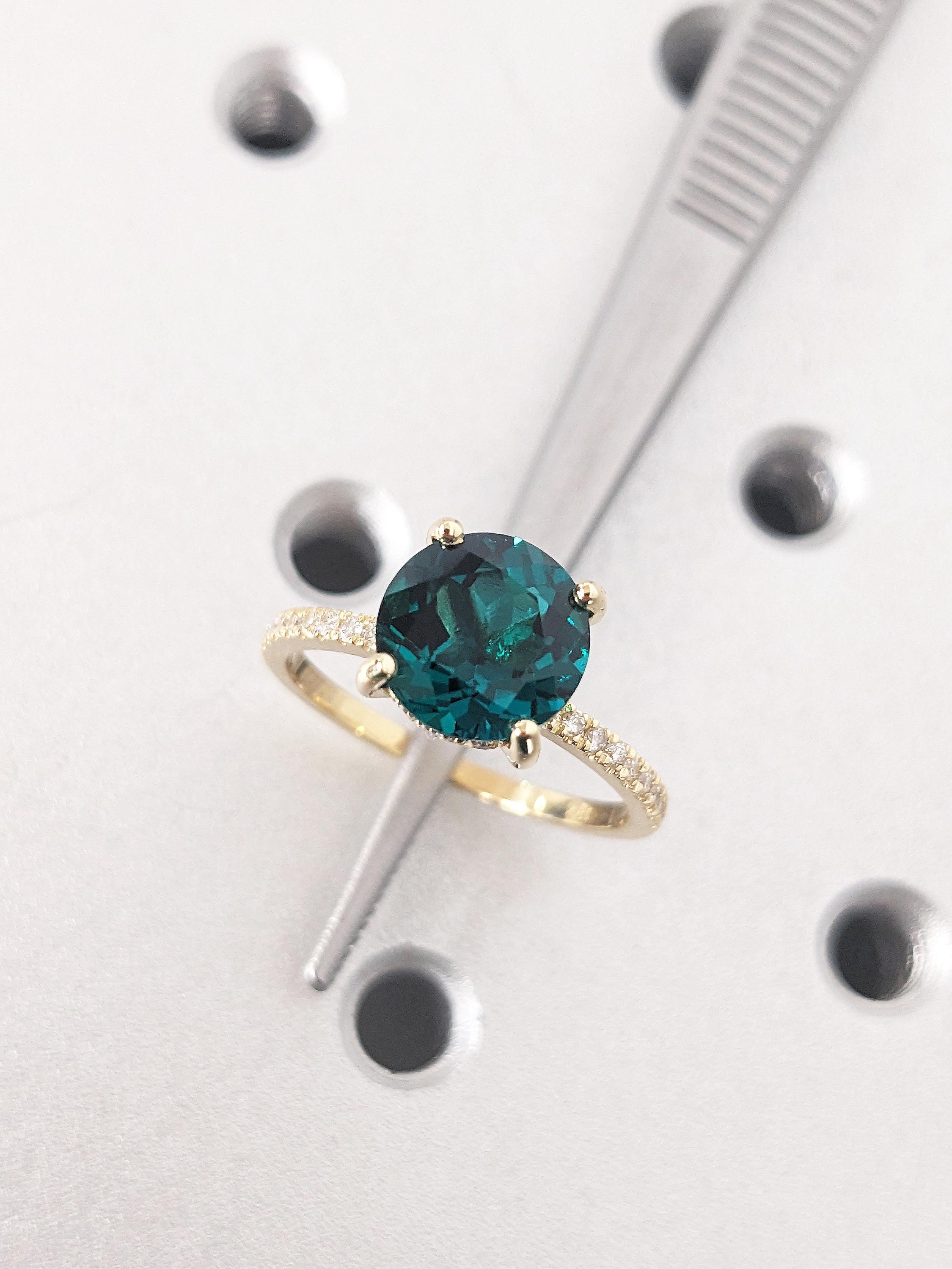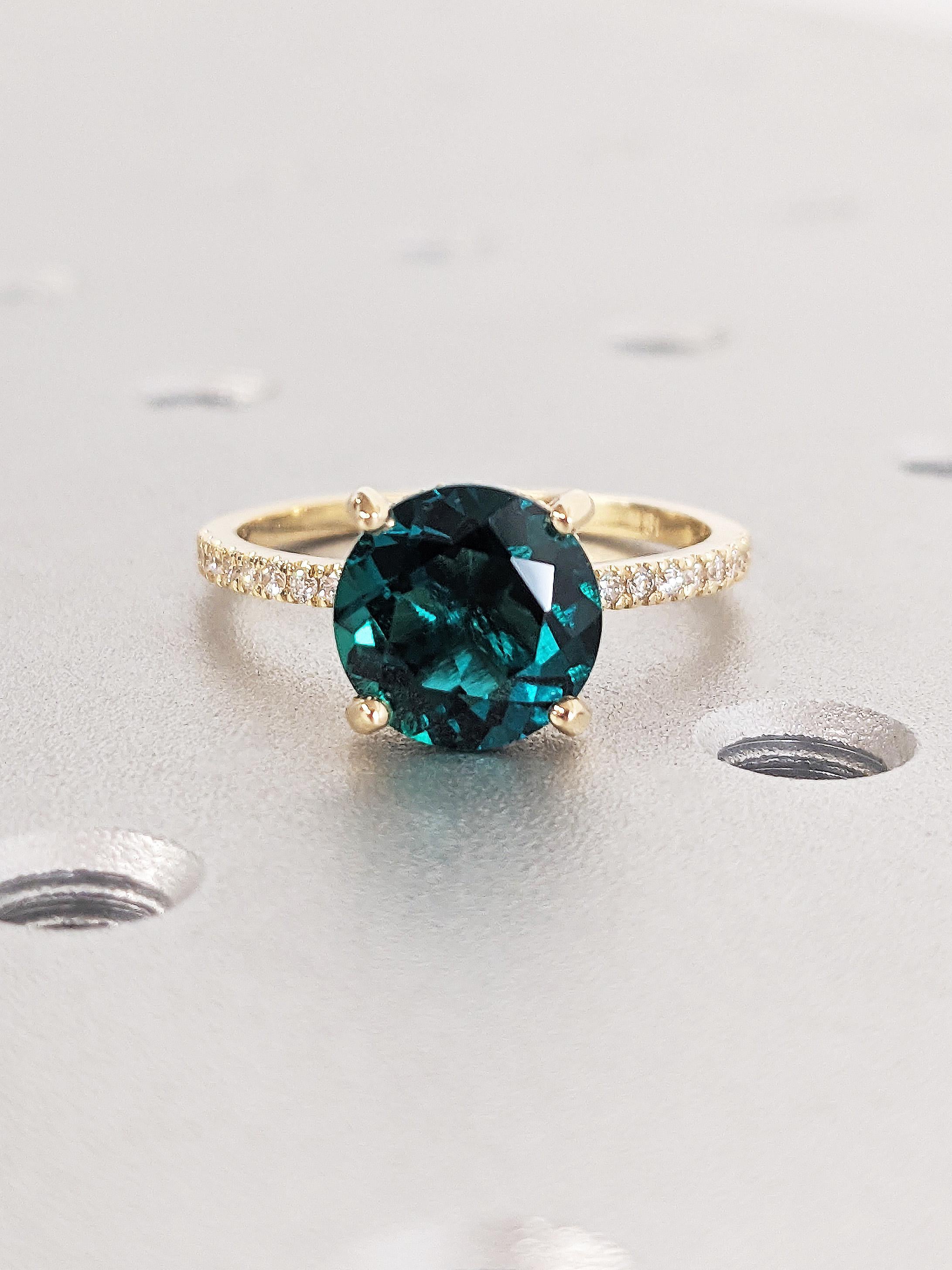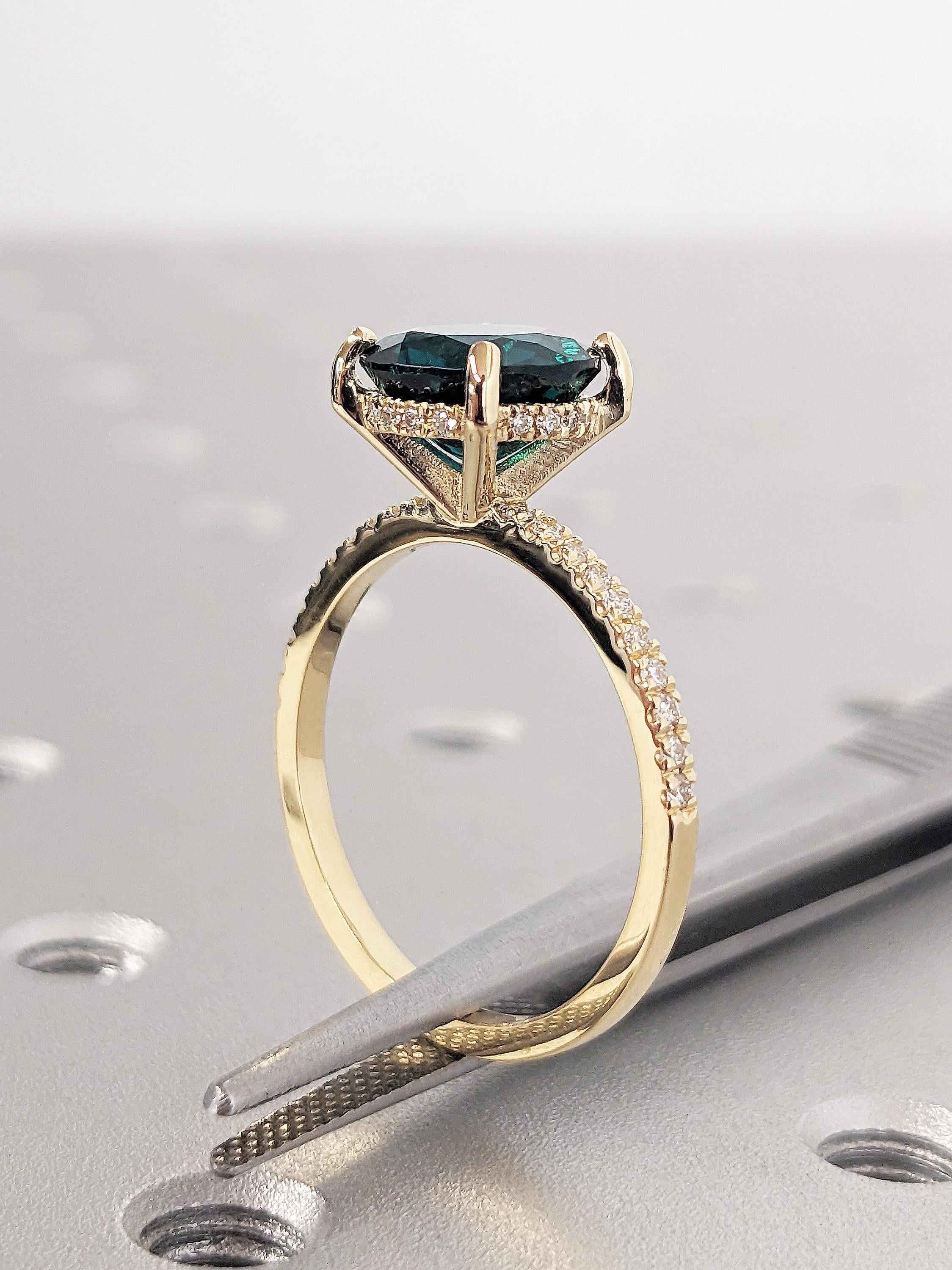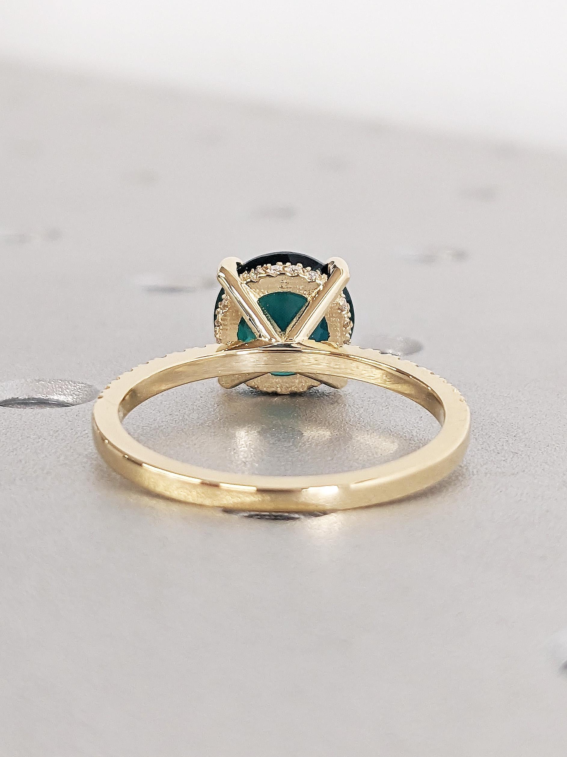 Bold and captivating, this Emerald wedding ring is crafted to stand out. At its center sits a vivid round-cut Emerald, enhanced by a hidden halo of shimmering Diamonds or Moissanites that bring added brilliance and depth. The sleek silhouette blends modern elegance with timeless appeal, making it a meaningful choice for proposals, anniversaries or other cherished milestones. Meticulously designed for enduring beauty, this ring is a striking expression of love and individuality.