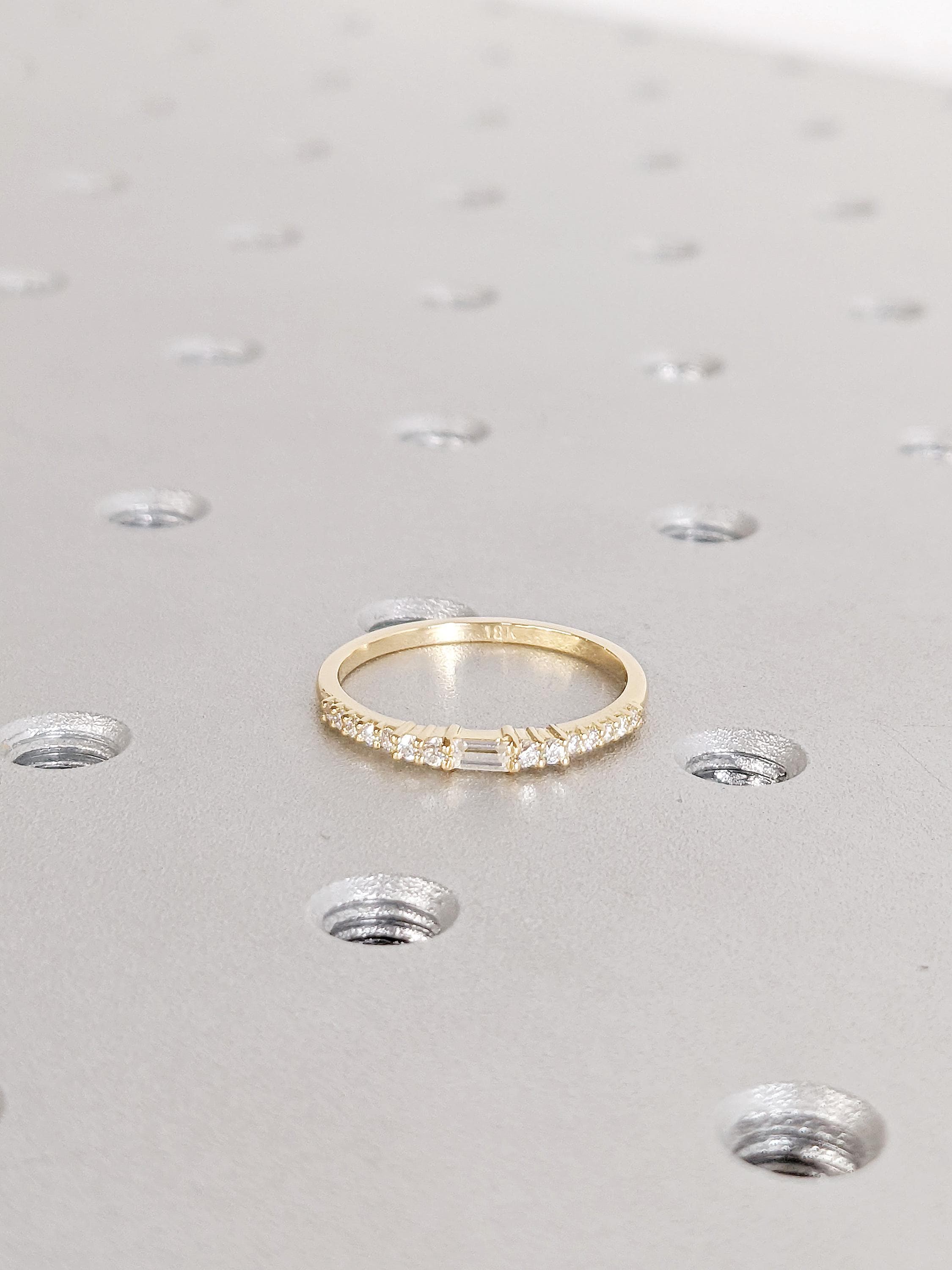 Add a touch of elegance to your bridal set with this stunning Diamond matching ring. Featuring a dainty design with a mix of baguette and round side stones, available in Natural Diamond or Moissanite, each stone is prong set to enhance its brilliance and balance. This classic stacking bridal ring transitions beautifully from everyday wear to special occasions, making it an ideal wedding band or complement to an engagement ring. With its timeless sparkle and graceful design, it brings refined beauty to any jewelry collection.