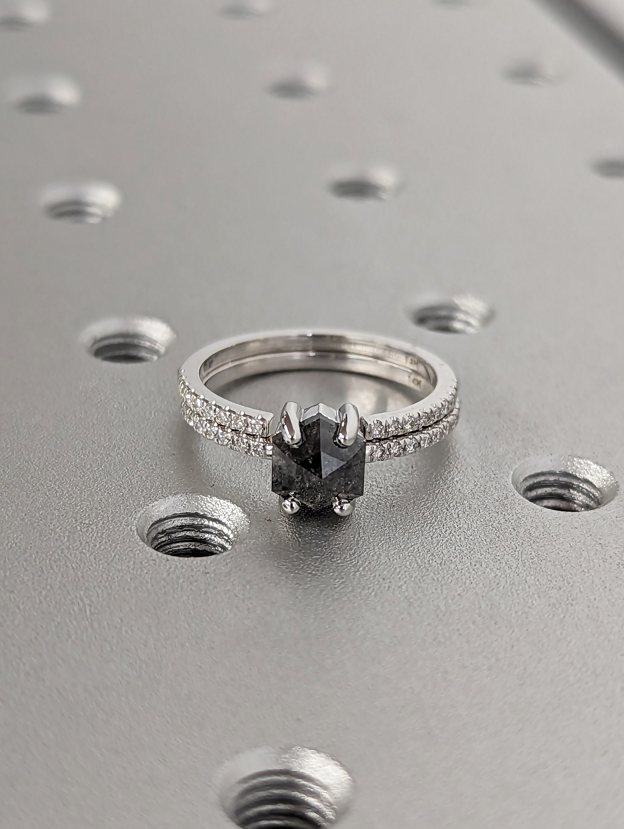 1920's 1ct Hexagon Raw Salt and Pepper Diamond Engagement Ring Set | 14K White Gold Wedding Band Set | Vintage Solitaire Ring Bridal Jewelry