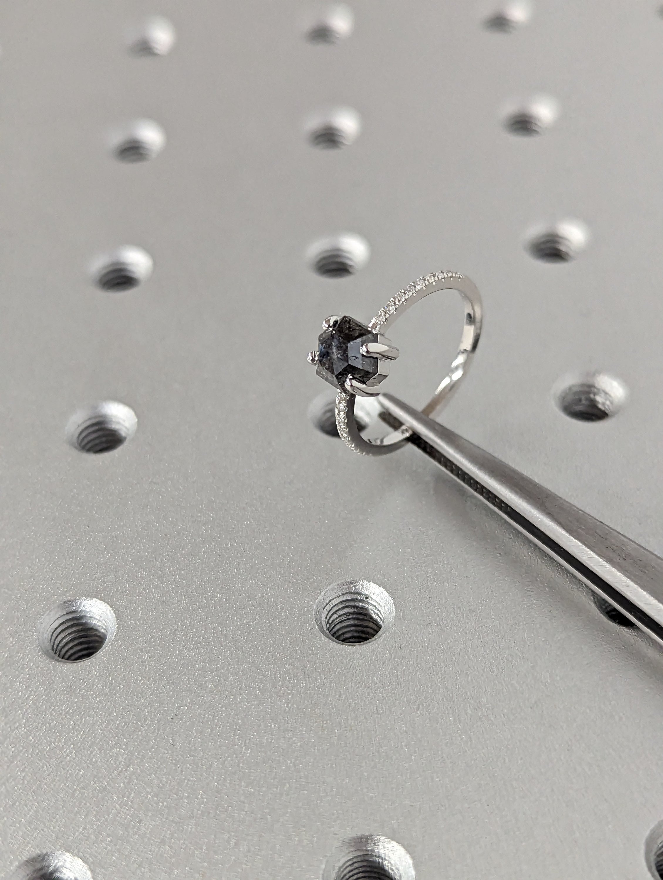 Enchanting vintage inspired design, with a unique Hexagon shaped full cut Salt and Pepper Diamond, adorned with natural round brilliant diamonds on the band. This elegant engagement ring can be match with an open diamond band.