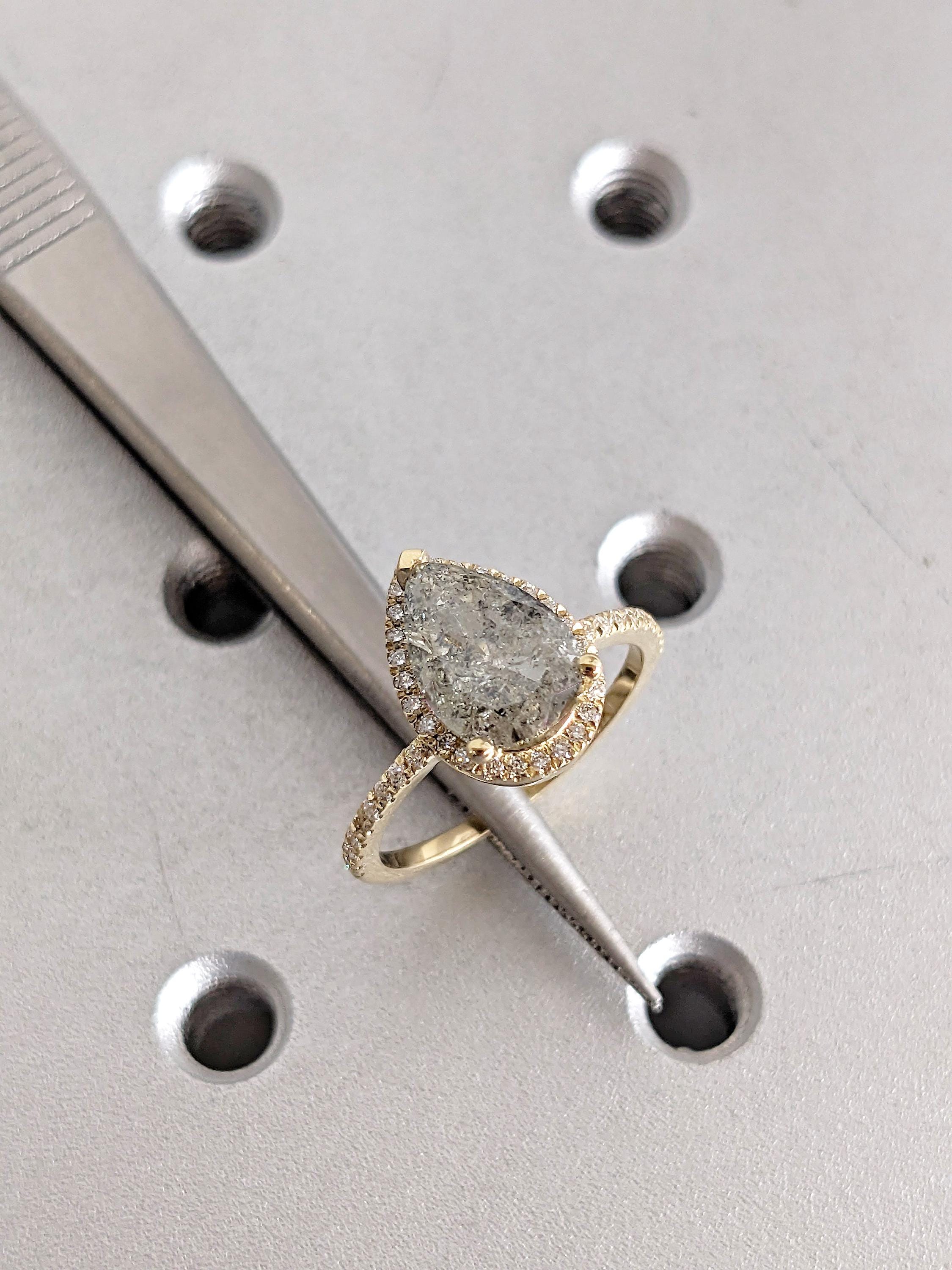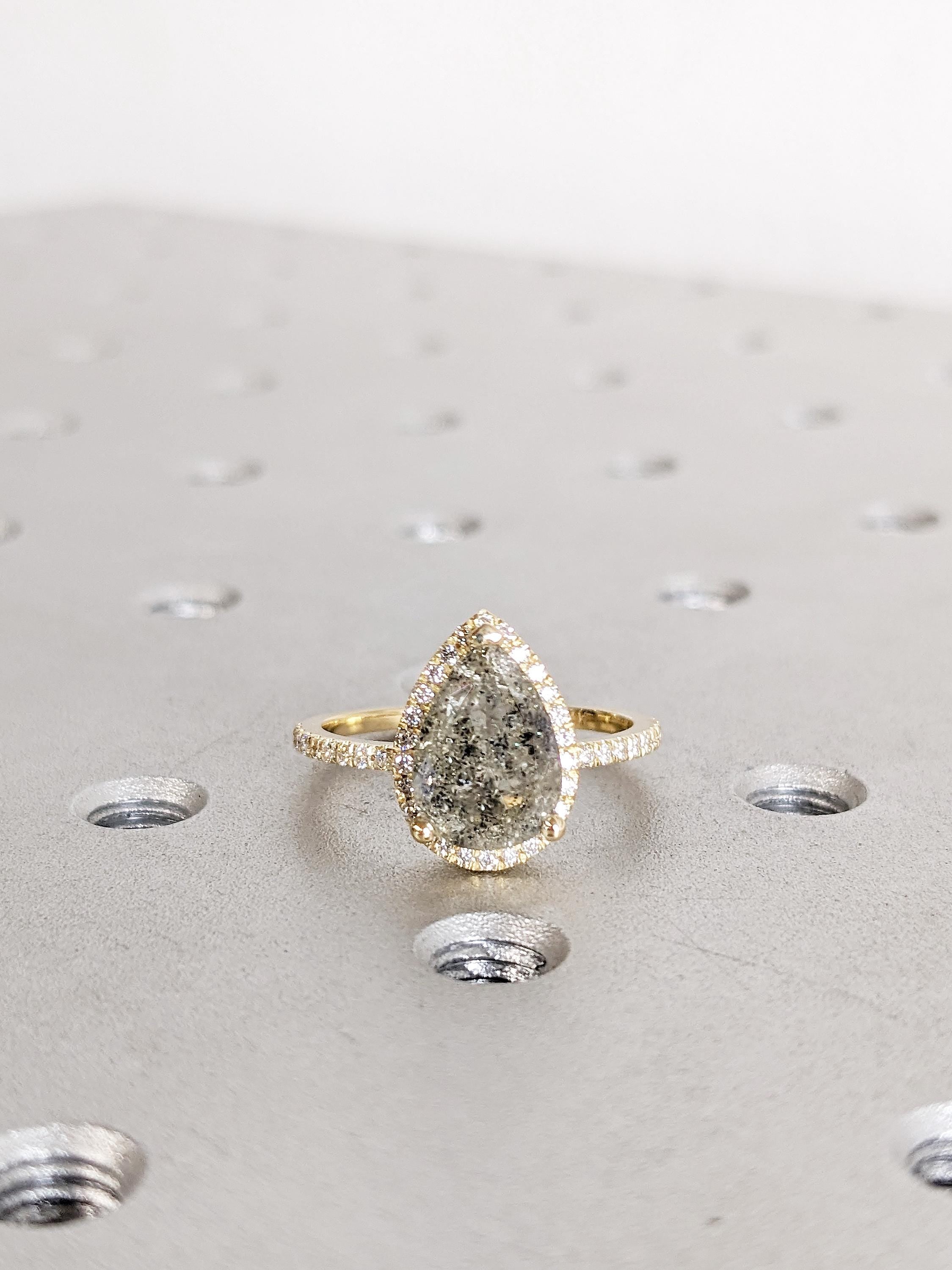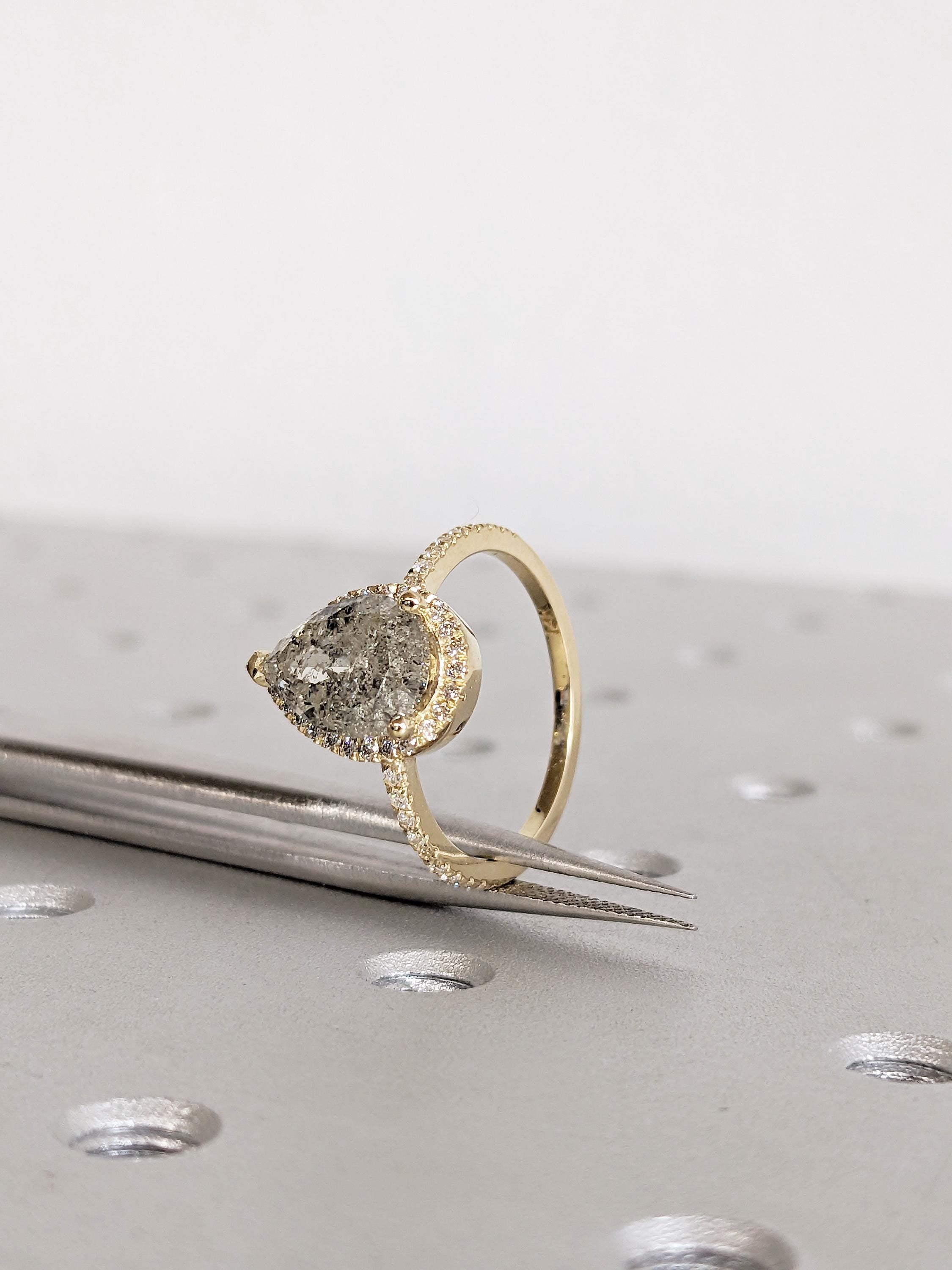 This Salt and Pepper Diamond engagement ring features a pear-shaped Salt and Pepper Diamond in a prong setting, surrounded by a halo of Natural Diamond, Lab Grown Diamond, or Moissanite side stones, with additional half eternity paves along the band. Its distinctive pattern and refined sparkle make it an ideal choice for engagements, anniversaries, or as a unique and meaningful gift