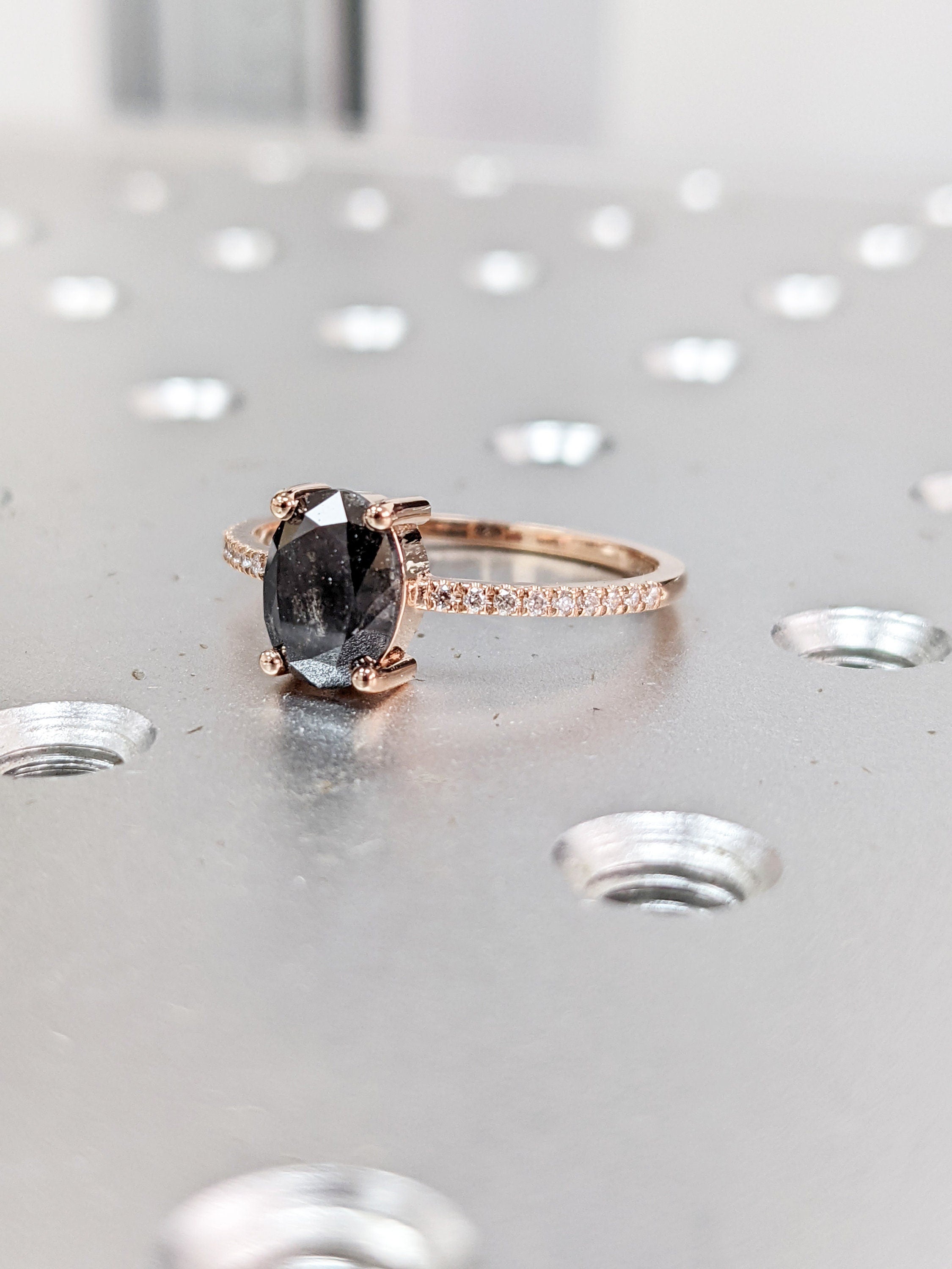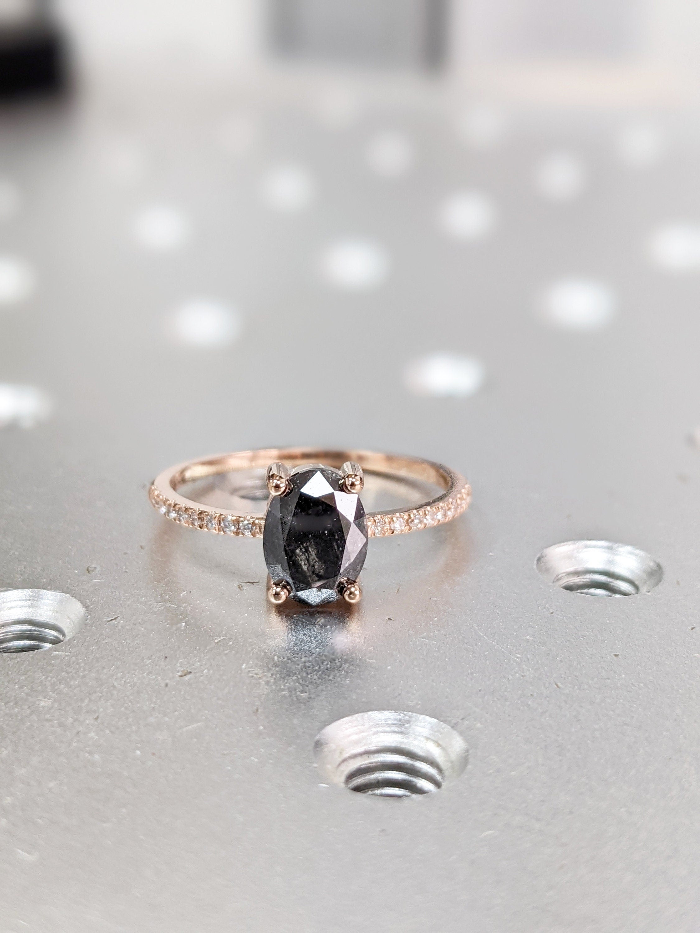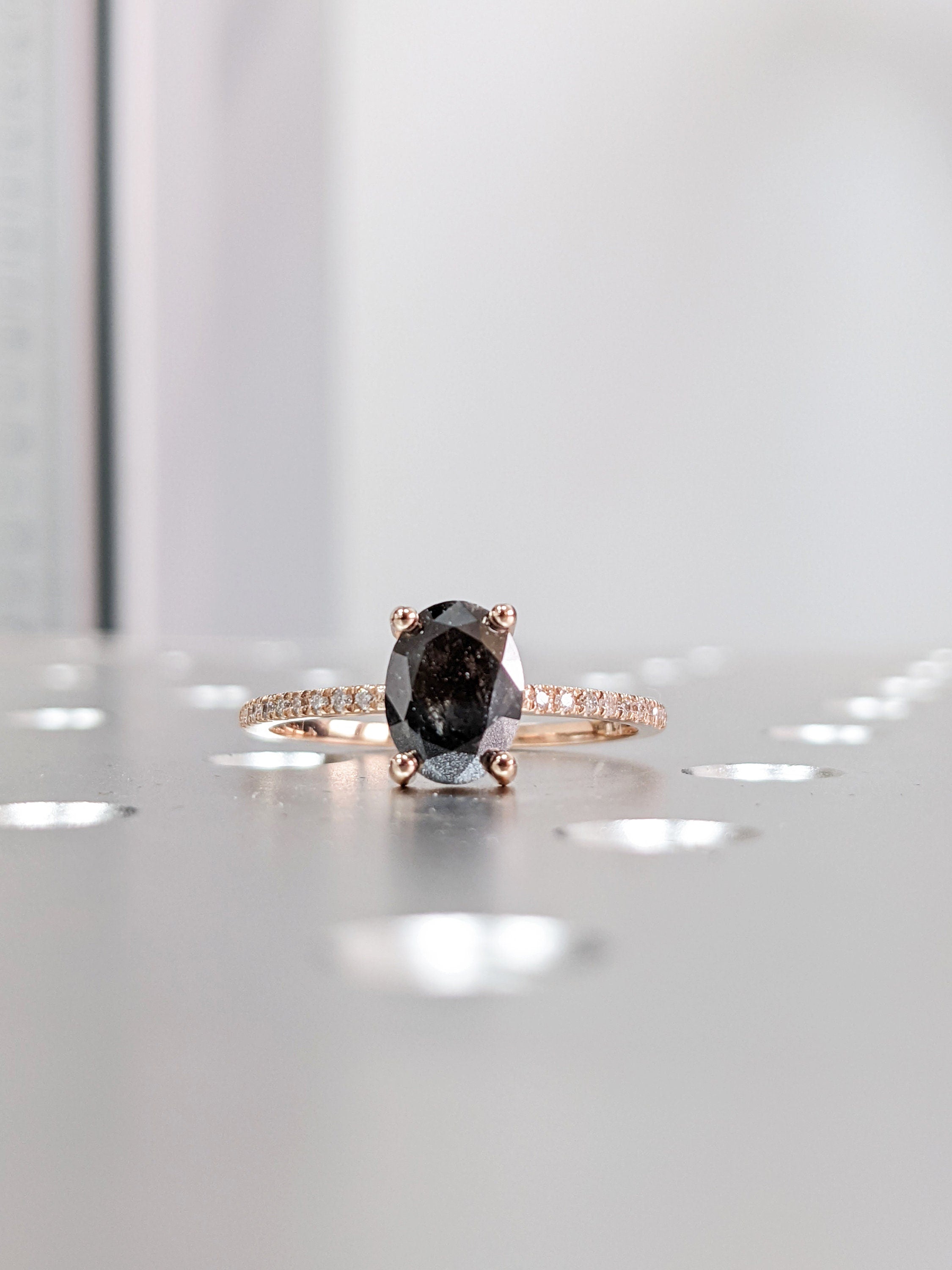 1920's Raw Salt and Pepper Diamond, Oval Diamond Ring, Unique Engagement Bridal Set, Black, Gray Oval, 14k Yellow, Rose, or White Gold