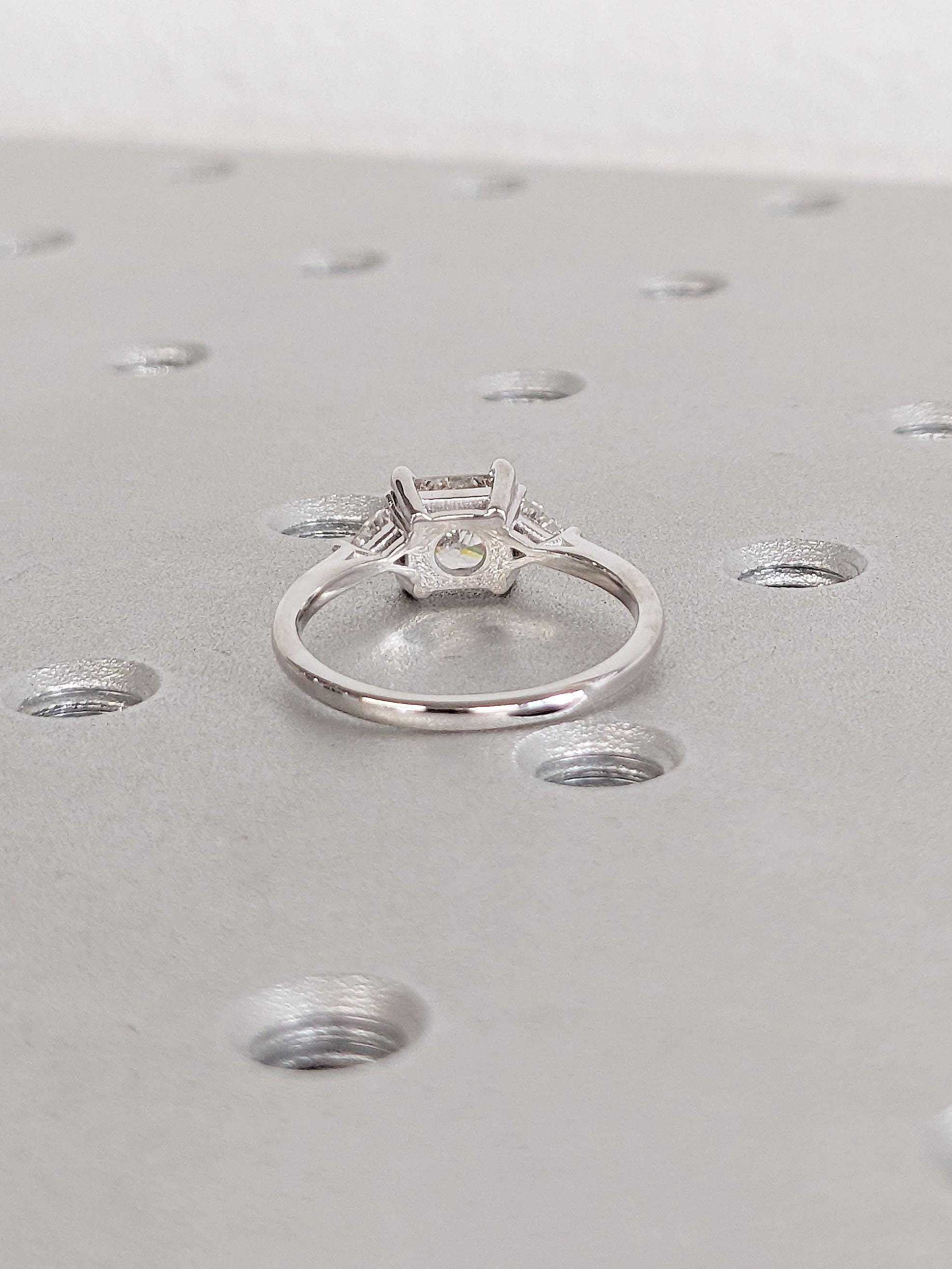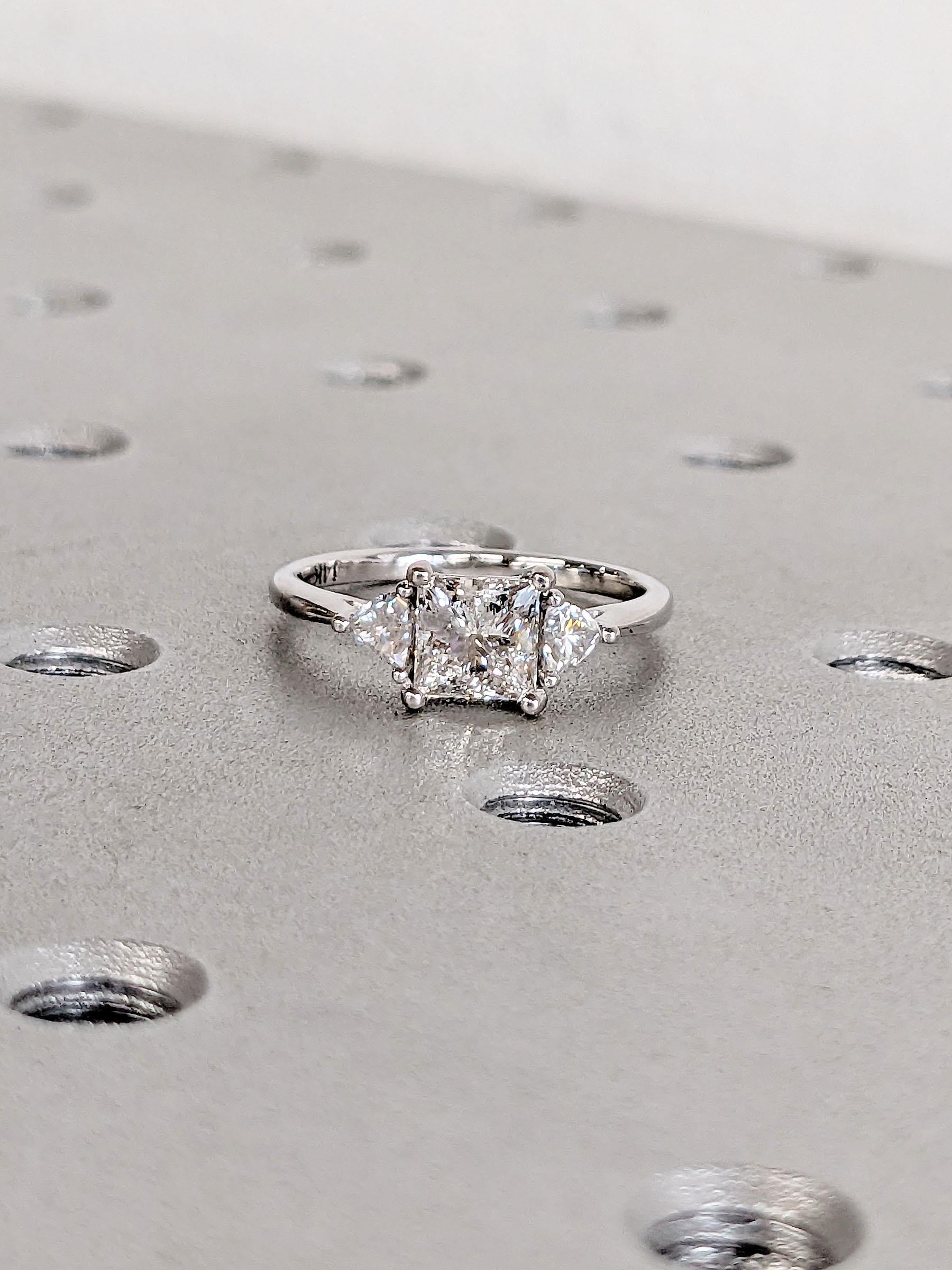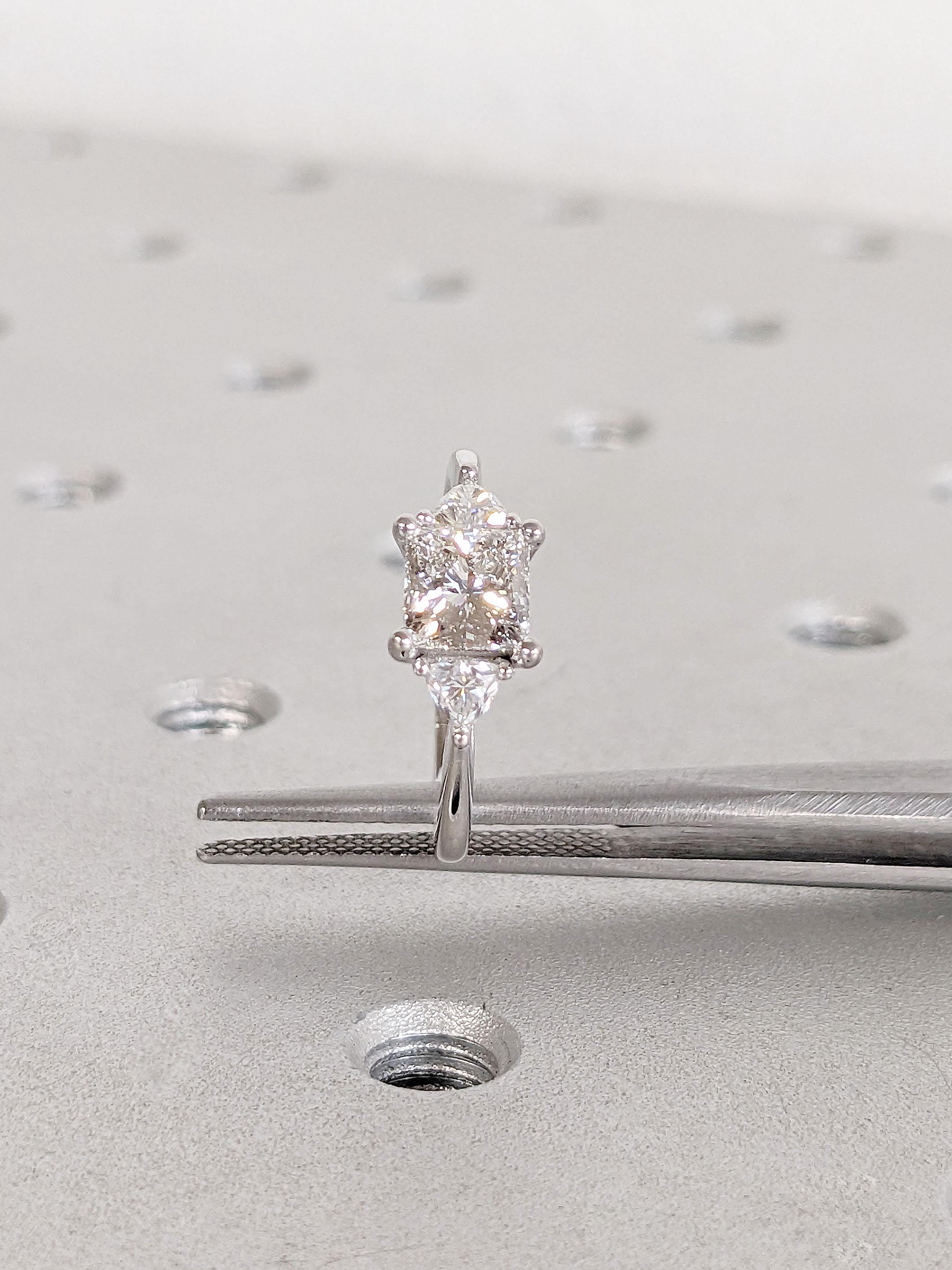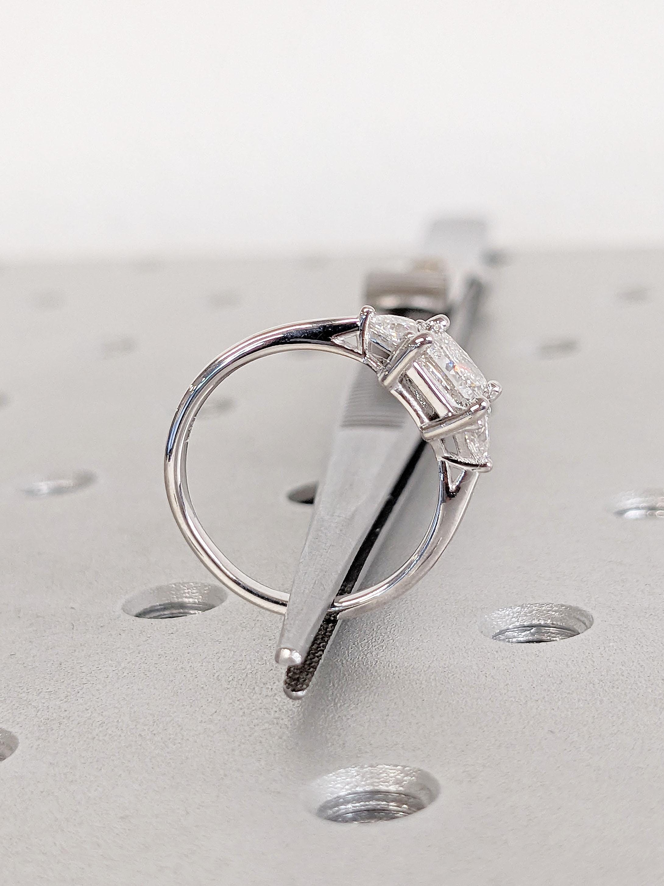 An elegant three stone ring, features a princess cut Lab Diamond center, with a contemporary basket setting supported by an open gallery and framed with triangle shaped natural diamond or moissanite accents. A slightly tapered band give this ring a slender silhoutte.