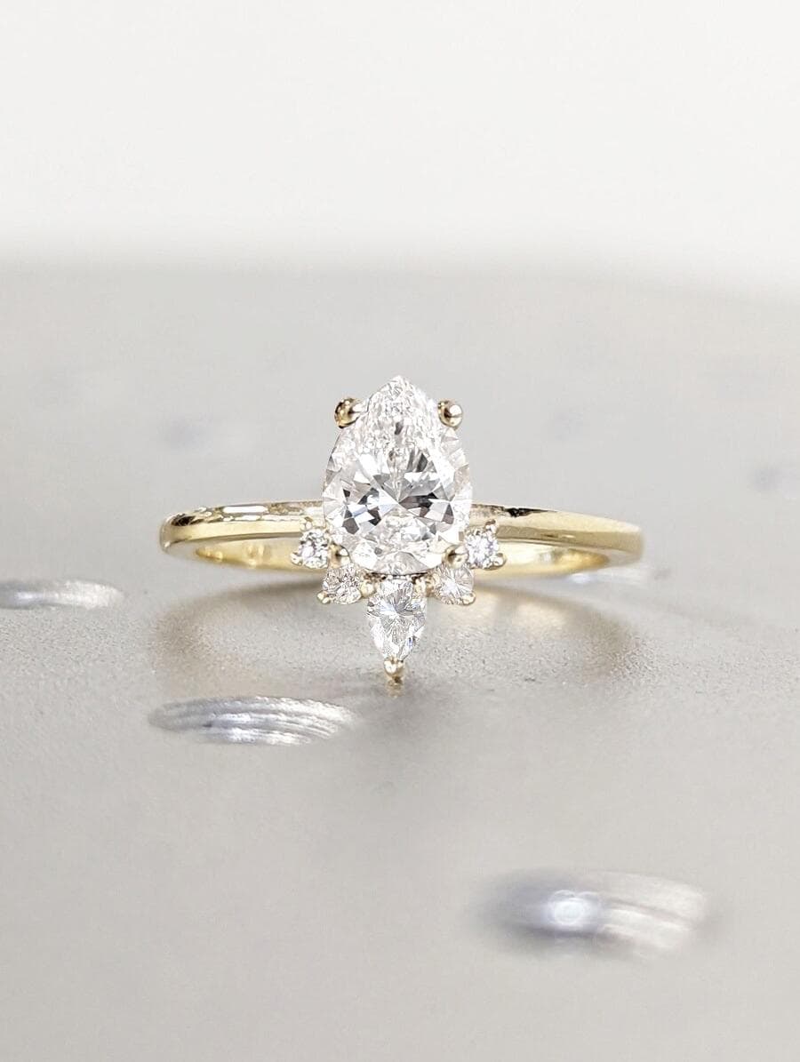 1ct, 2 Carat VVS Moissanite Unique Proposal Ring | Solid Yellow Gold Engagement Ring for Her | Pear and Round cut Ring | Art Deco Ring Gift