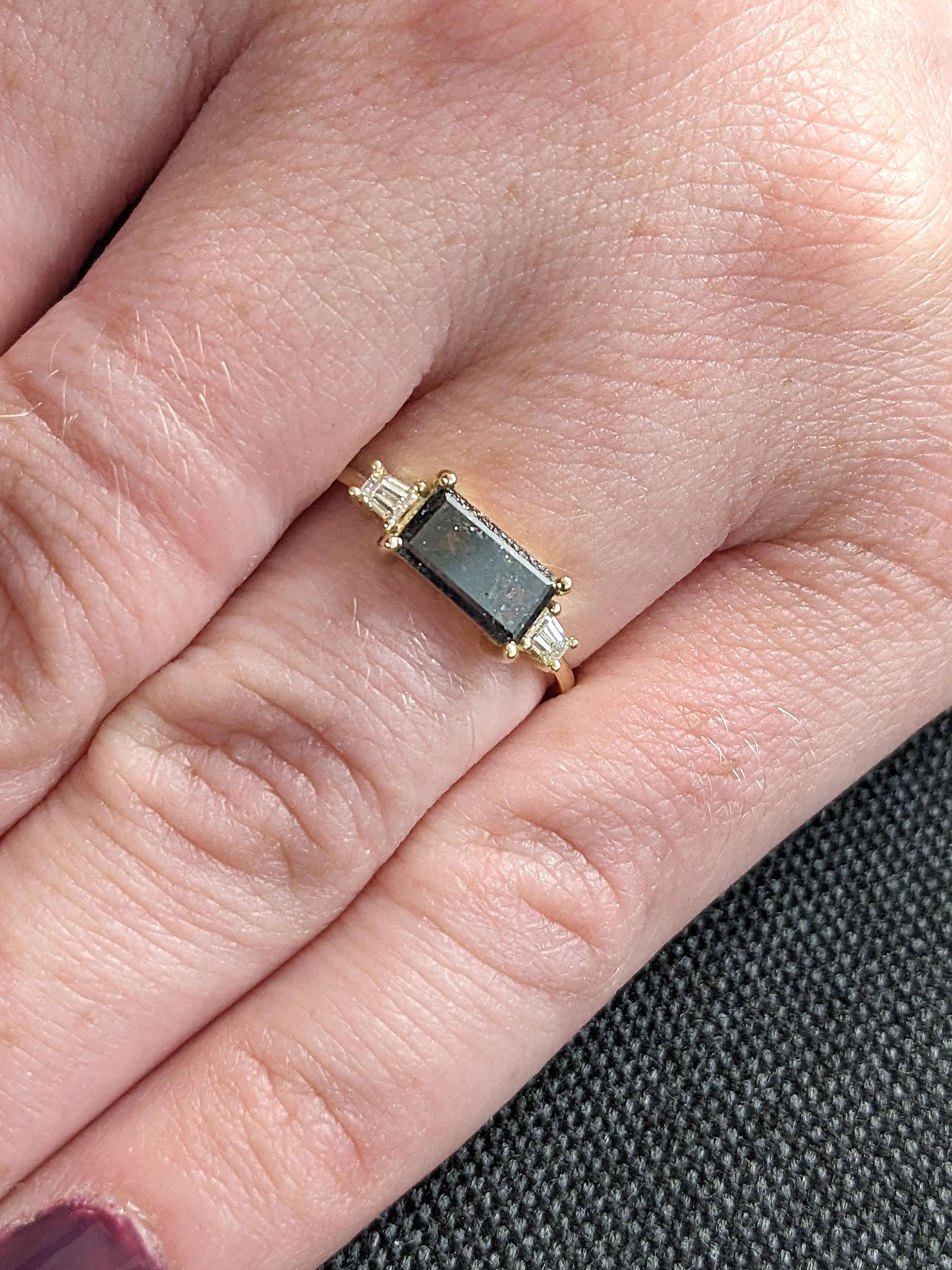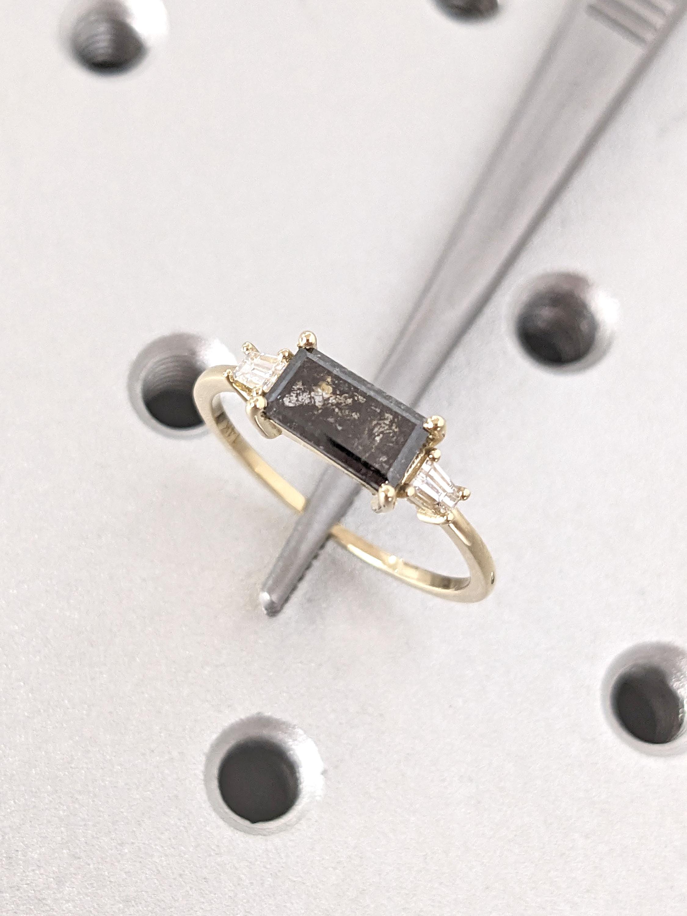 Unearth a sense of nostalgia with our vintage-inspired ring. The slender band showcases a captivating baguette cut Salt and Pepper Diamond, framed by two tapered baguette cut side stones, creating a timeless and elegant piece.