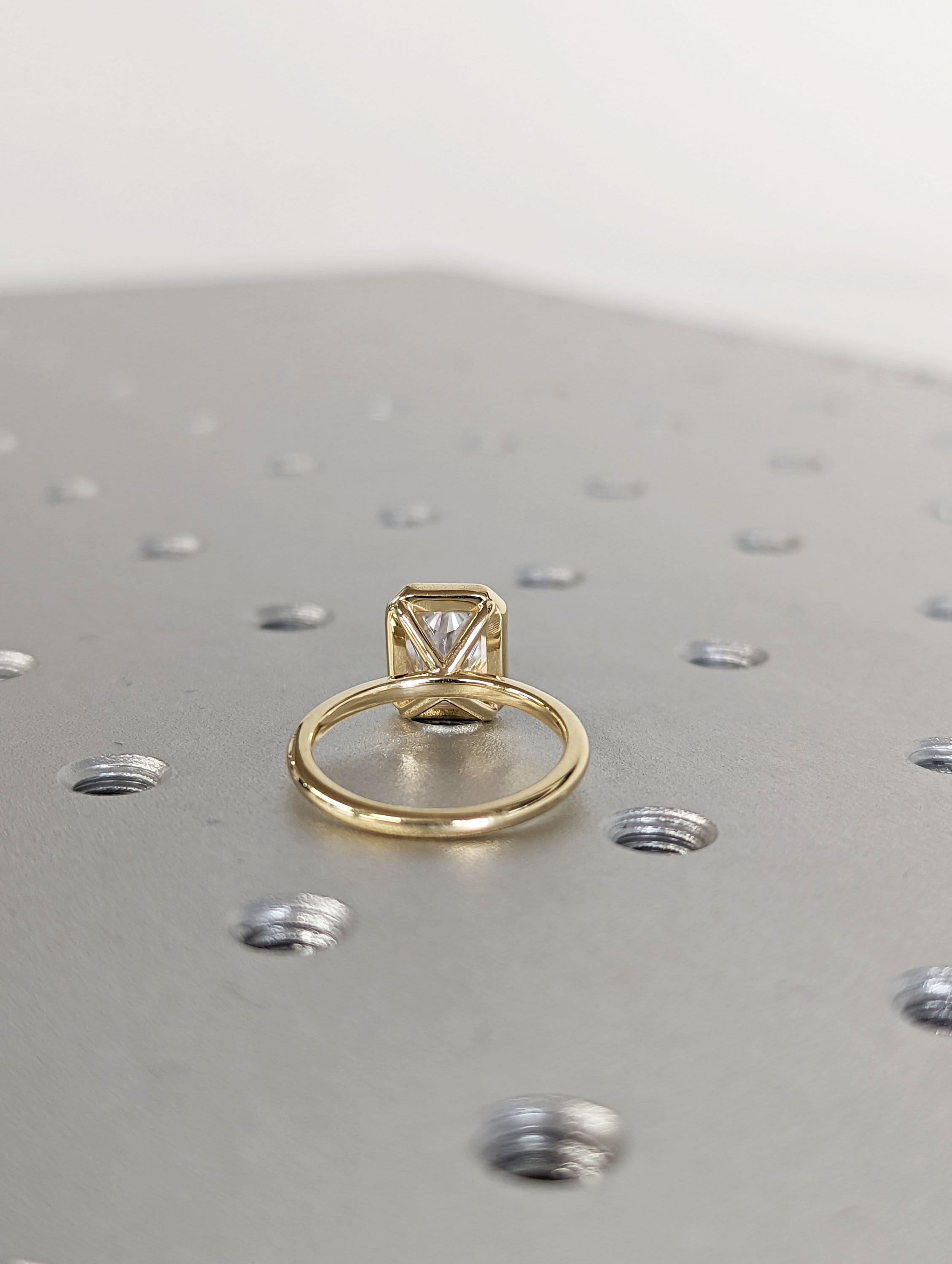 Understated and elegant, this sophisticated engagement ring features a radiant cut Moissanite focal stone in a bezel setting atop a delicate rounded band.
