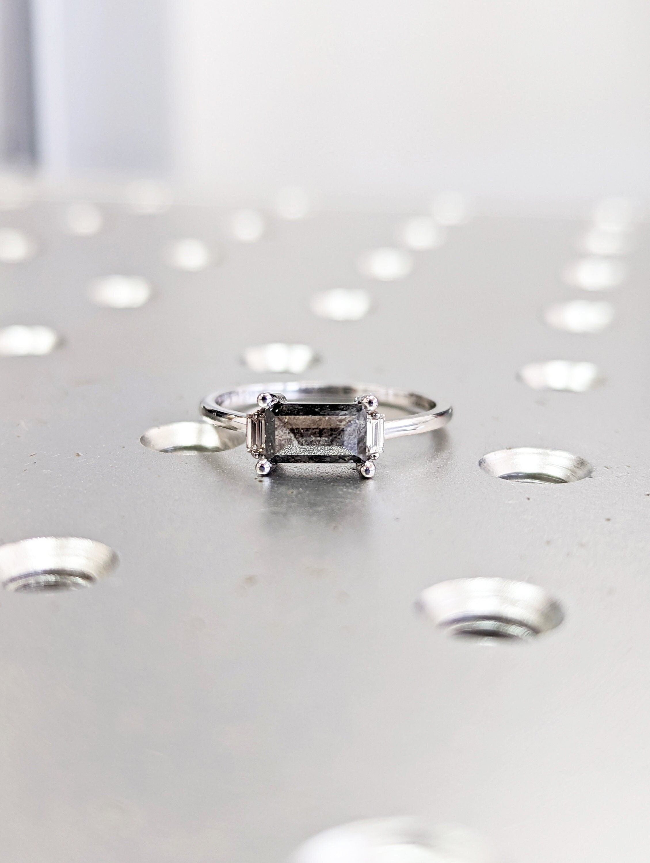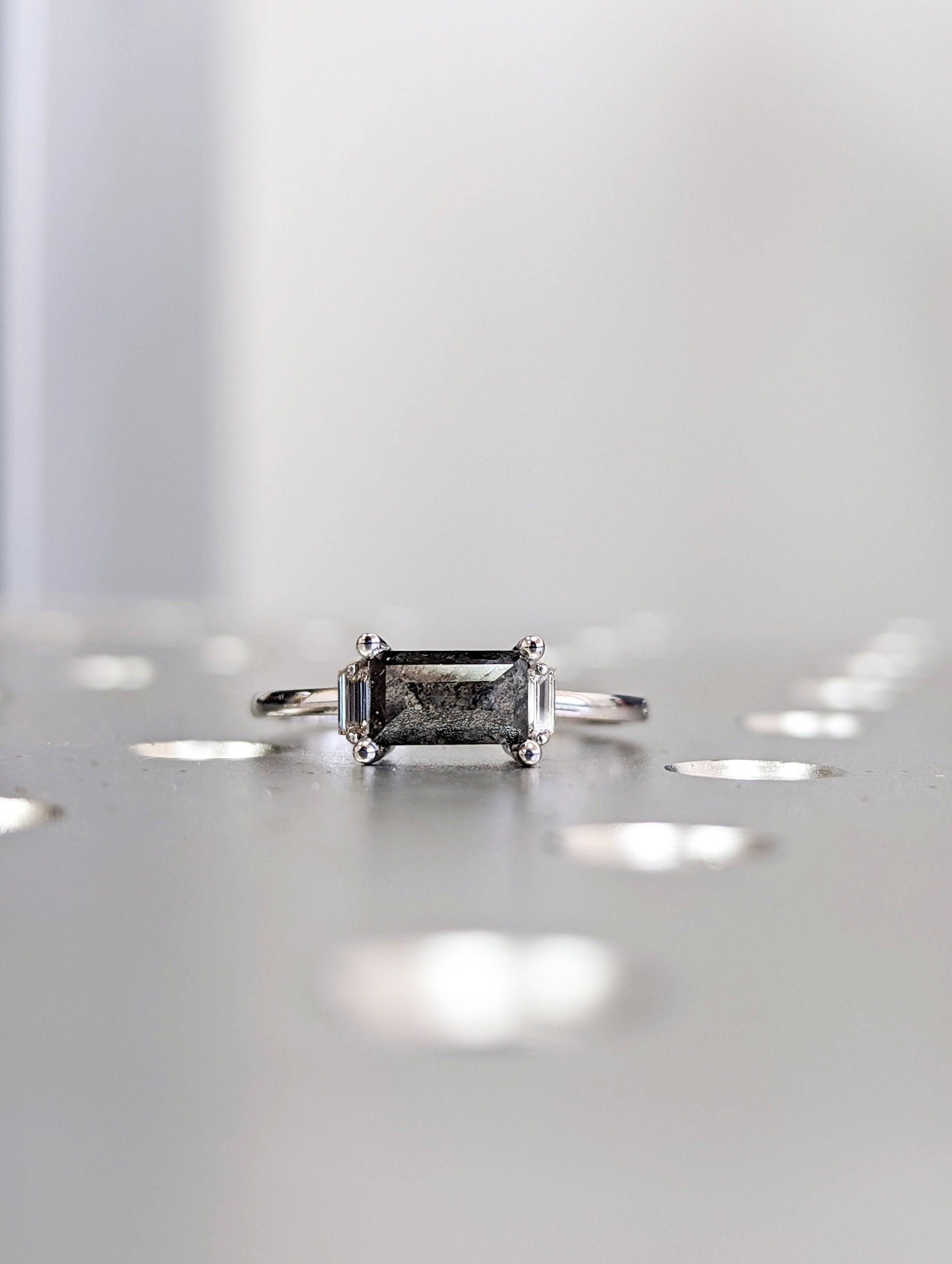 A stunningly beautiful vintage inspired design, petite band with a baguette cut Salt & Pepper diamond, adorned by 2 beautiful baguettes to contrast the center diamond.