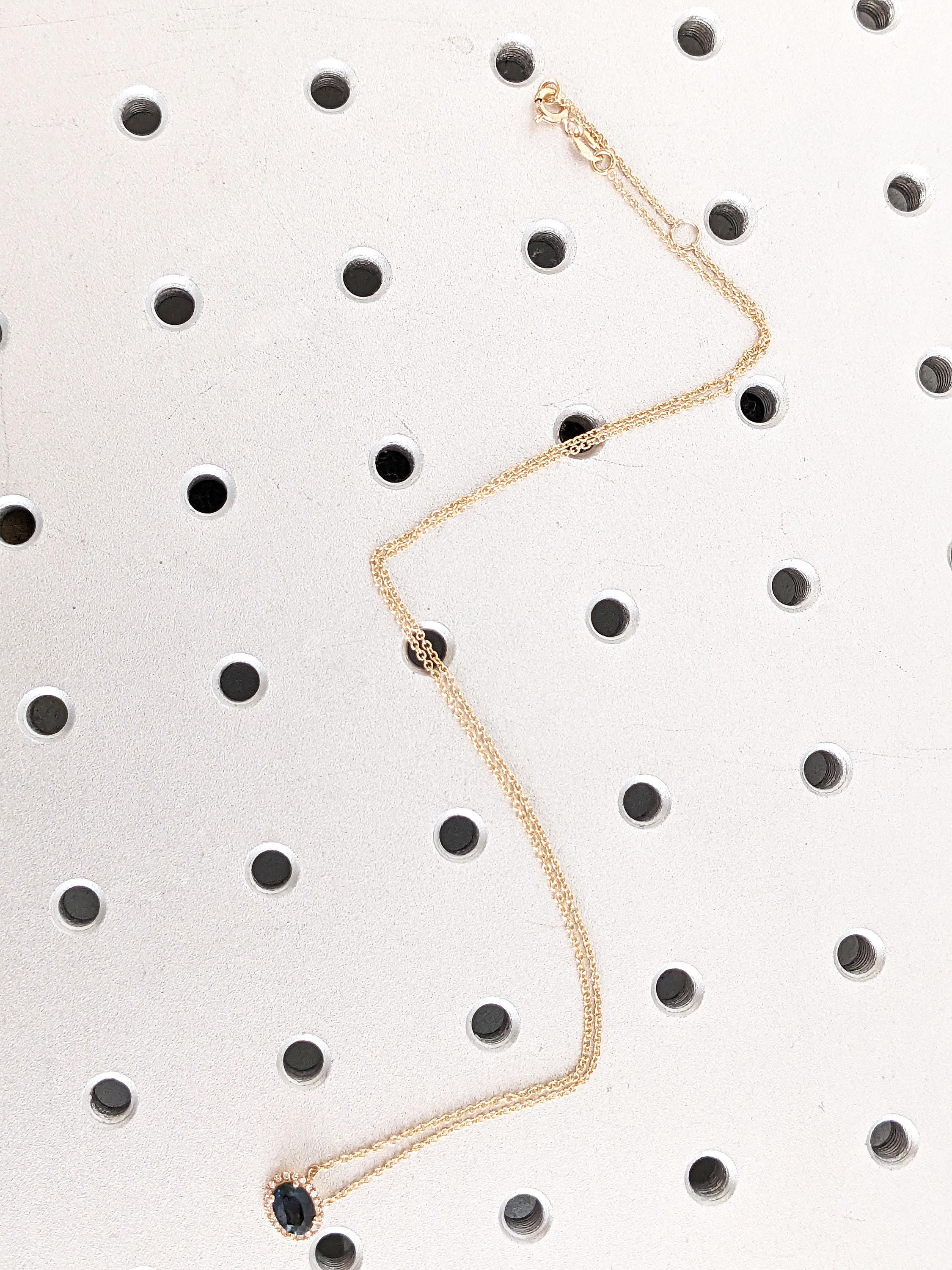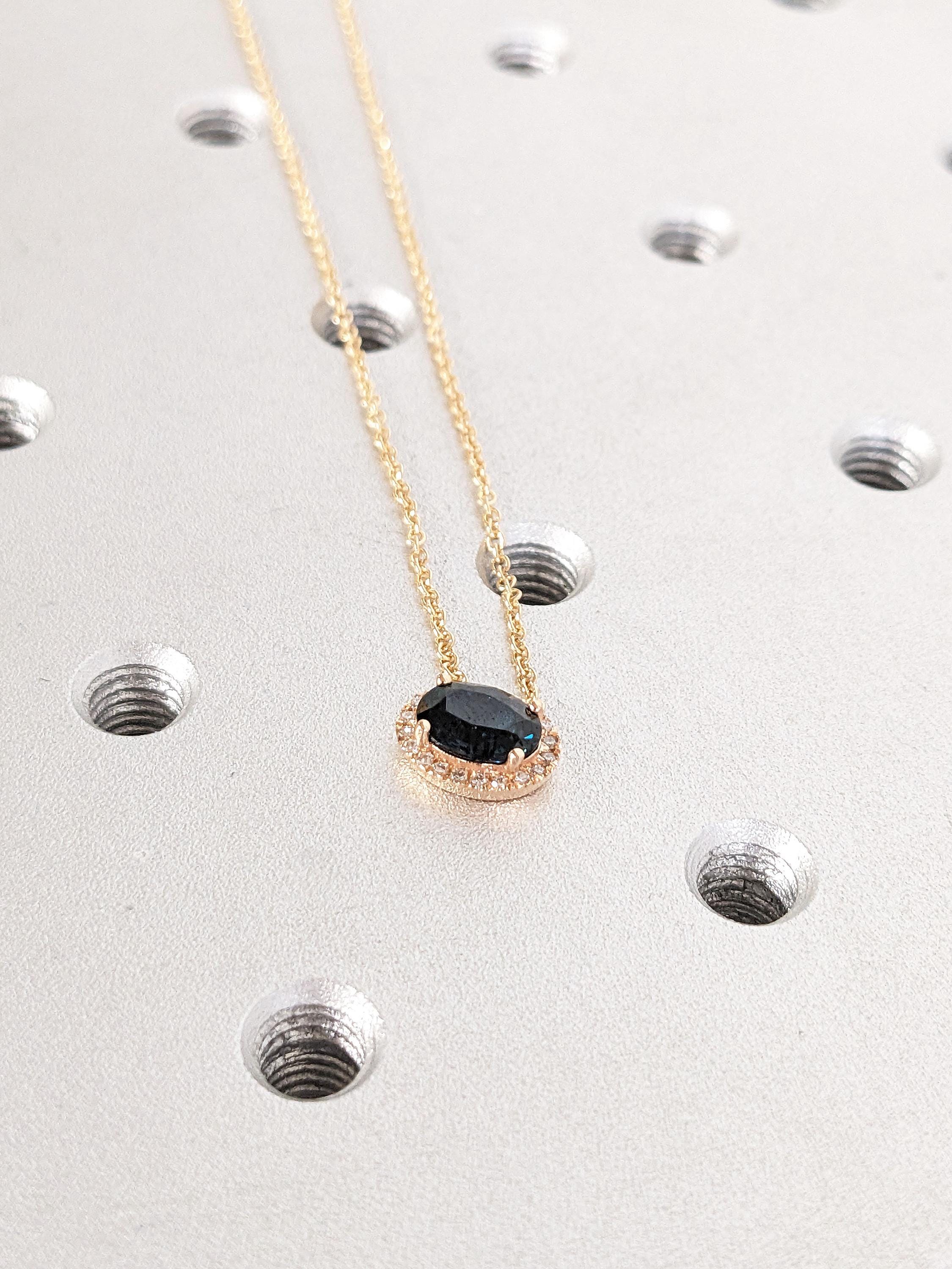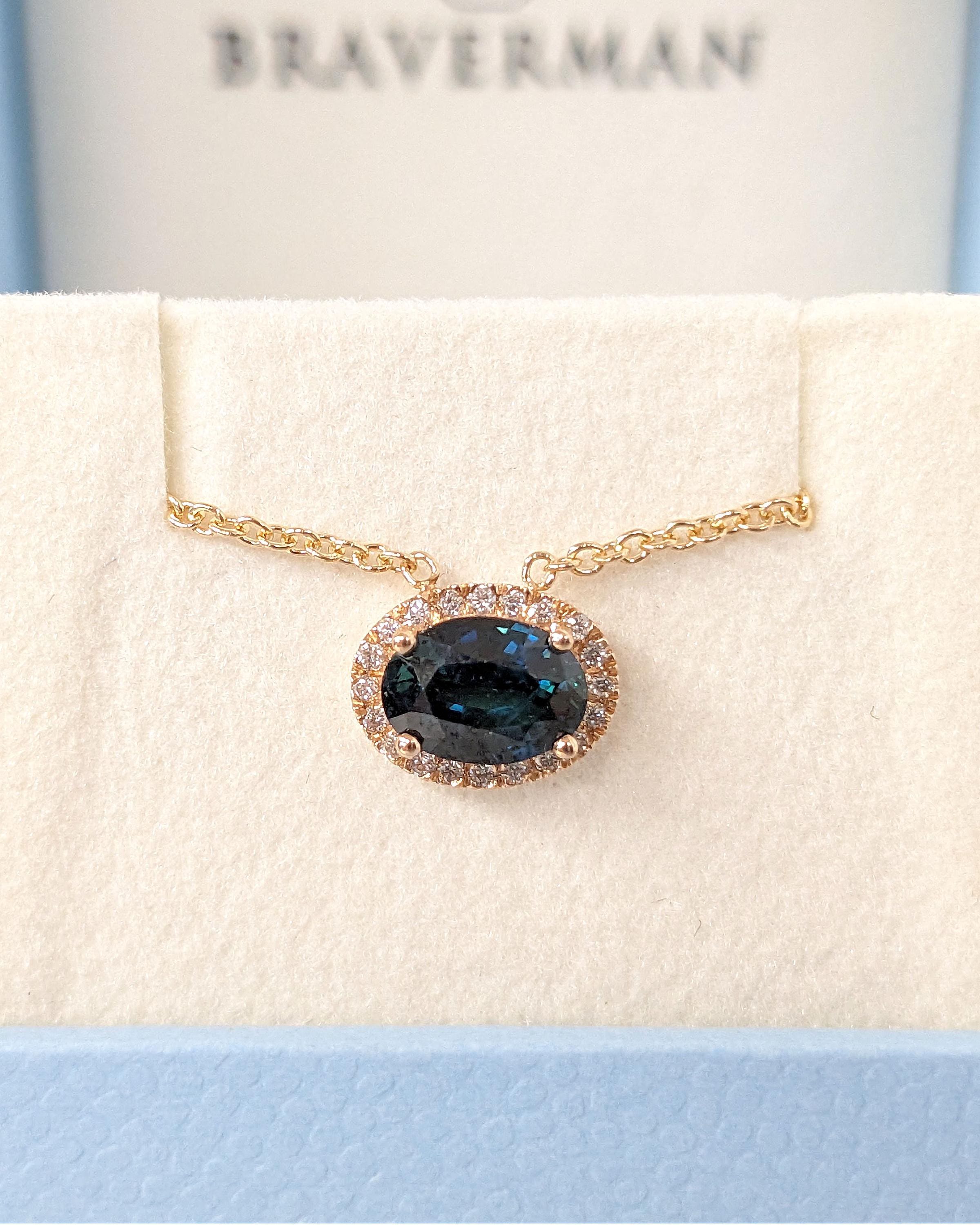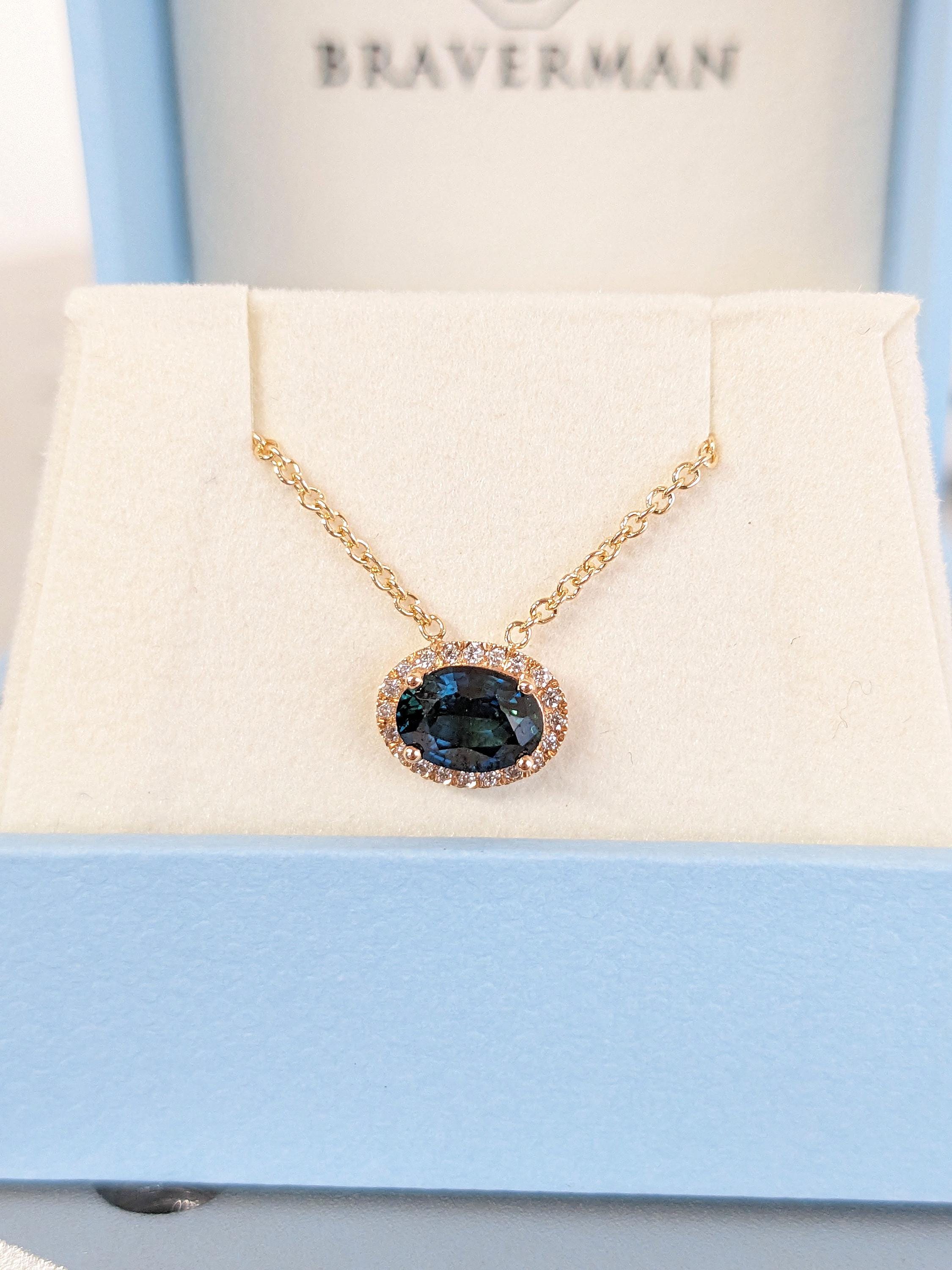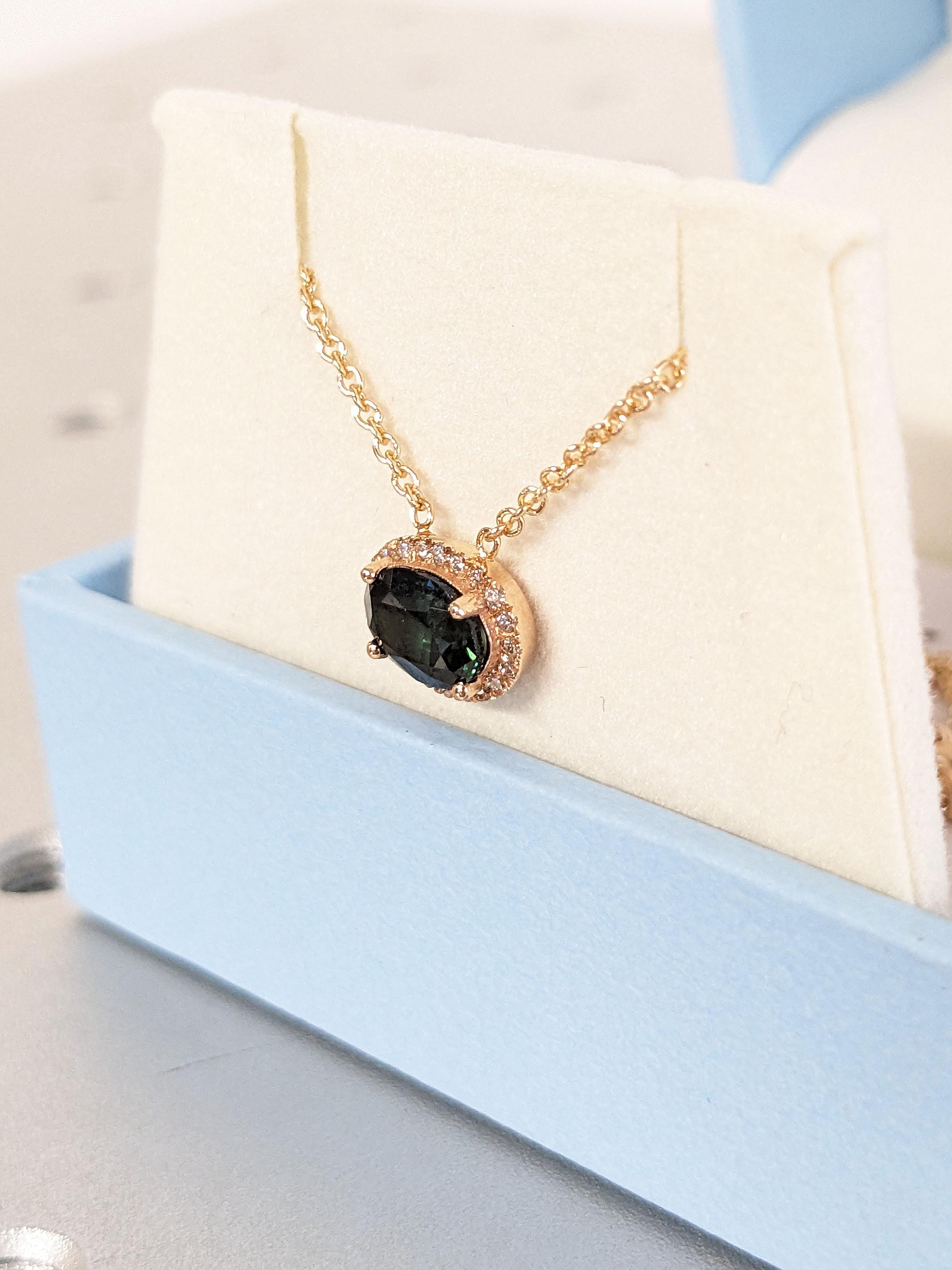 1ct Natural Blue Green Sapphire and Diamond Halo Pendant | 18k Rose Gold Classic Sapphire Necklace for Her, East West Oval Solitaire Pendant