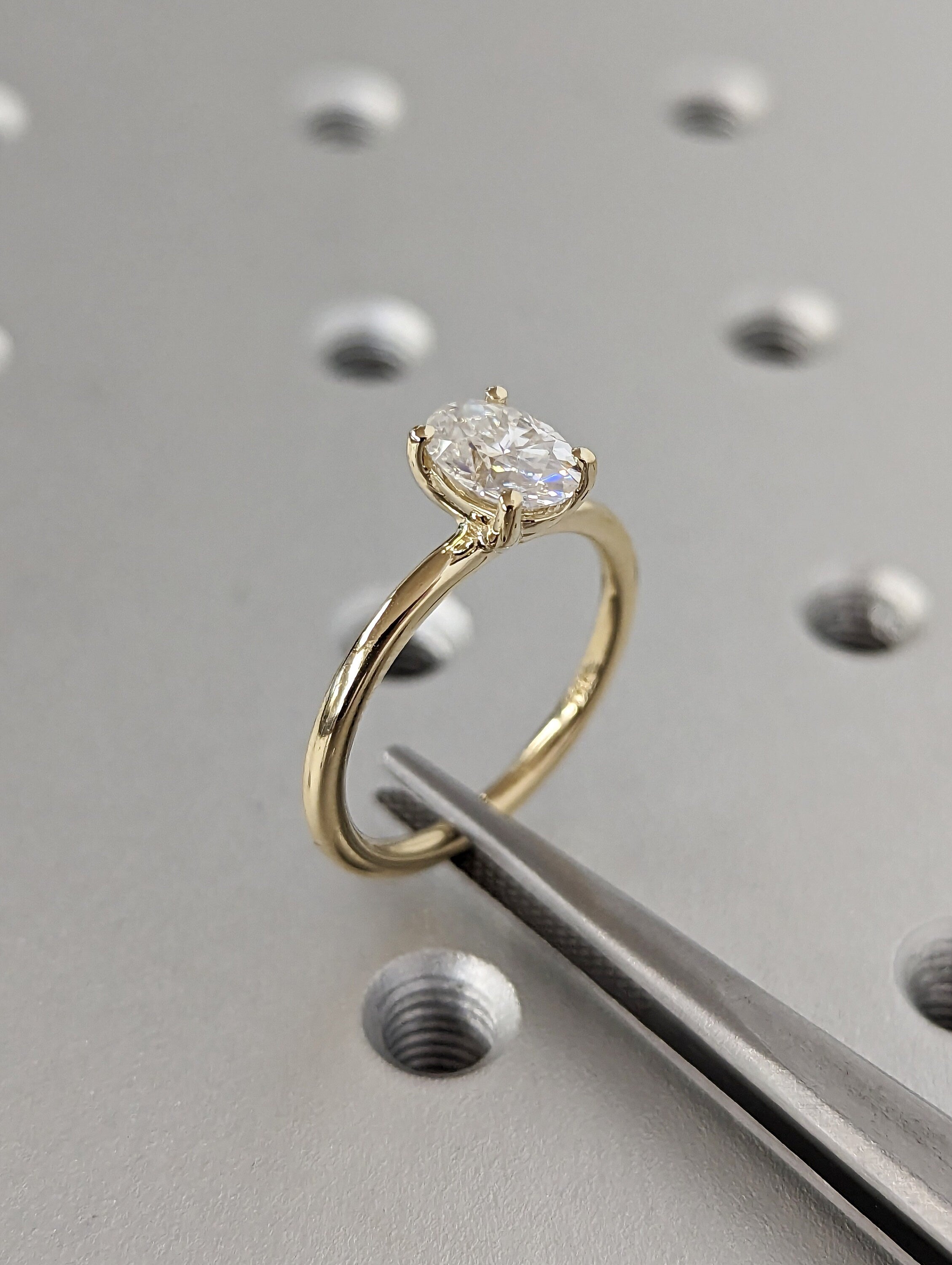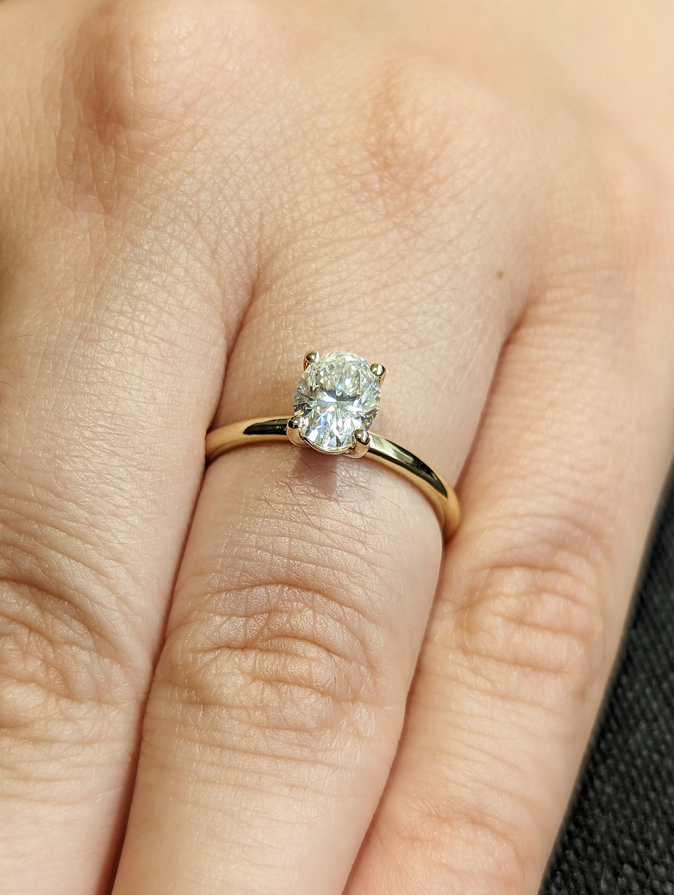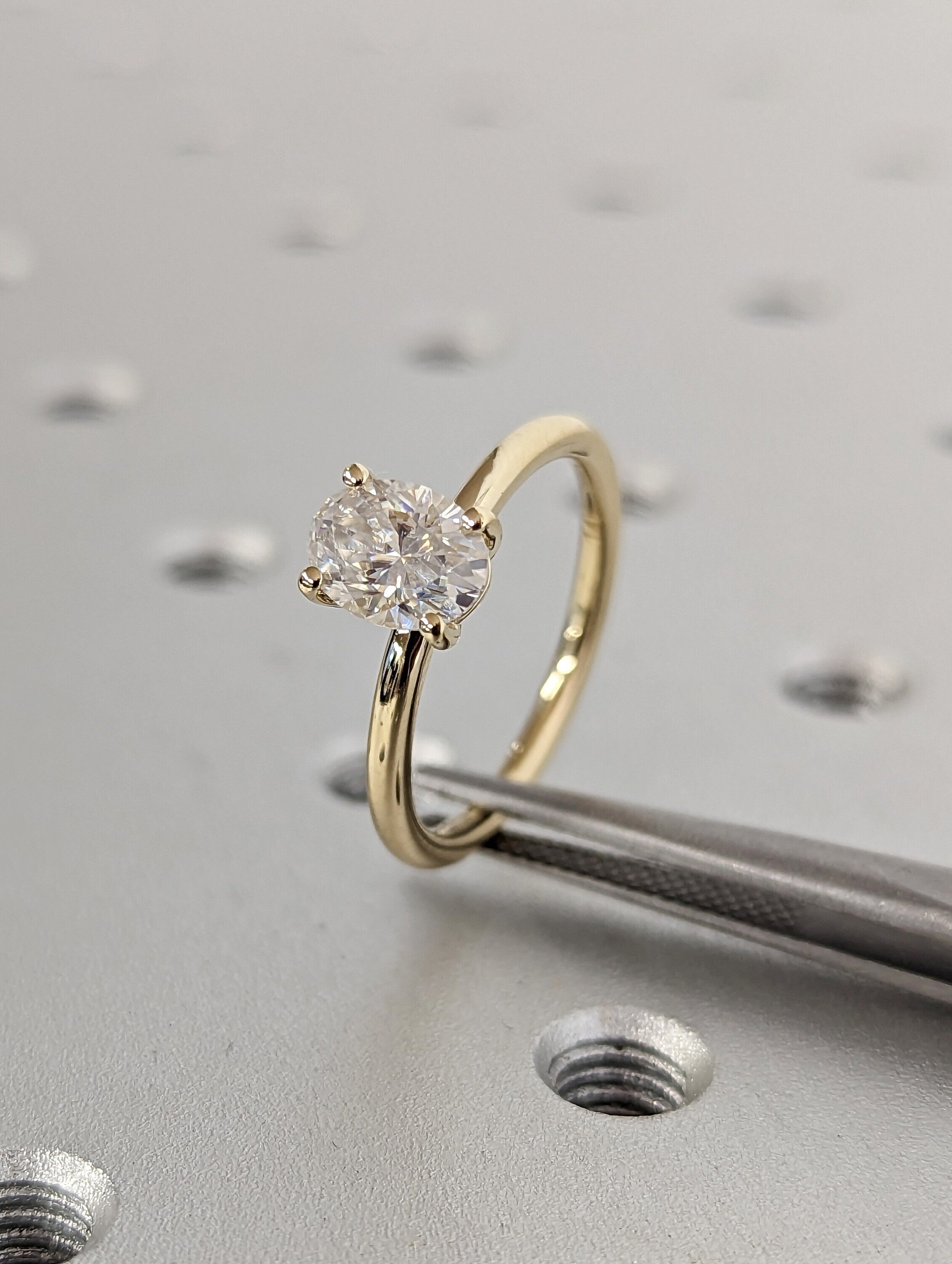An all time classic, timeless solitaire ring with a ~1.9mm band, making it a beautiful rounded band, keeping the focus on the center oval cut moissanite :)