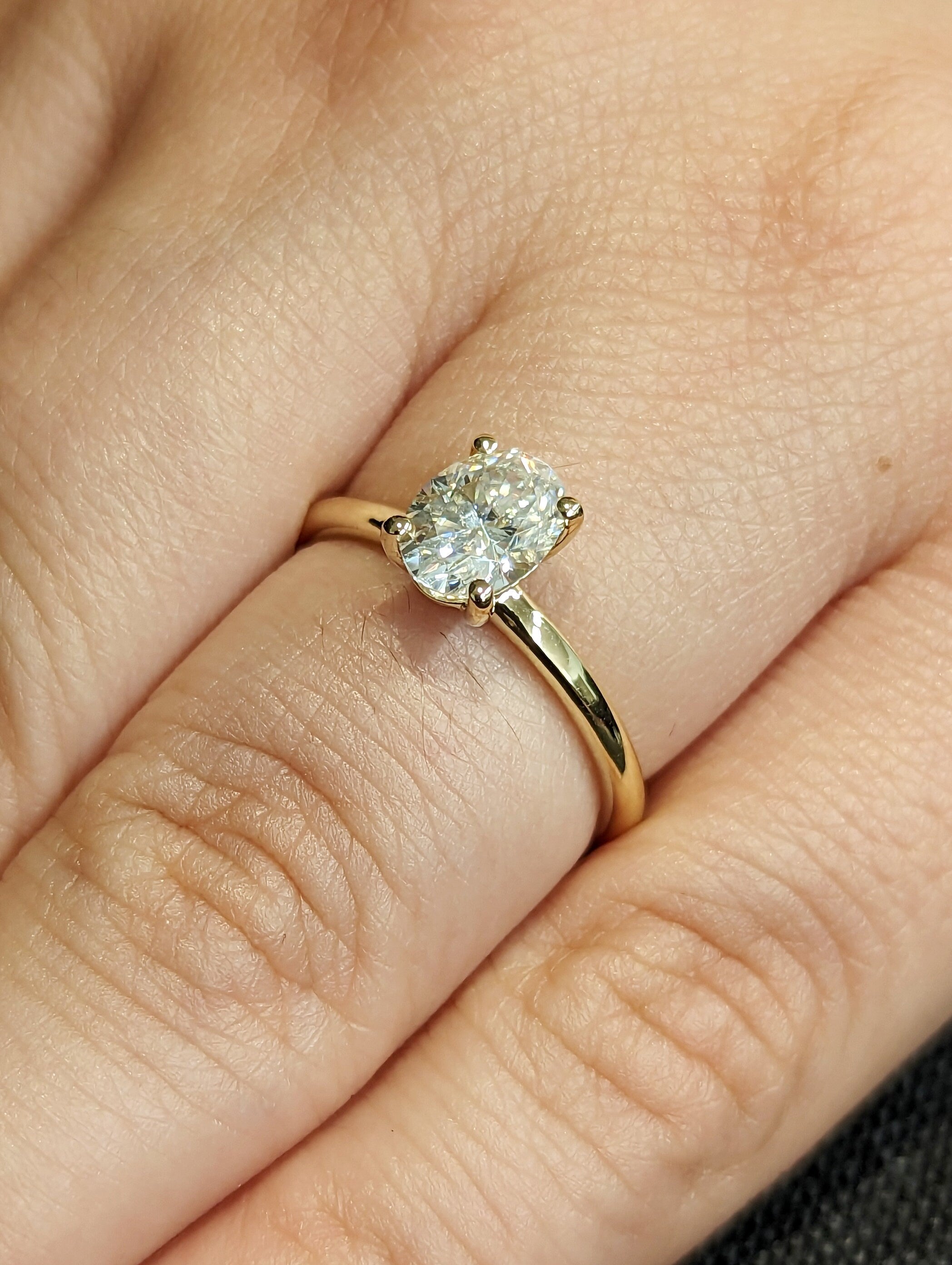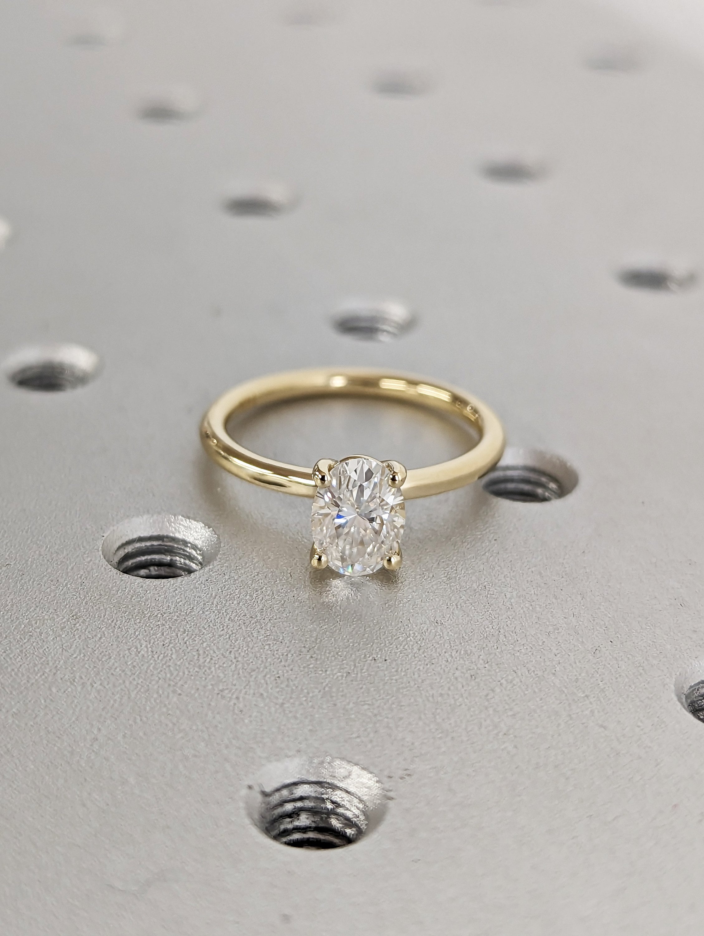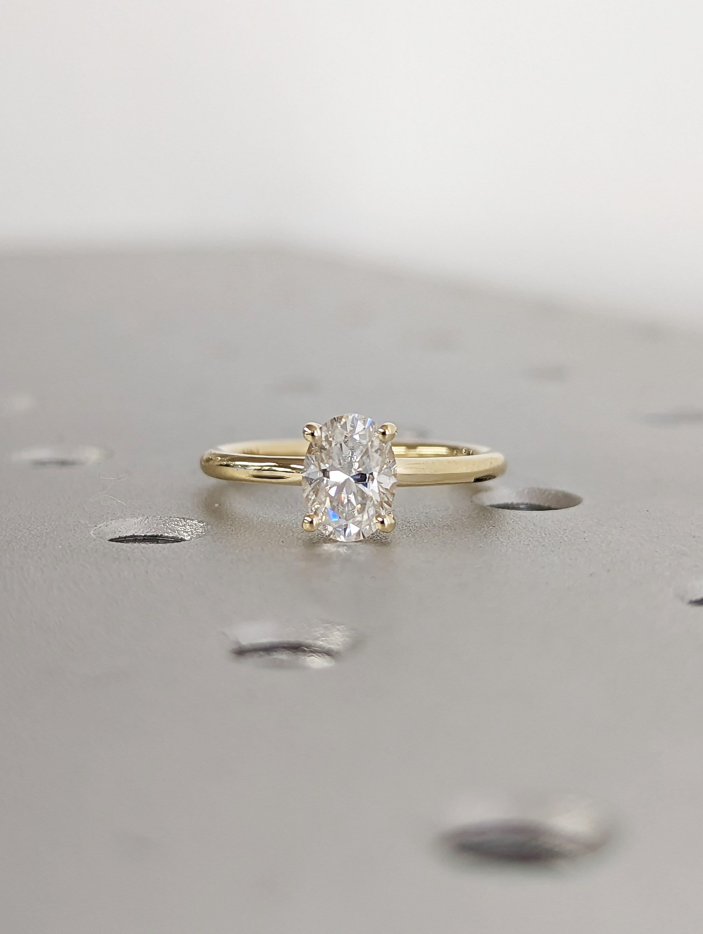 An all time classic, timeless solitaire ring with a ~1.9mm band, making it a beautiful rounded band, keeping the focus on the center oval cut moissanite :)