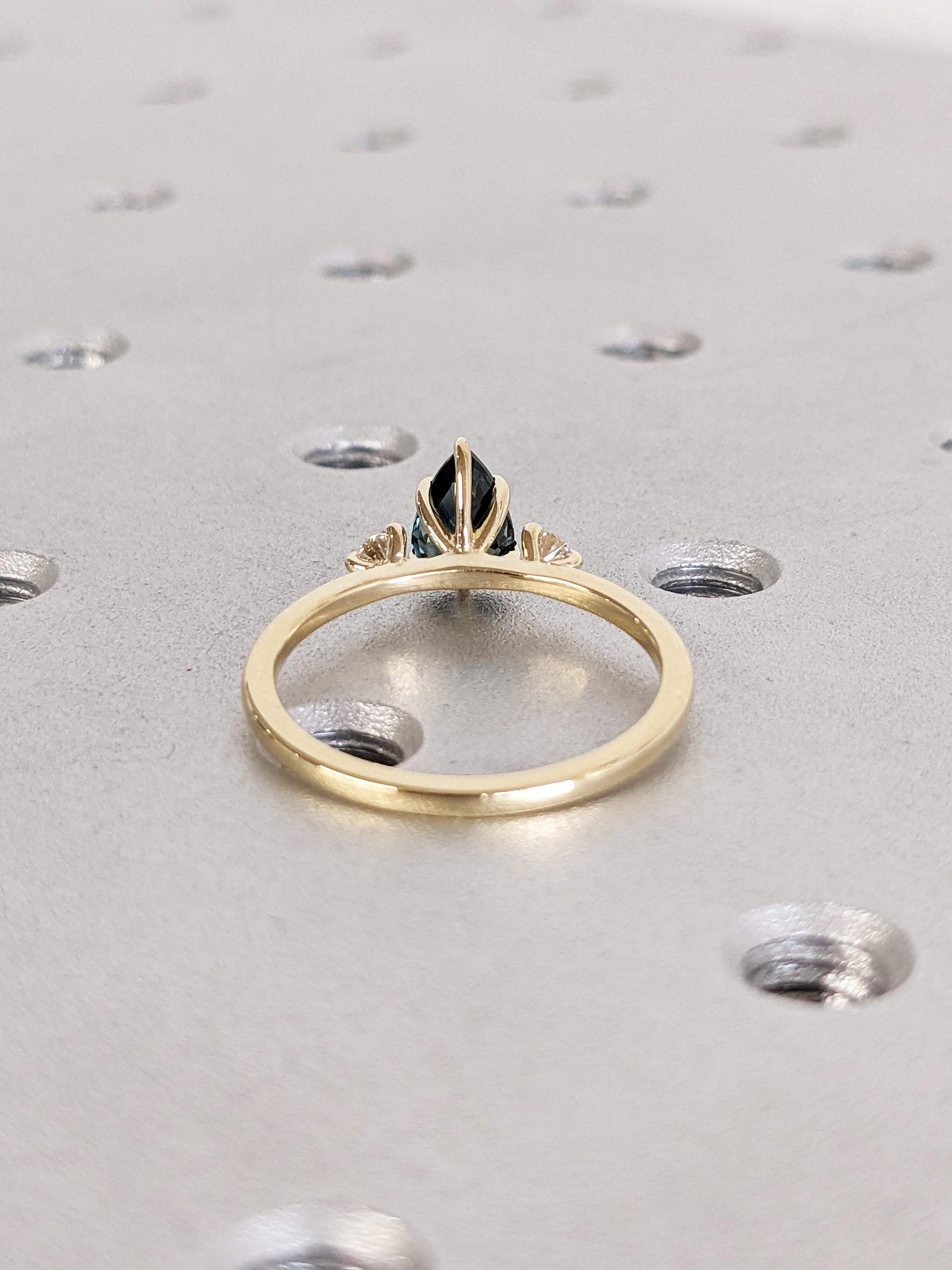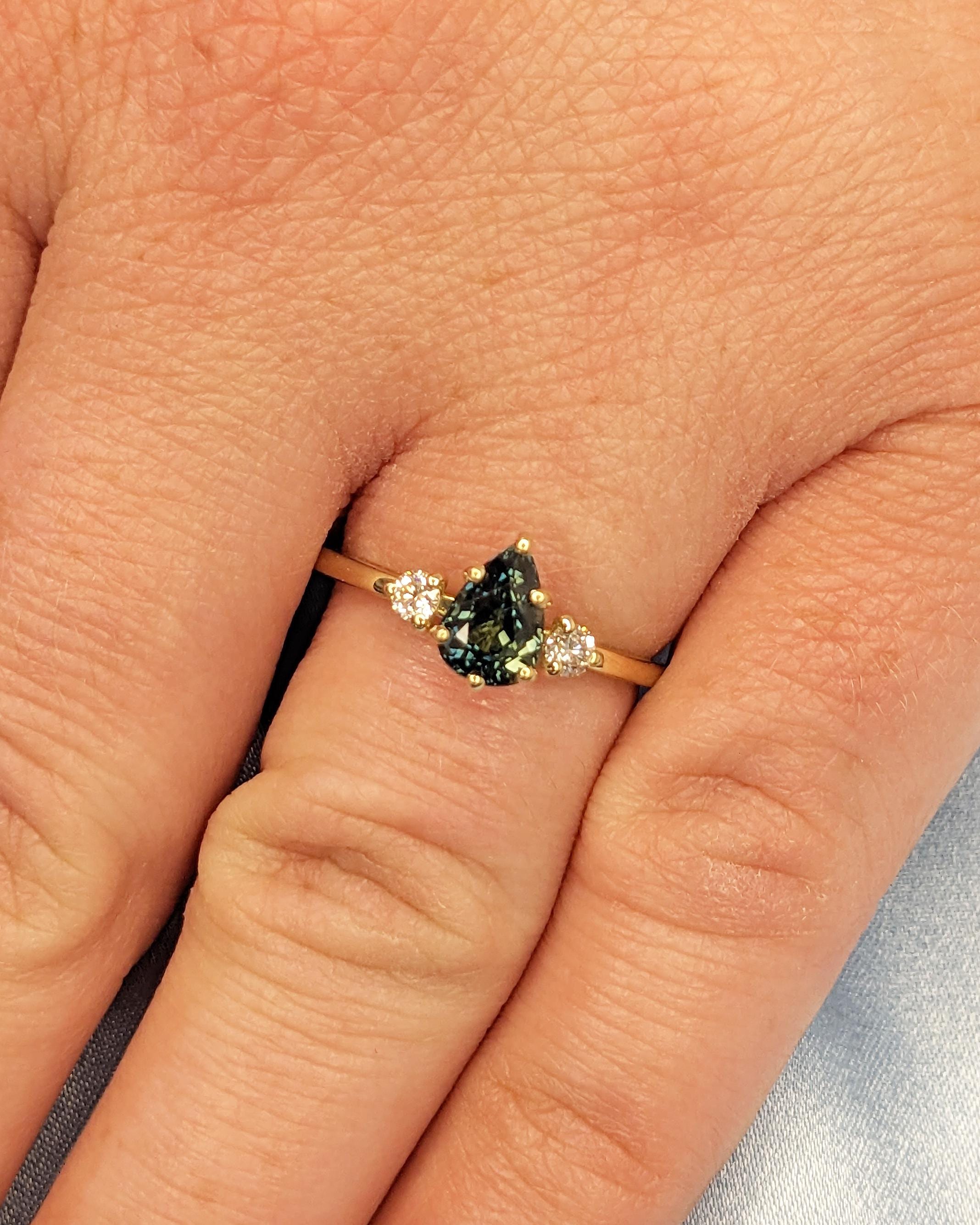 Declare your love with this sophisticated engagement ring, featuring three stones artfully cradled by intertwined prongs. The star of the show is the center Peacock Sapphire, radiating a captivating green-blue hue, surrounded by Natural Diamond, Lab Diamond and Moissanite accents and anchored by a slim band for a modern and timeless expression of commitment.