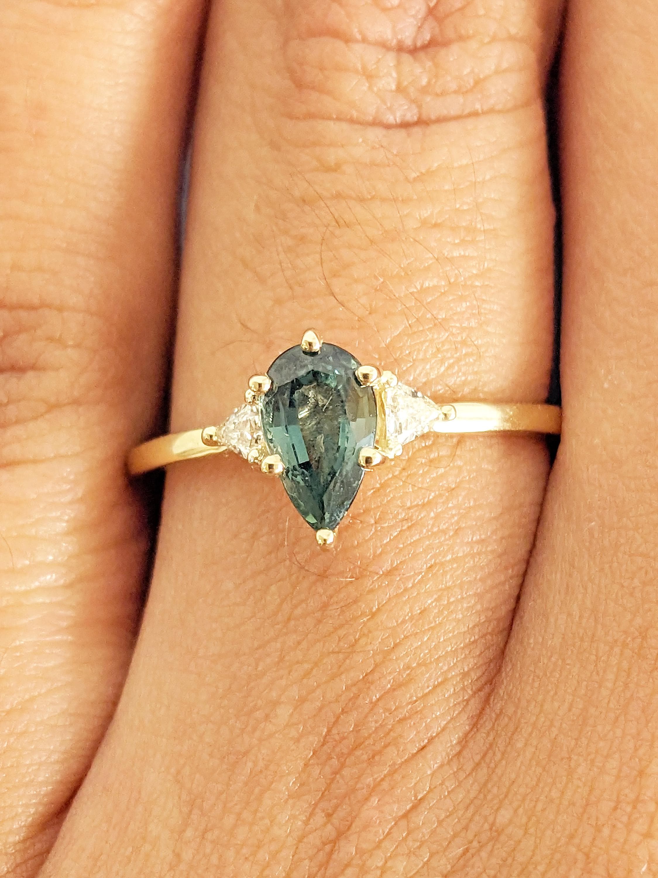 Three stones are elegantly grasped above an open gallery, with an alluring blue/green shade pear cut Peacock Sapphire taking centerstage. Accented by triangle cut Natural Diamonds or Moissanites on a thin band, this mesmerizing finely crafted piece is a great choice to elevate your style for any occasion.