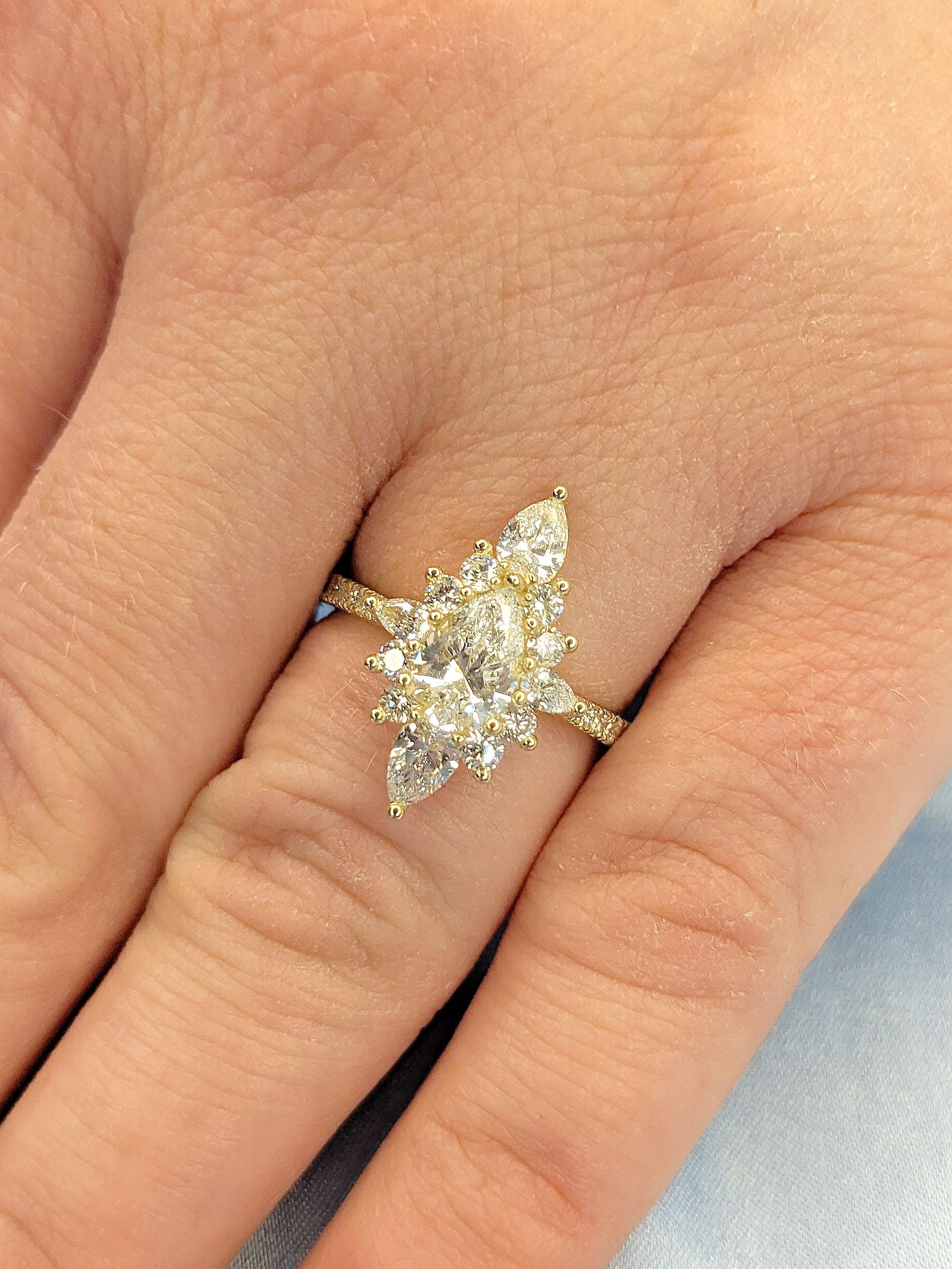 A fine handmade jewelry statement ring, features a pear cut Moissanite center. Accented by clusters of pear and round cut side stones, delicately arranged in a marquise shaped halo, on a unique prong setting that resembles a lotus' vines. Set on a 2mm width half eternity band, paved with your choice of natural diamonds, lab diamonds or moissanites for that added sparkles! The perfect gift for engagement, wedding anniversary or simply to pamper that special woman in your life.
