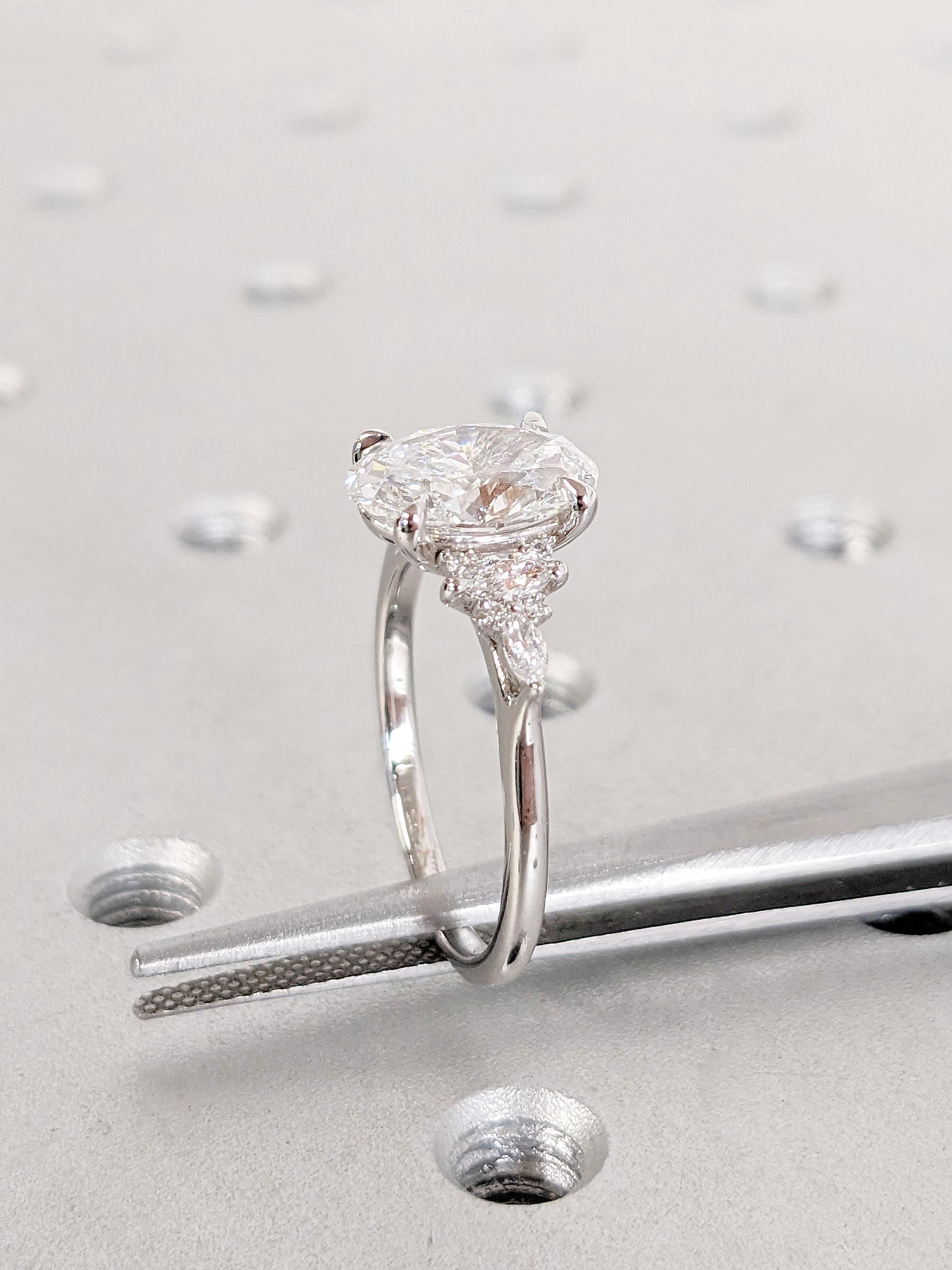 A dazzling handmade ring, features an oval cut Lab Diamond focal stone, set on classic talon prong setting on a dainty band of 1.8mm width. Accented by clusters of round and marquise cut side stones, this luxurious ring sparkles brilliantly. It's the perfect statement jewelry to complement your style for any occasion.