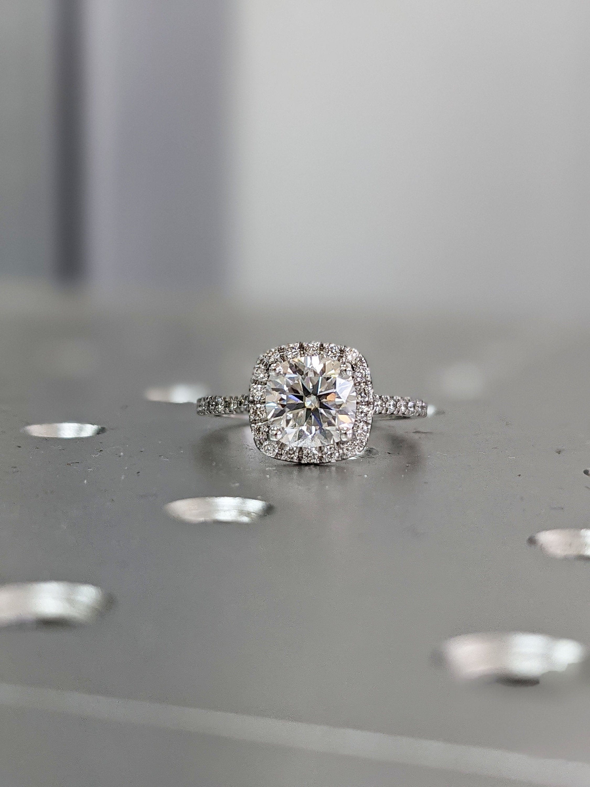 2 Carat Cushion Cut Engagement Ring Halo Solid 14k White Gold Lab Created Man Made Synthetic Simulated Moissanite and Diamonds Ring Bridal