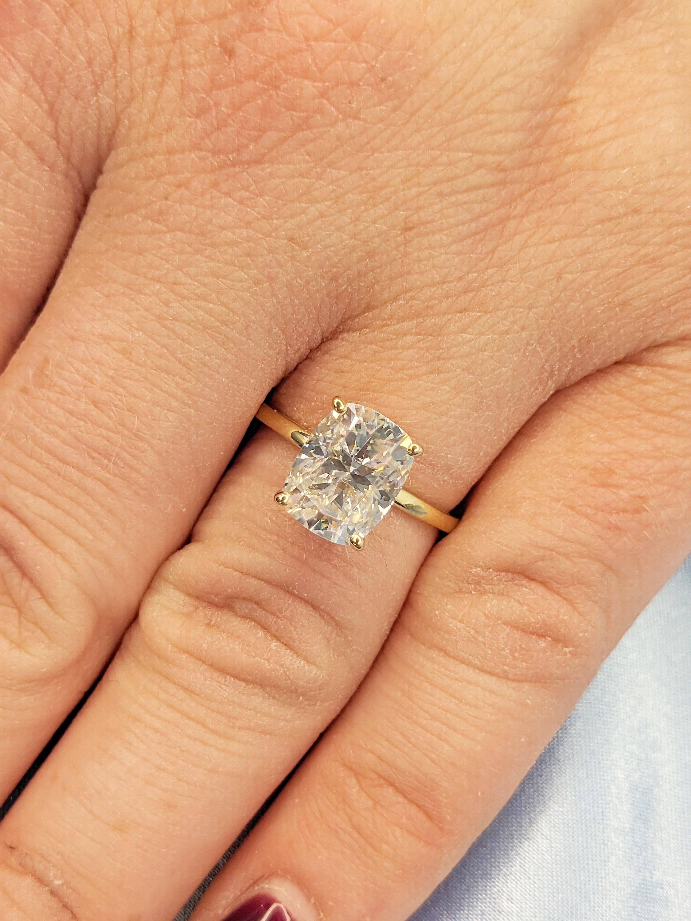 This exquisite engagement ring features a dazzling elongated cushion cut Lab Grown Diamond in a prong setting, designed to maximize its brilliance. The sleek gold band enhances its timeless elegance, making it a perfect choice for any special occasion. A hidden halo of Lab Grown Diamonds adds a touch of subtle luxury beneath the center stone, offering extra sparkle from every angle. Ideal for engagements, weddings, or anniversaries, this ring is a stunning symbol of love and sophistication.