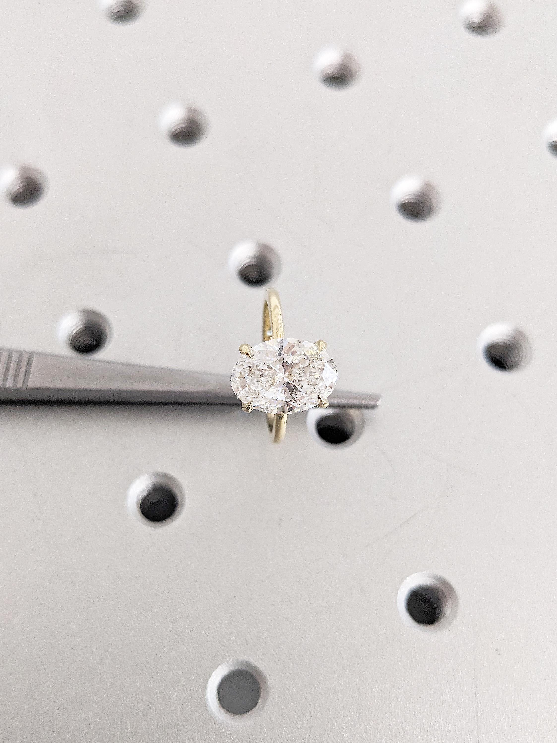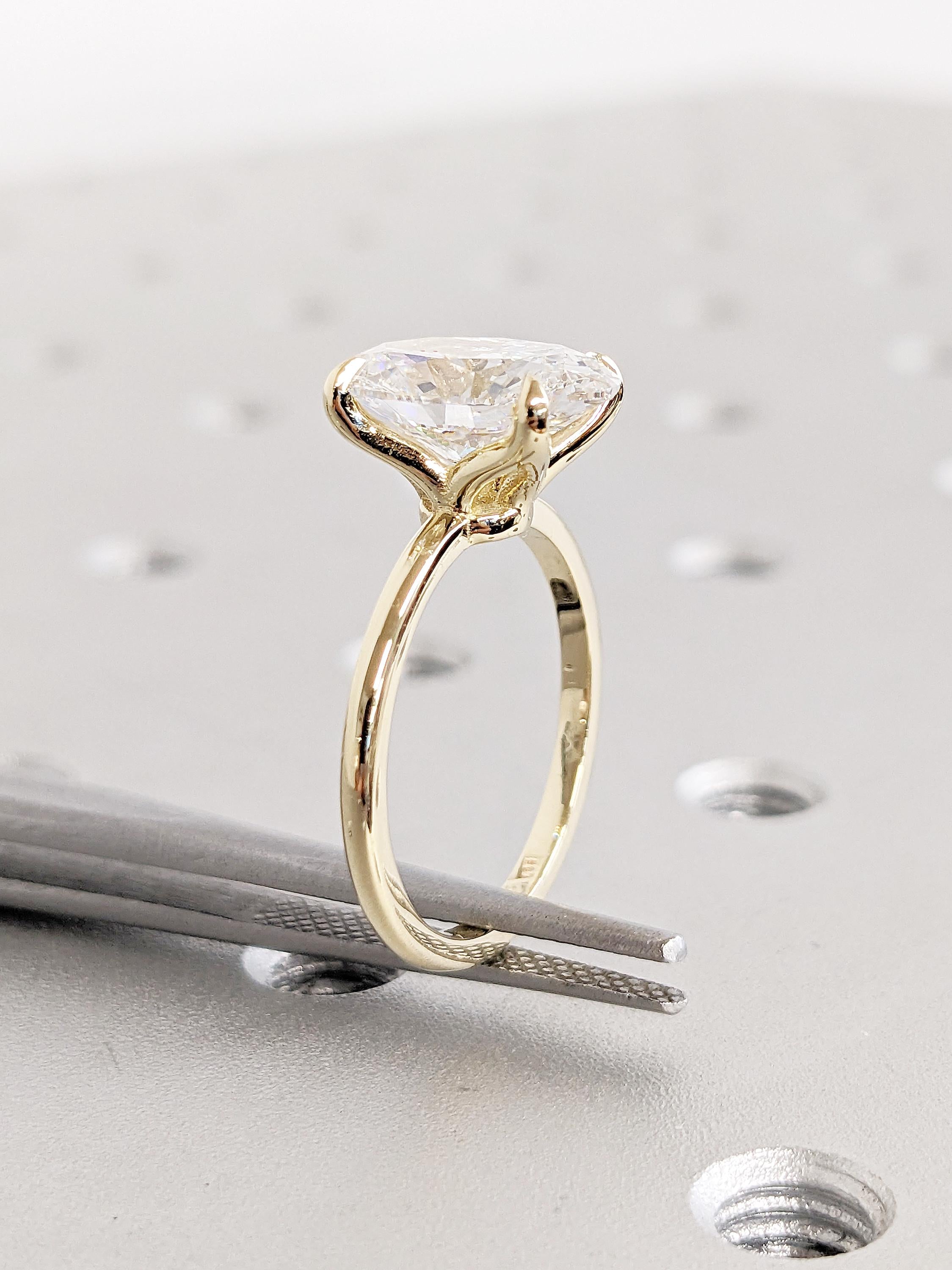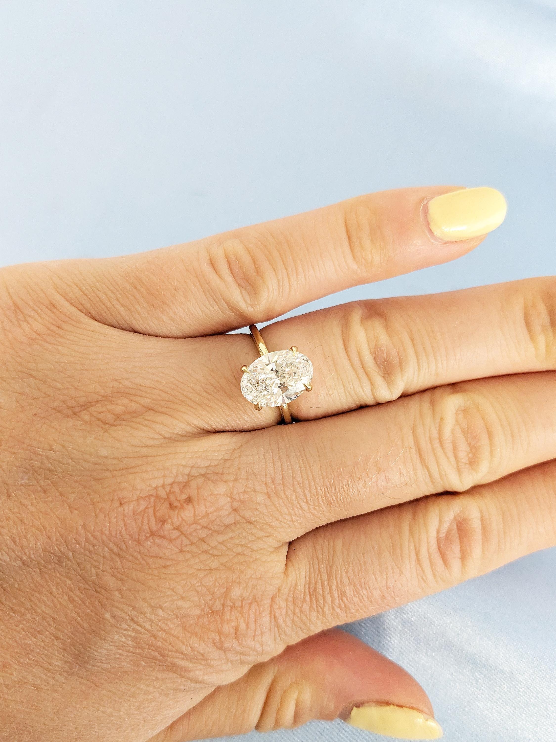 A timeless solitaire ring, features an oval cut Lab Grown Diamond center stone, elegantly held on a tulip style open basket with talon prong setting, on a delicate thin band of 1.5mm width. This minimalist nature inspired jewelry, makes a great gift for engagement, wedding anniversary or birthday.