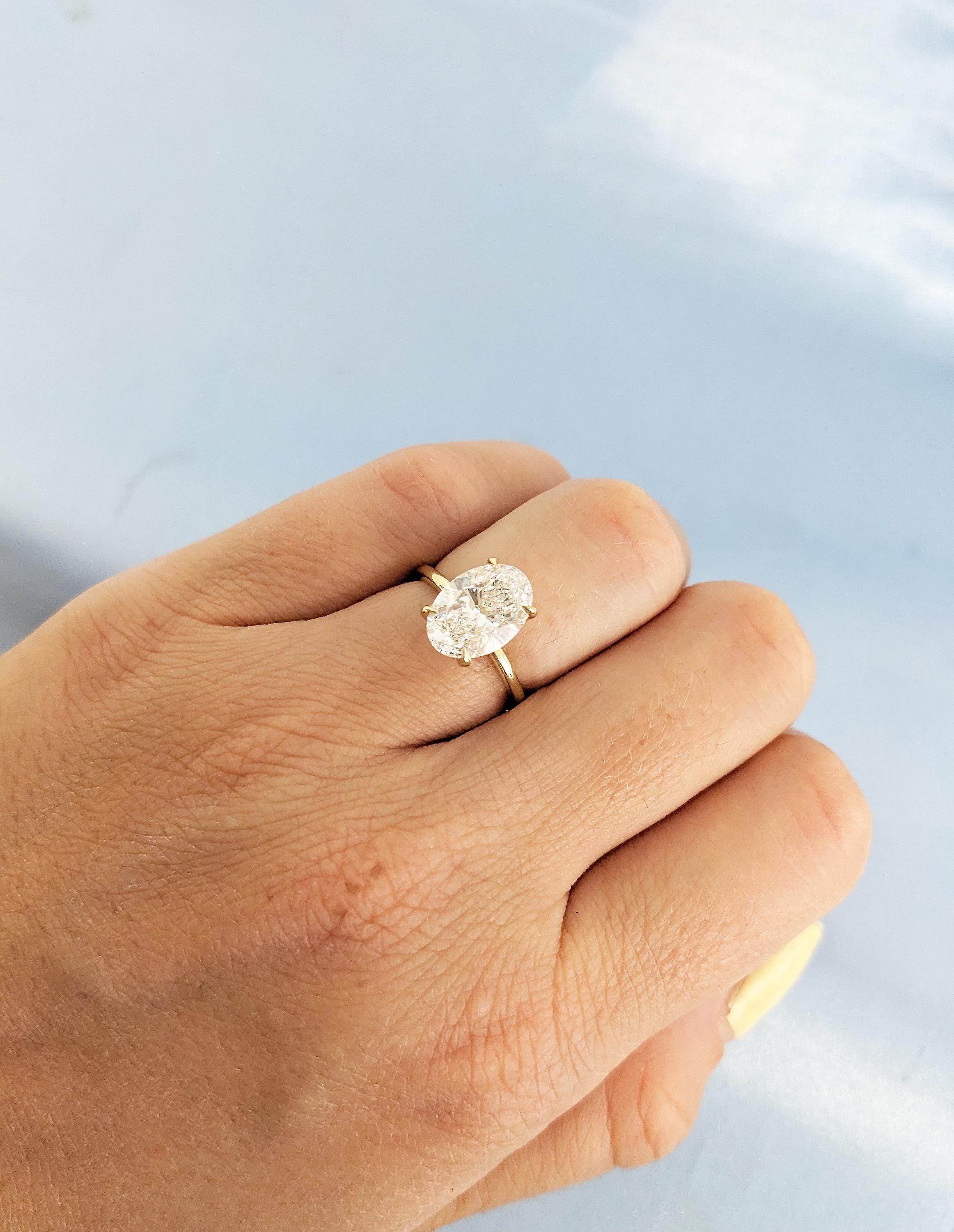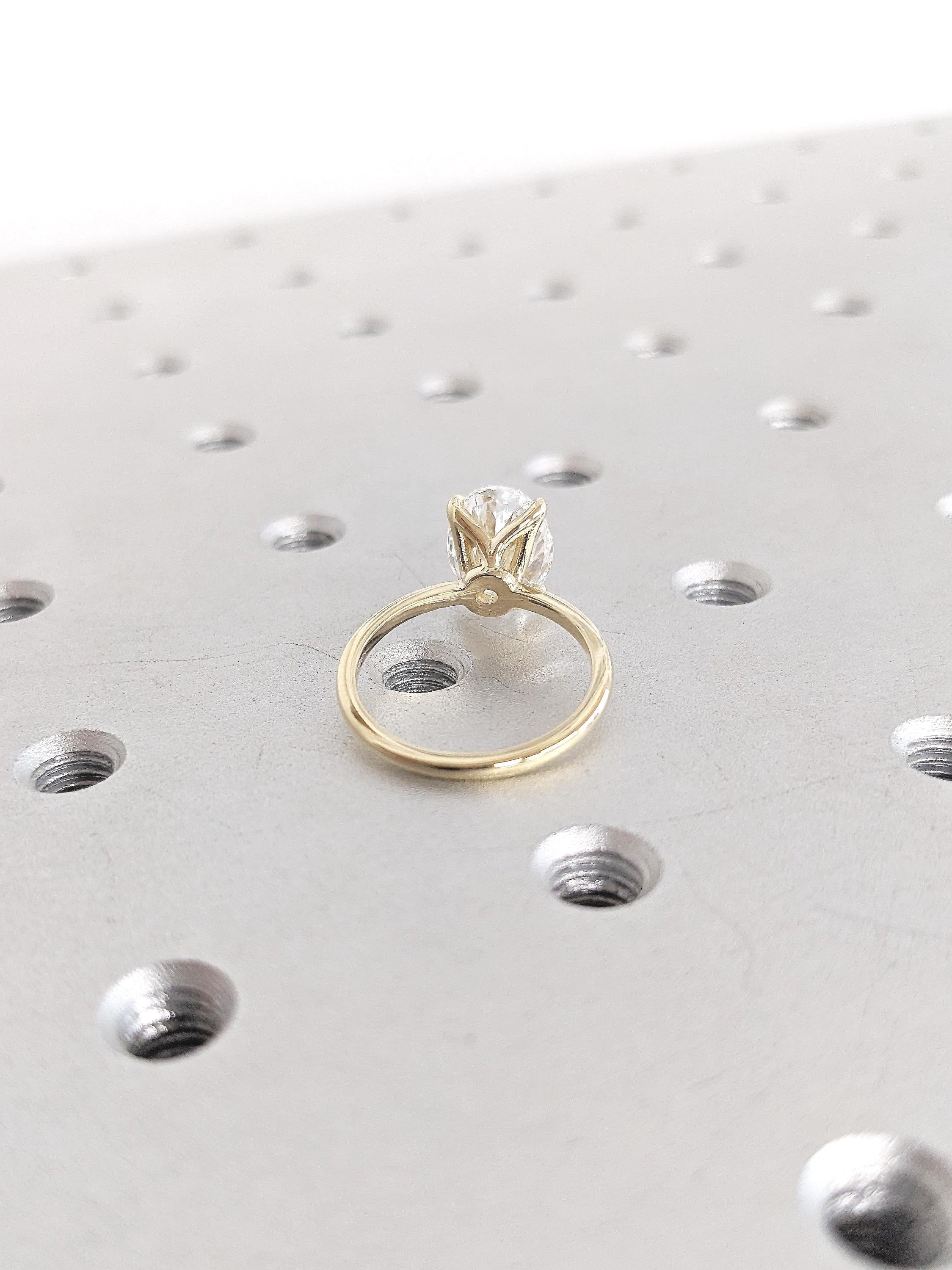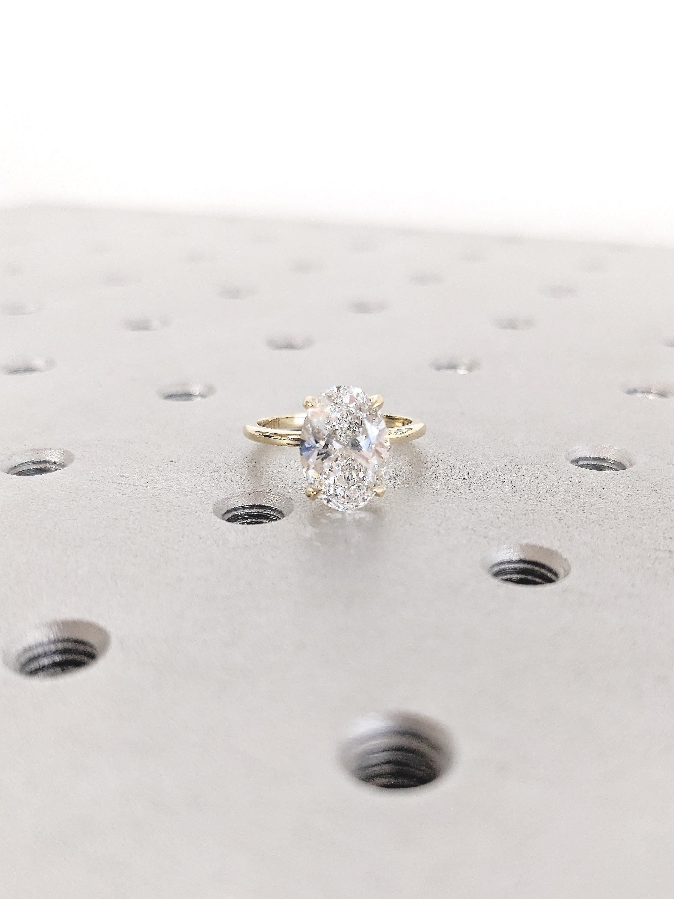 A timeless solitaire ring, features an oval cut Lab Grown Diamond center stone, elegantly held on a tulip style open basket with talon prong setting, on a delicate thin band of 1.5mm width. This minimalist nature inspired jewelry, makes a great gift for engagement, wedding anniversary or birthday.