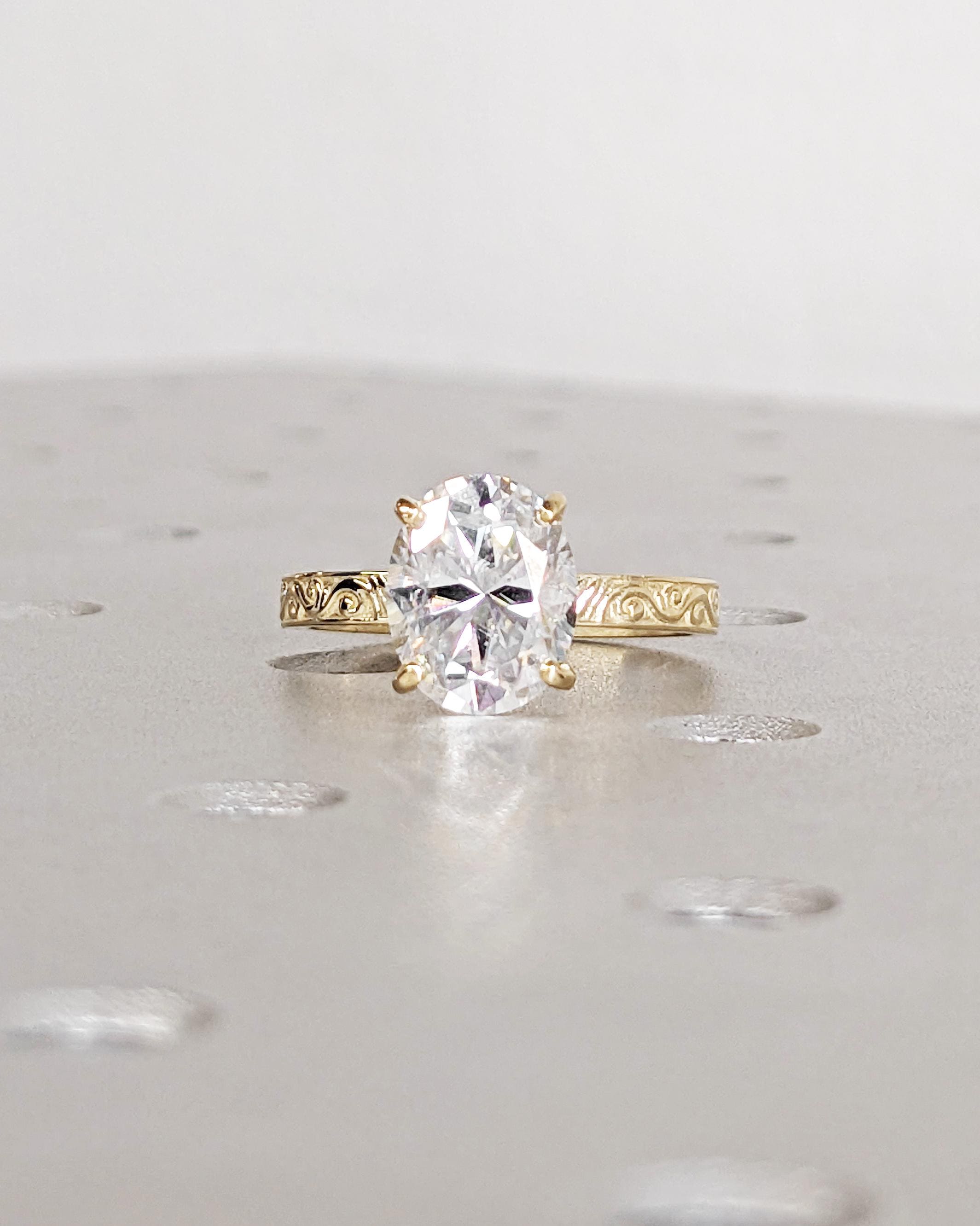 Handcrafted with elegant scrollwork pattern, this 2.5mm width band features an oval cut Lab Created Diamond solitaire set in open gallery style. The perfect balance between minimalist and vintage charm.