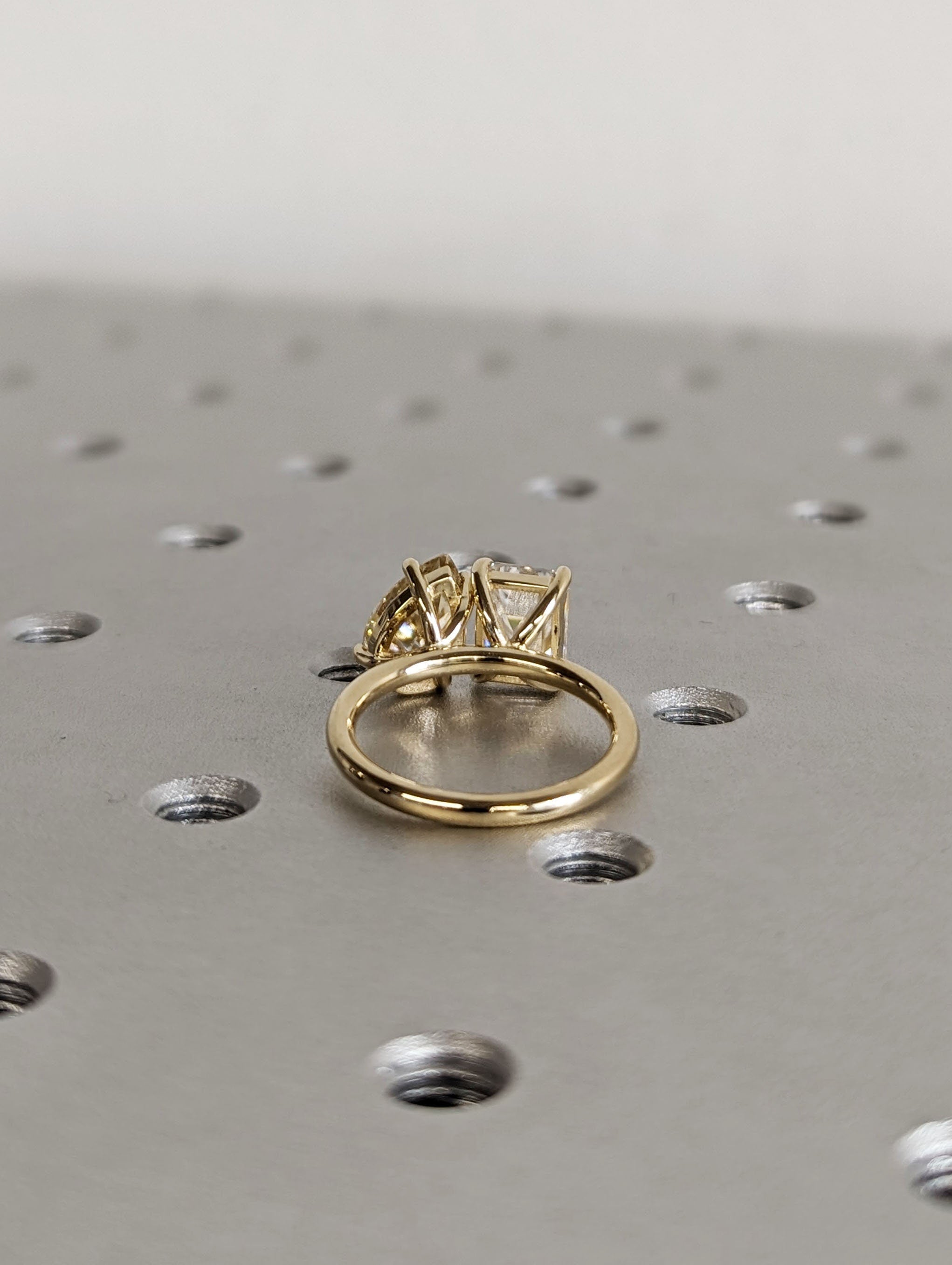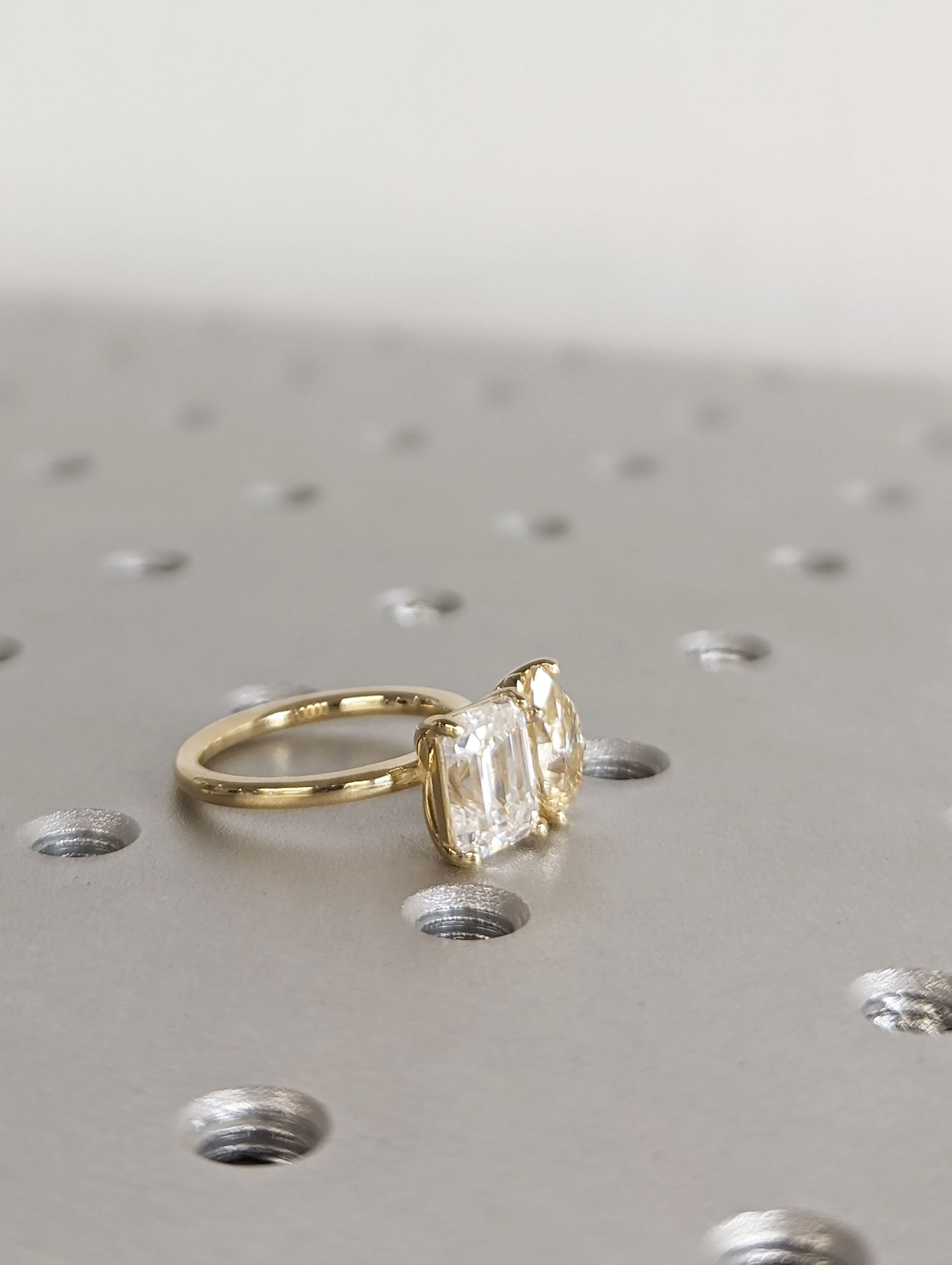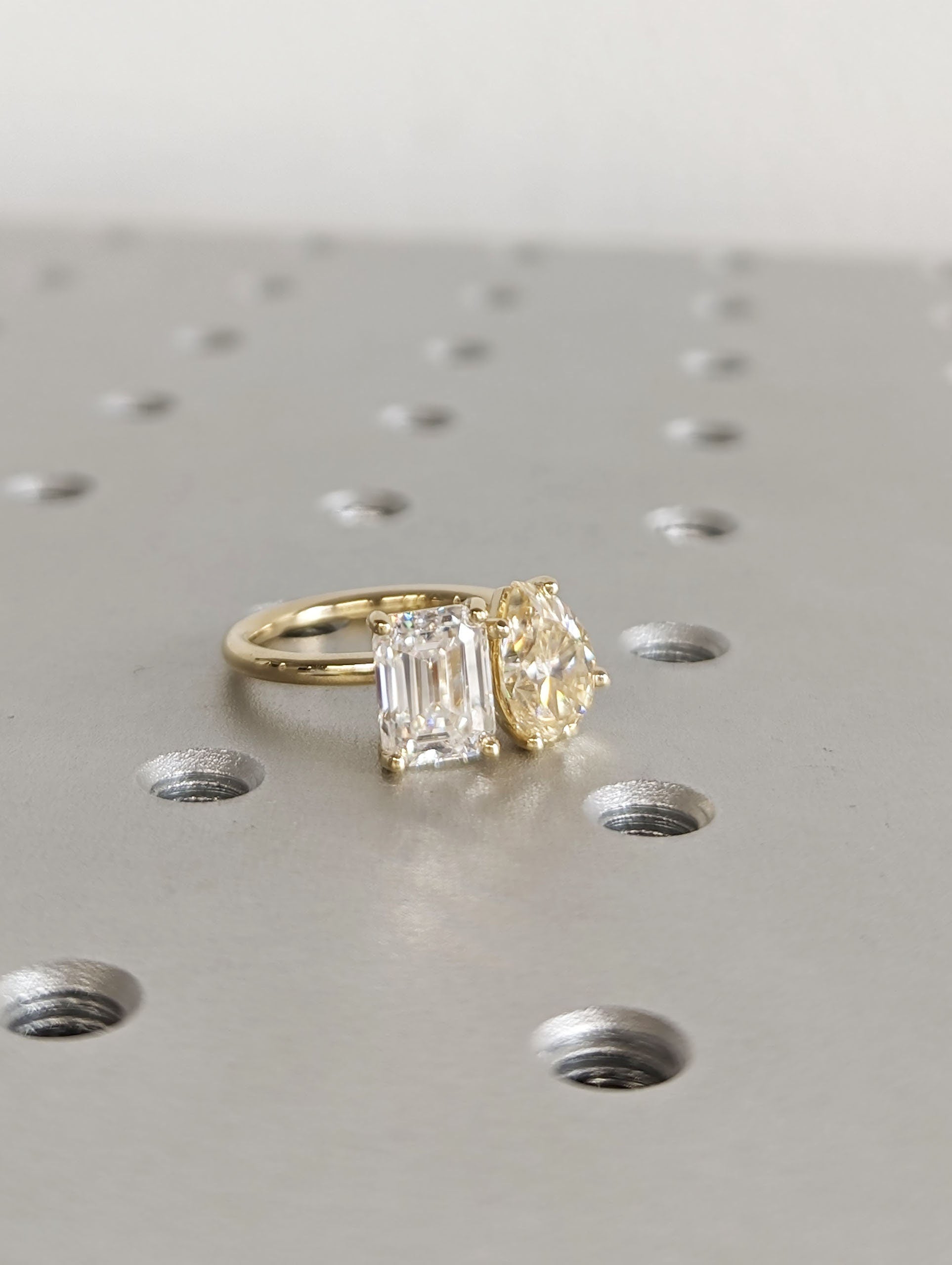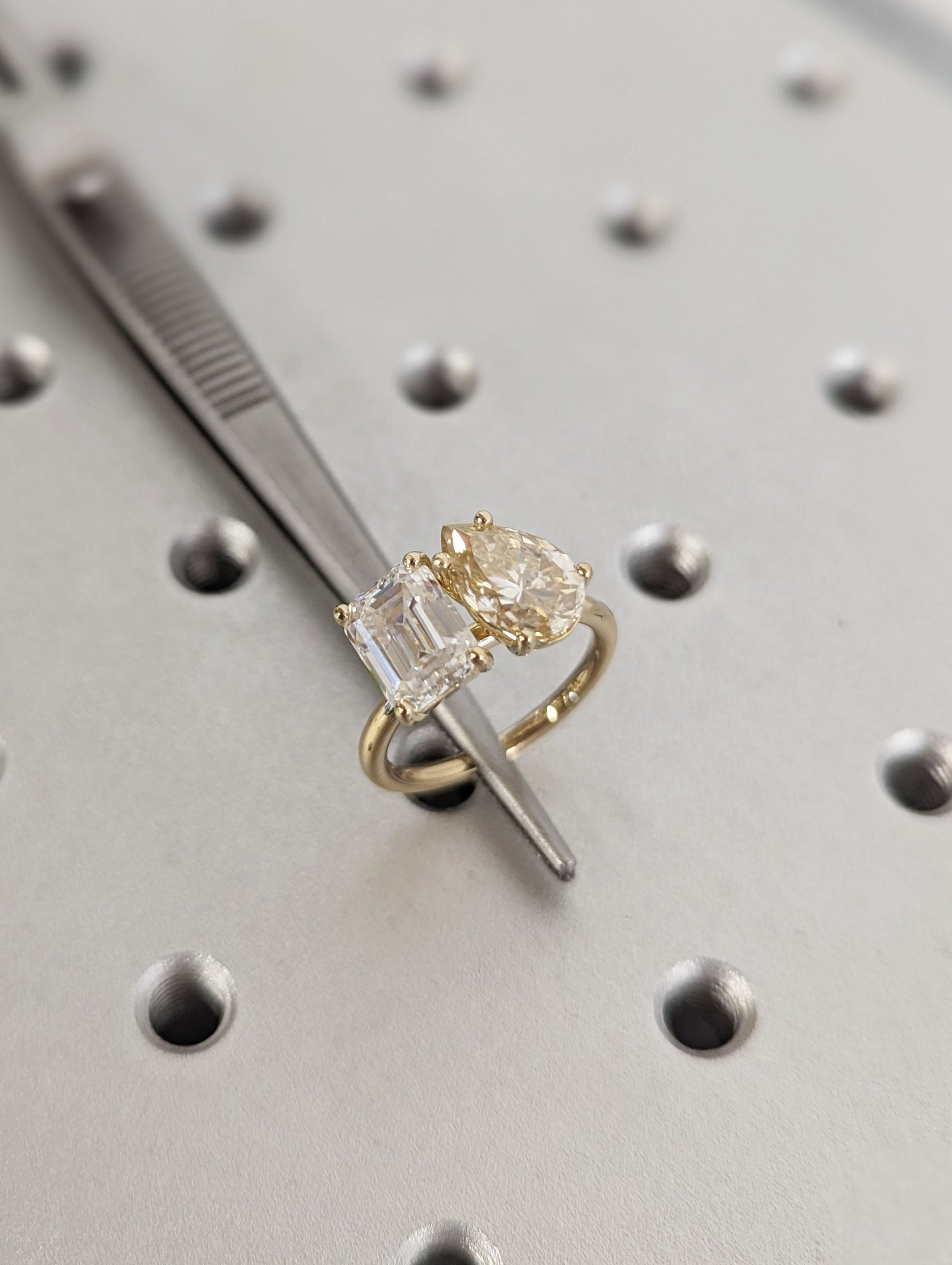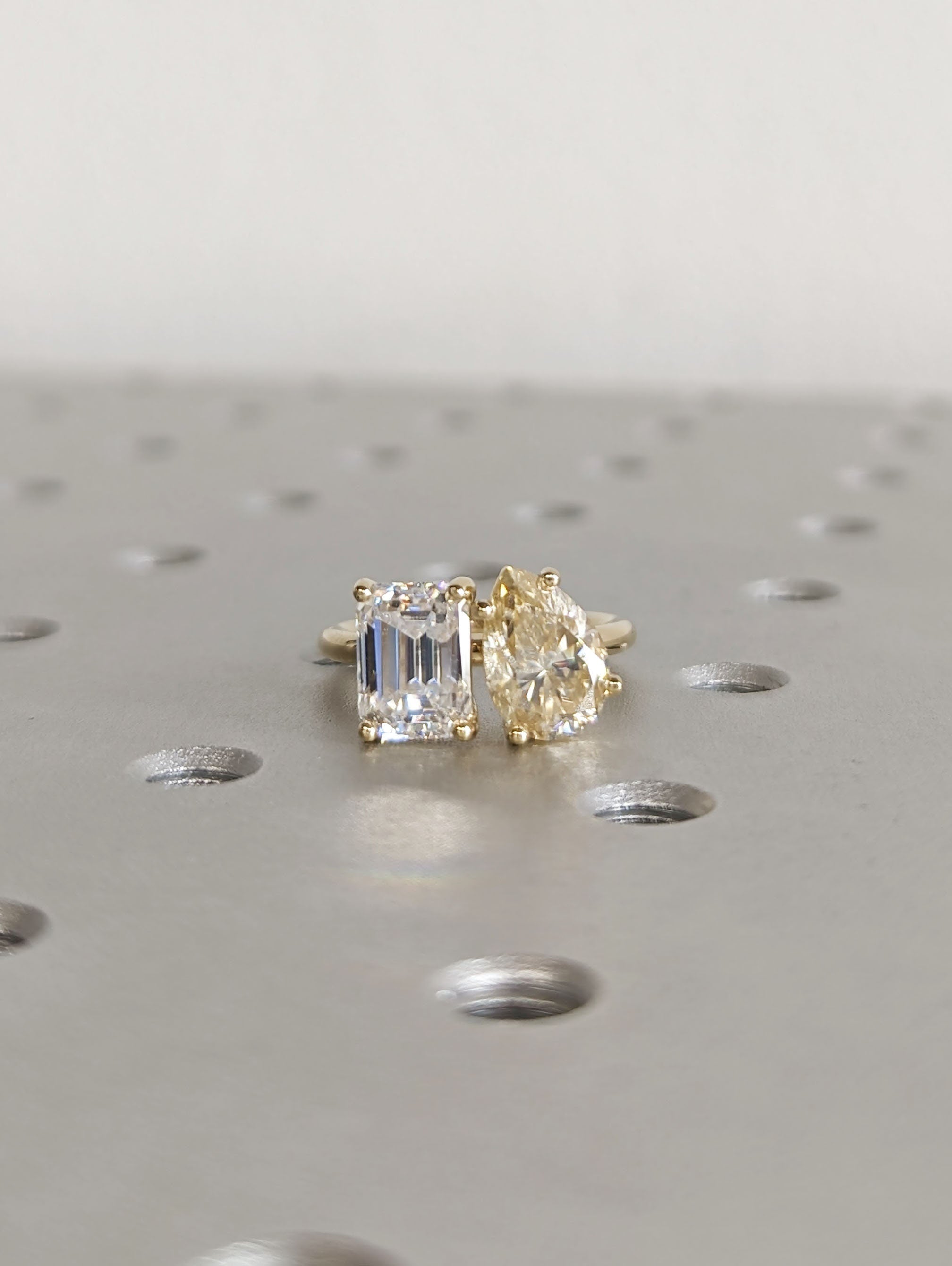 With the combination of our beautiful Champagne and White Moissanite, this alluring piece is minimalist yet fashionable. Set on a delicate thin setting, this show stopper duo, Emerald and Pear shape Moissanite ring will instantly elevates your style for any occasion.