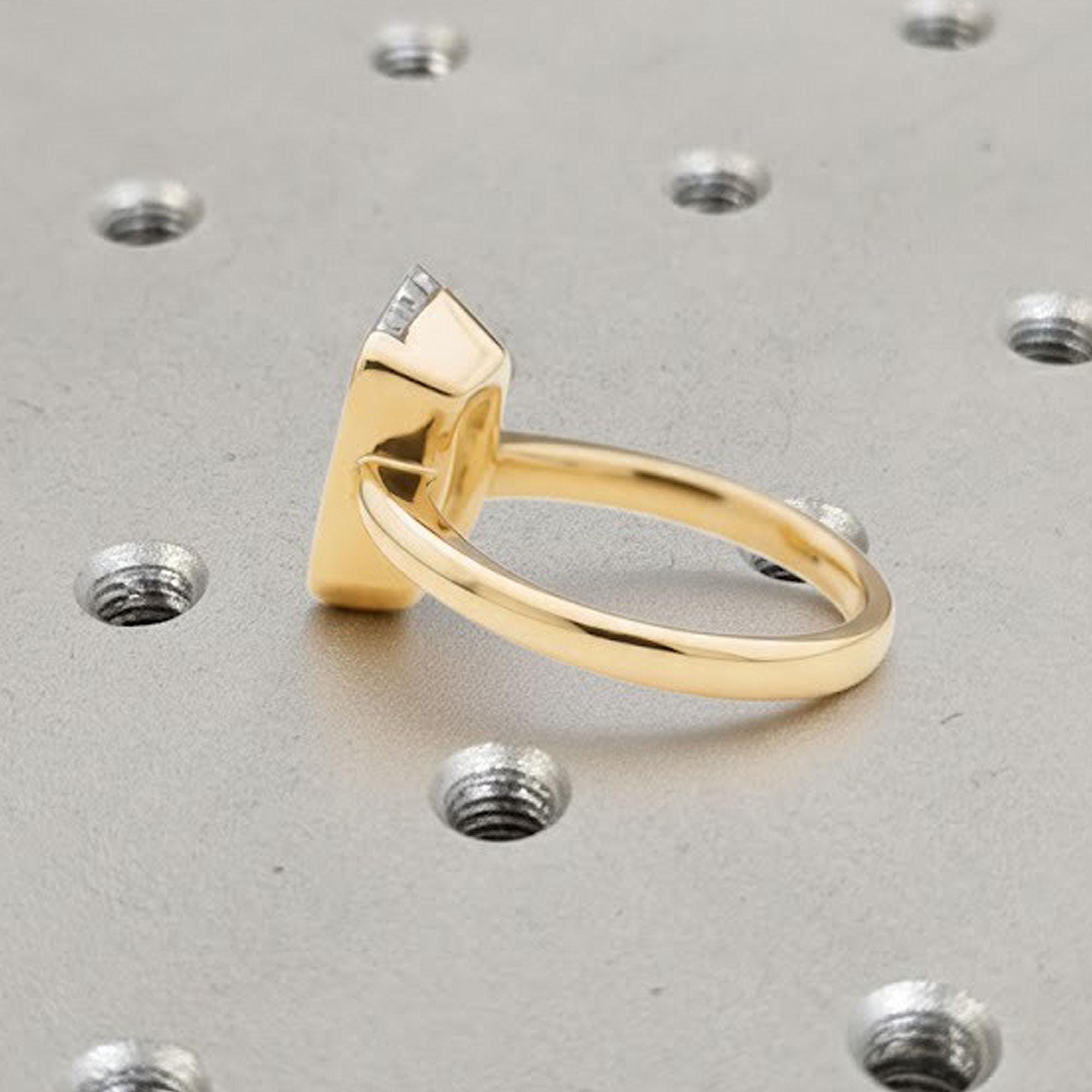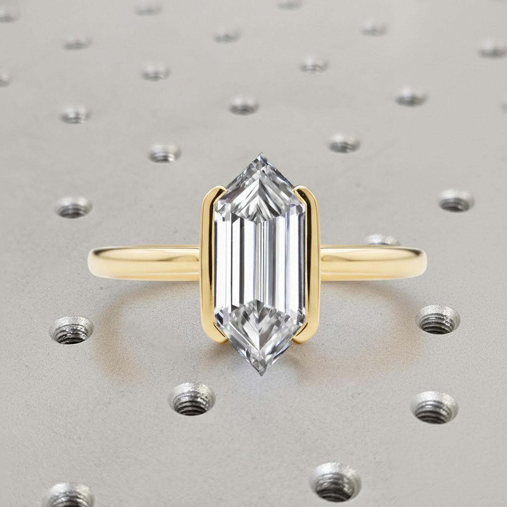 Modern geometry meets timeless elegance in this striking solitaire ring. Featuring an elongated hexagon-cut Lab-Grown Diamond secured in a sleek half bezel setting, the design balances bold lines with minimal sophistication. The open sides allow light to dance through the facets, enhancing the diamond’s brilliance while maintaining a clean, contemporary silhouette — perfect for the modern bride or anyone drawn to understated luxury.