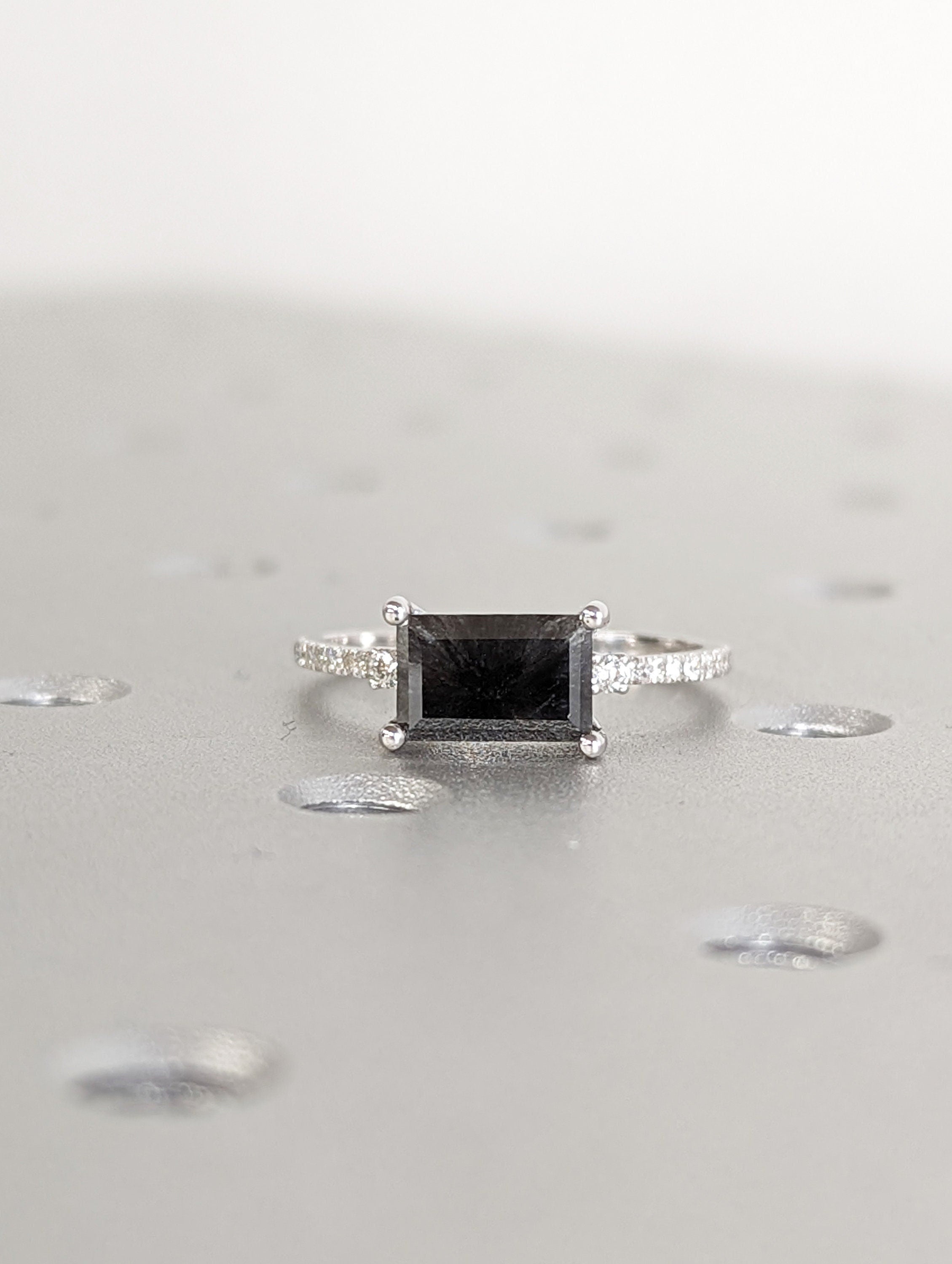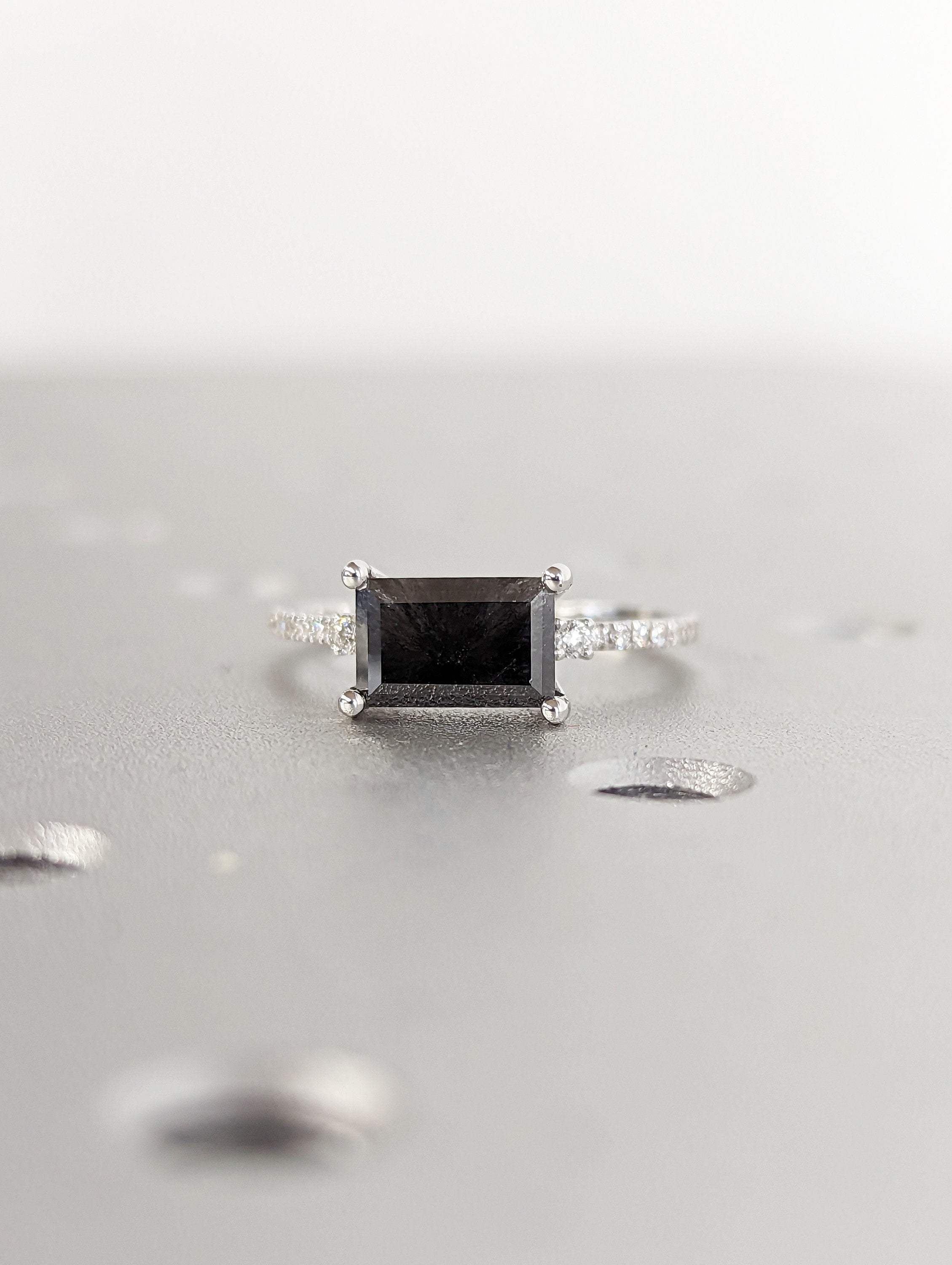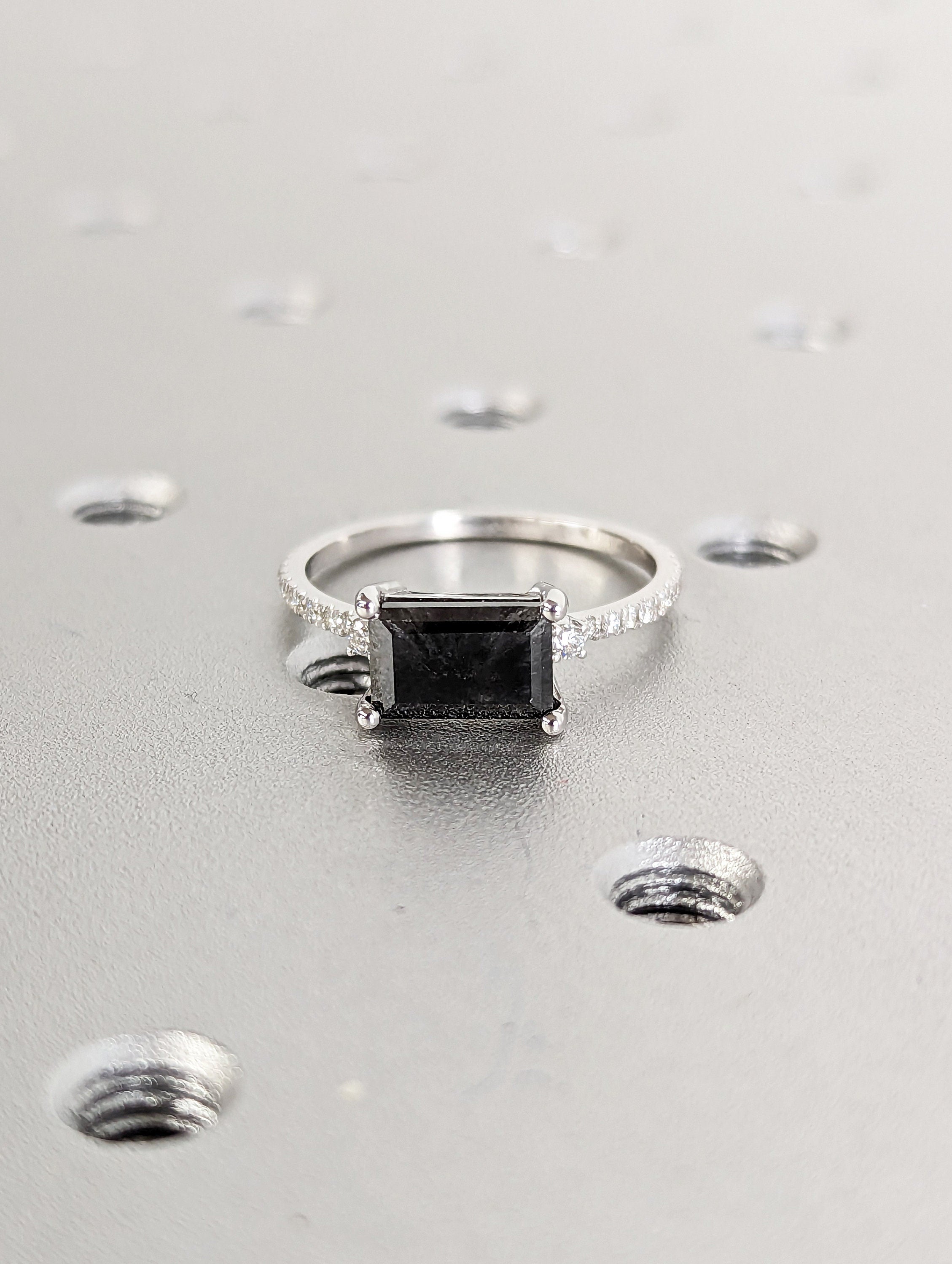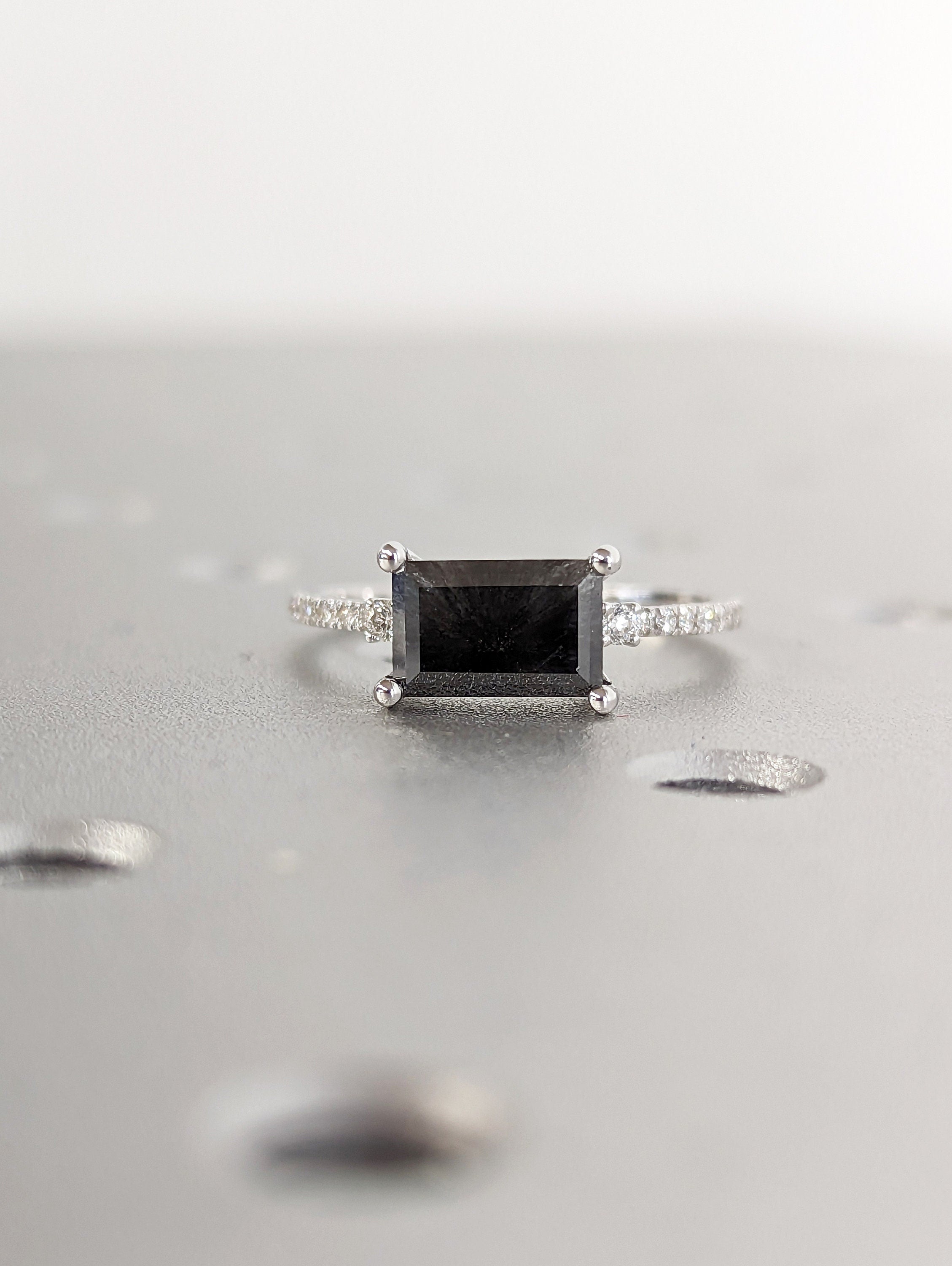 2ct Emerald Baguette Raw Salt and Pepper Diamond Gold Engagement Ring Art Deco 1920's Inspired Thin Petite Band 14k Unique Ring for Her