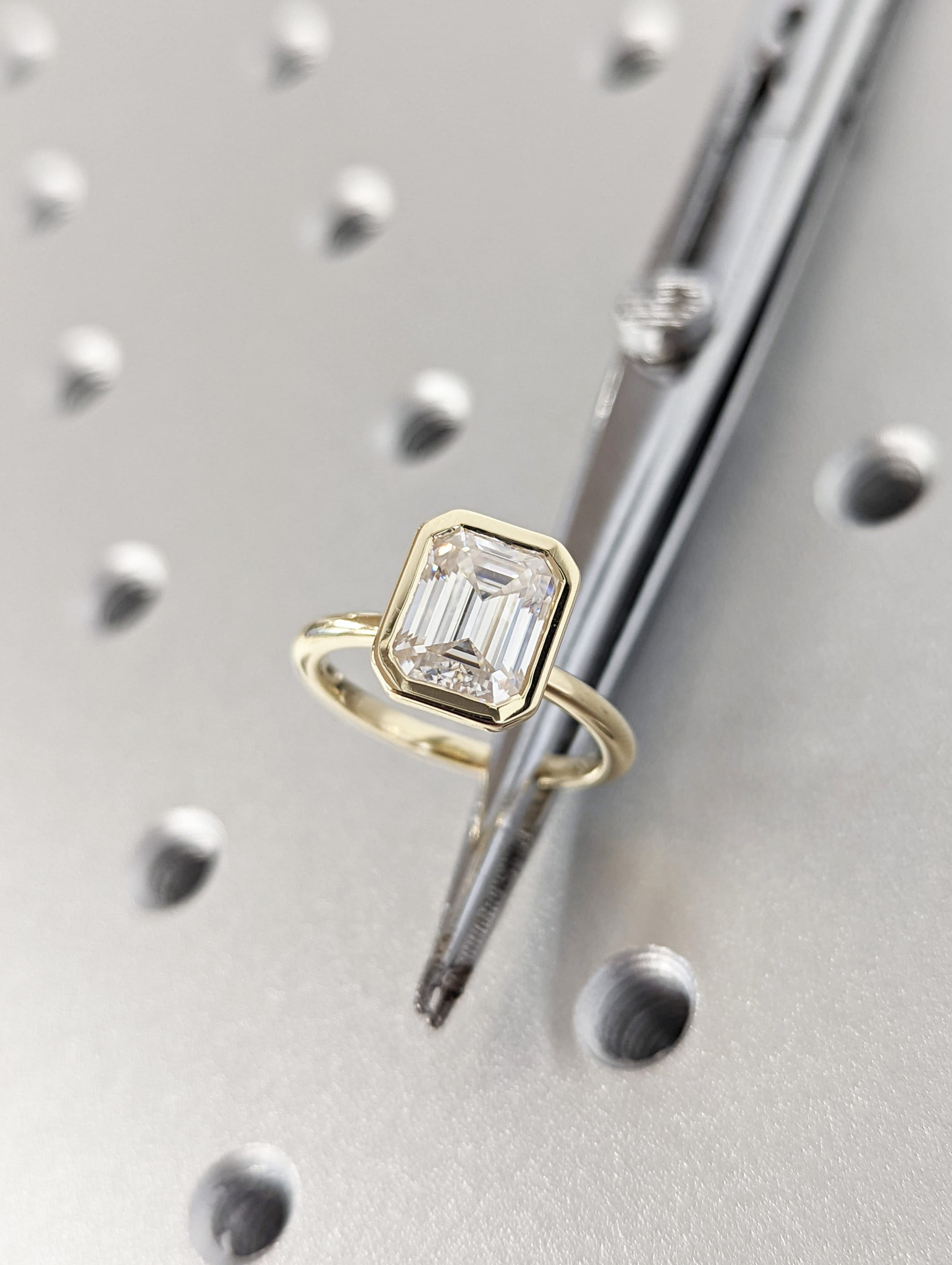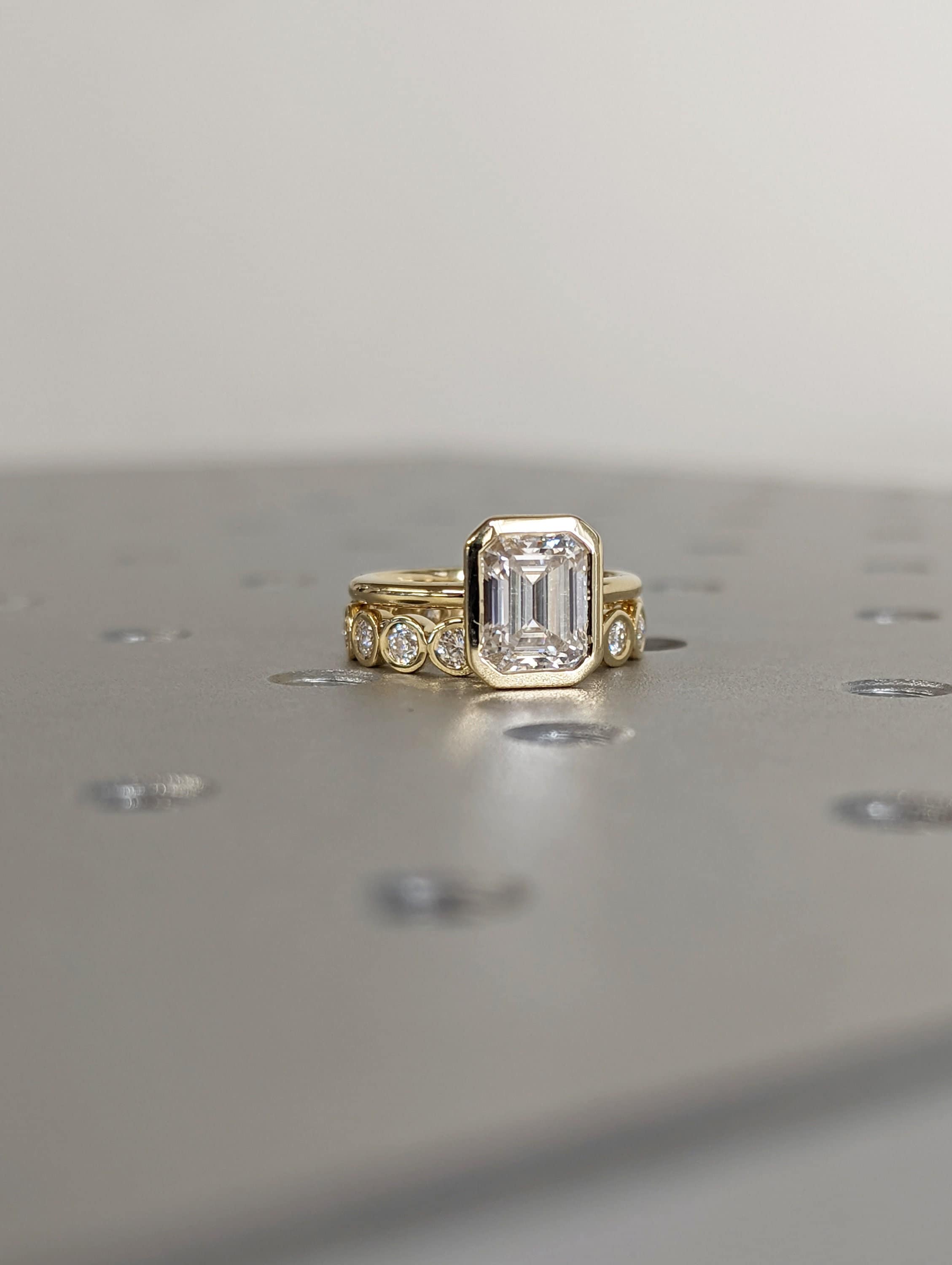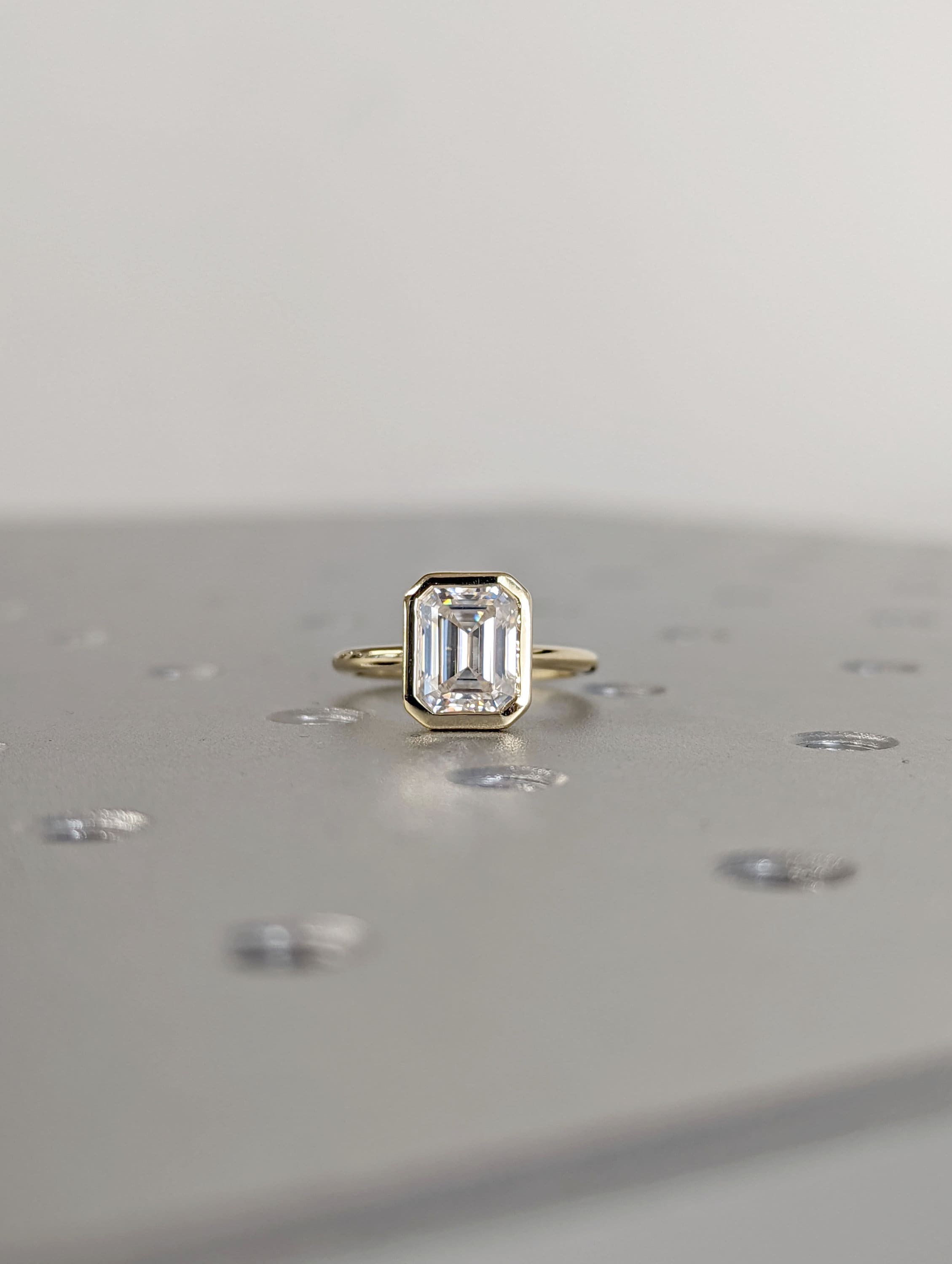 Understated and elegant, this sophisticated engagement ring features an emerald bezel setting atop a delicate rounded band. Can be matched with a full eternity moissanite band.