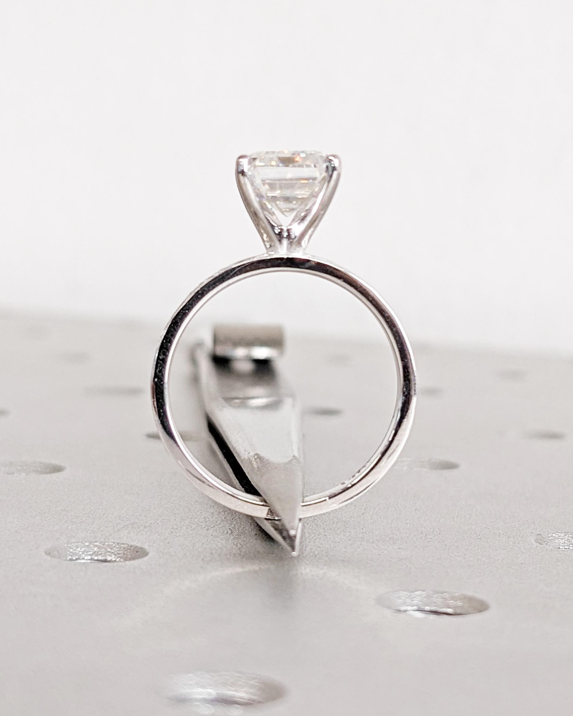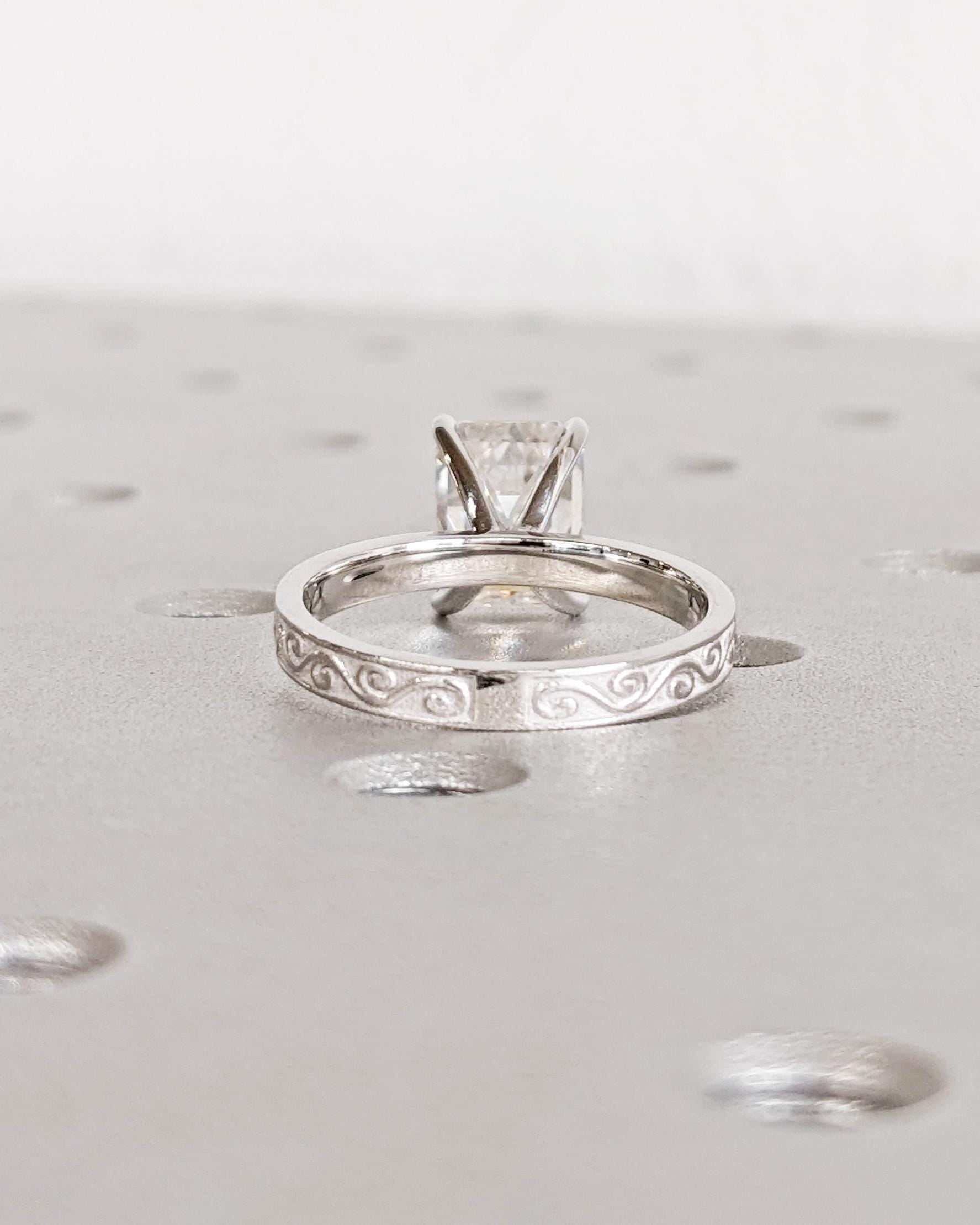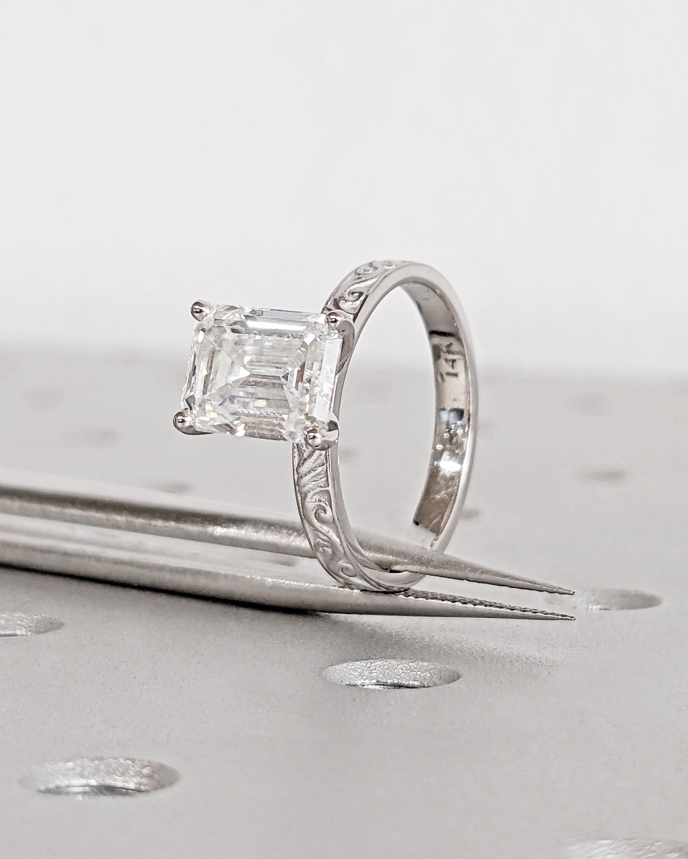 A refined blend of modern geometry and vintage detail. This solitaire ring showcases an emerald-cut Lab Grown Diamond, set on a distinctive square band. Delicate filigree engraving adds a touch of old-world charm, balancing clean lines with intricate craftsmanship. A timeless piece, with a story in every detail.