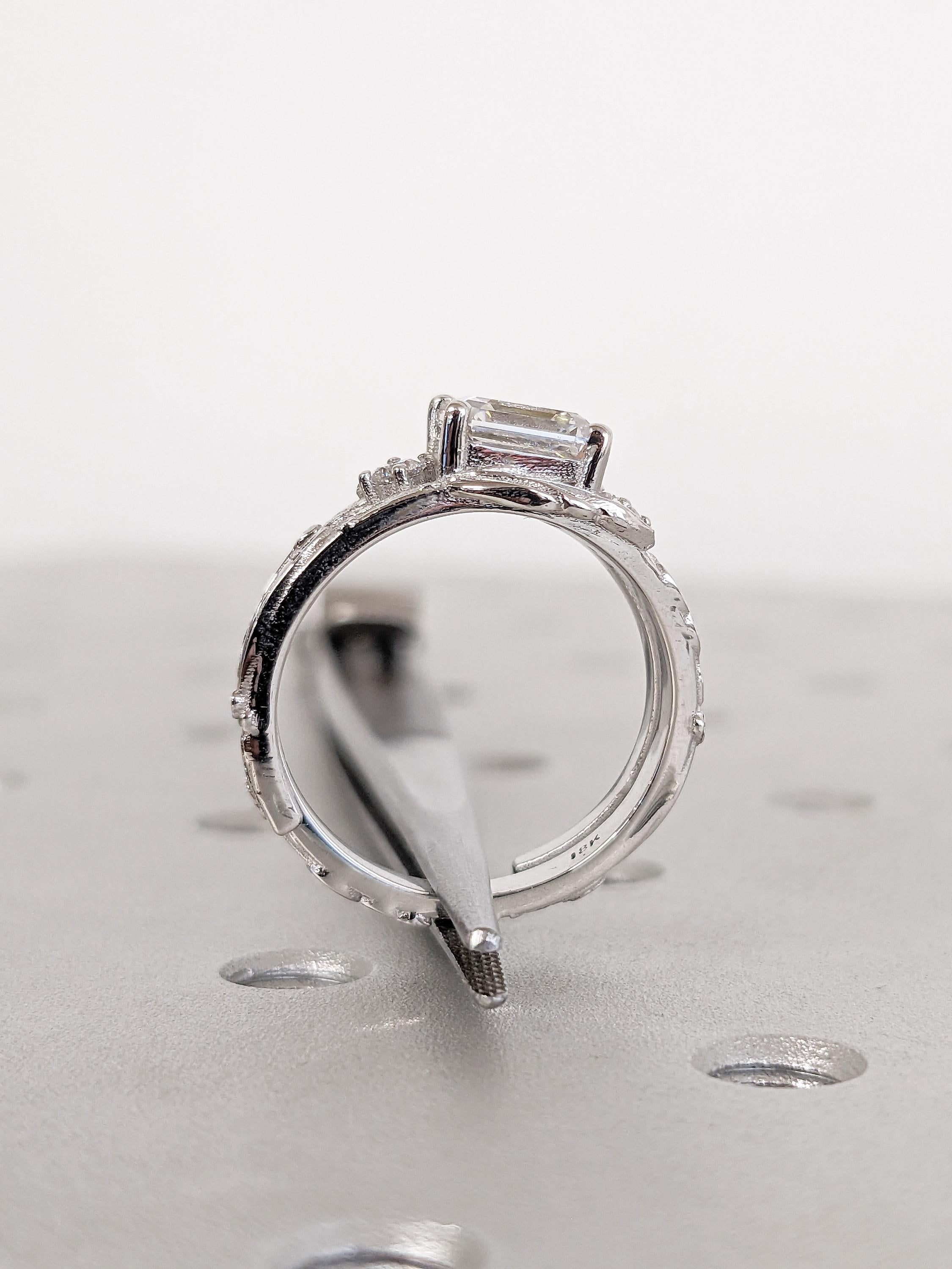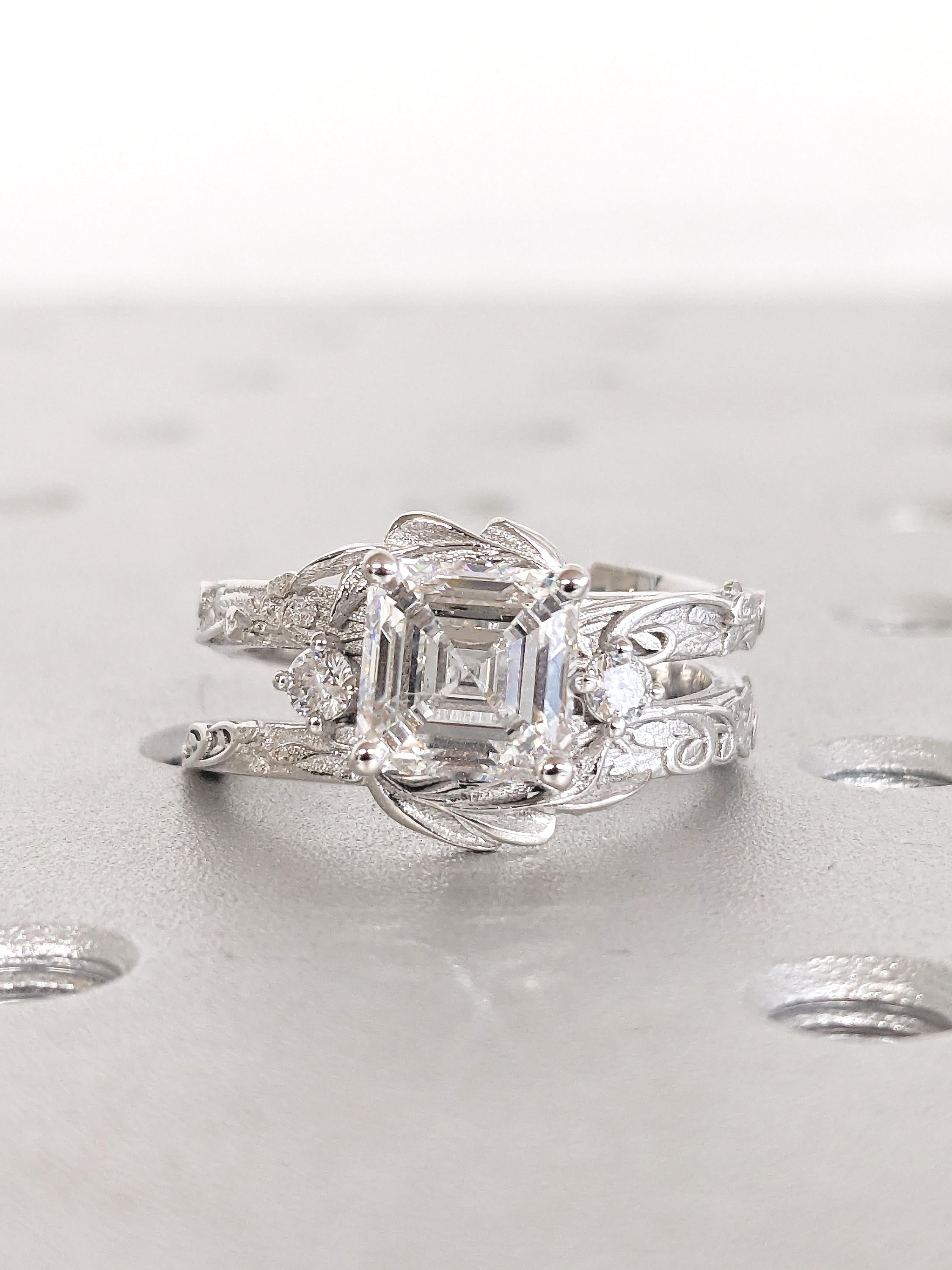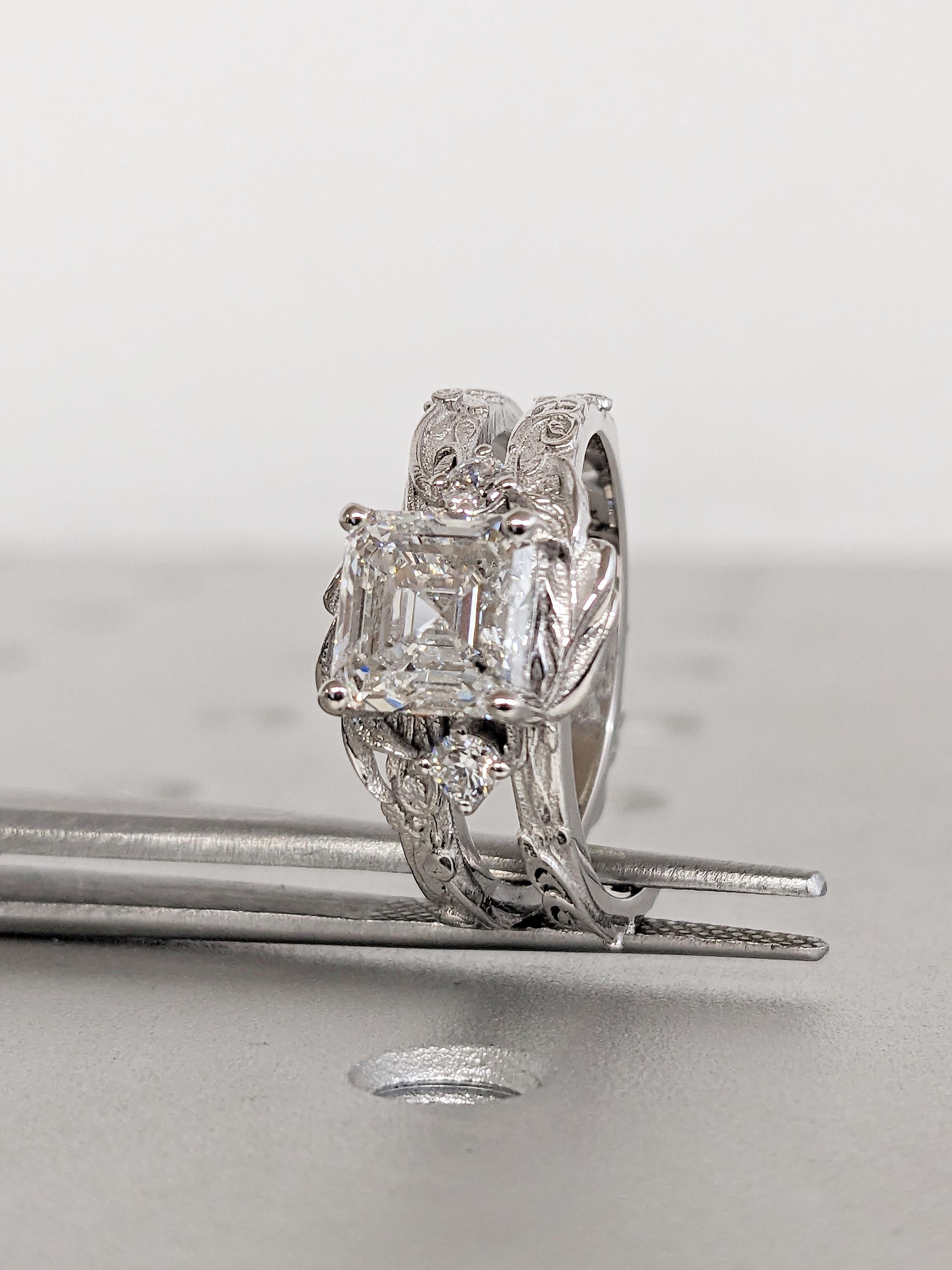 This stunning engagement ring features an Asscher-cut Lab Grown Diamond at its center, flanked by two sparkling round-cut Lab Diamonds. The band is adorned with graceful floral motifs, adding a touch of vintage artistry and timeless romance. Ethically crafted and endlessly elegant, this piece captures the perfect harmony of modern brilliance and nature-inspired design.