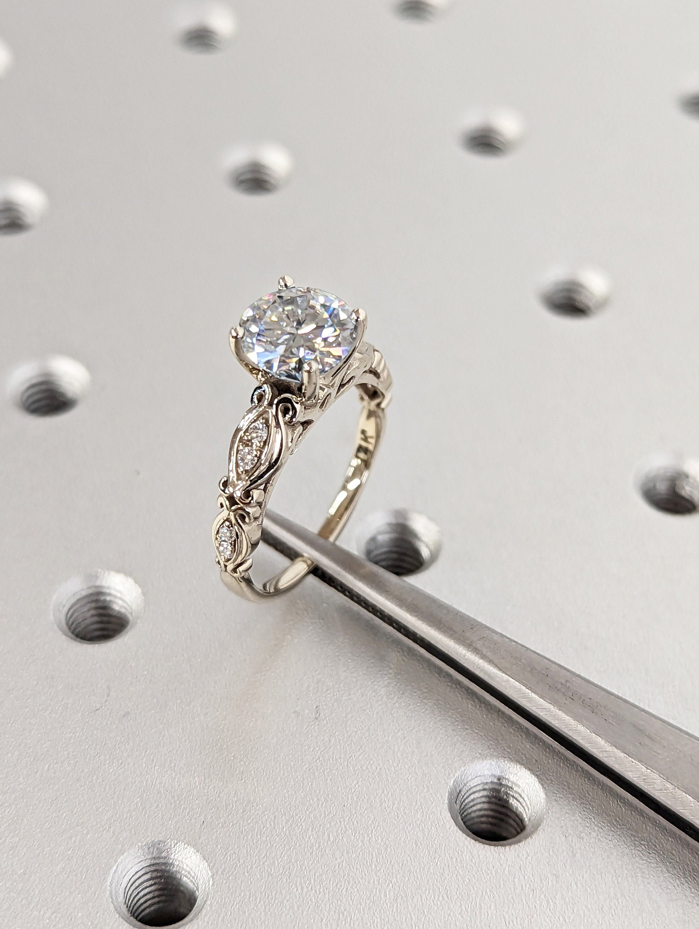 The classic prong center setting is beautifully contrasted with a unique filigree gallery, whilst the diamond or moissanite set floral openwork narrows into the tapered band of this striking engagement ring. Can match with a unique diamond band.