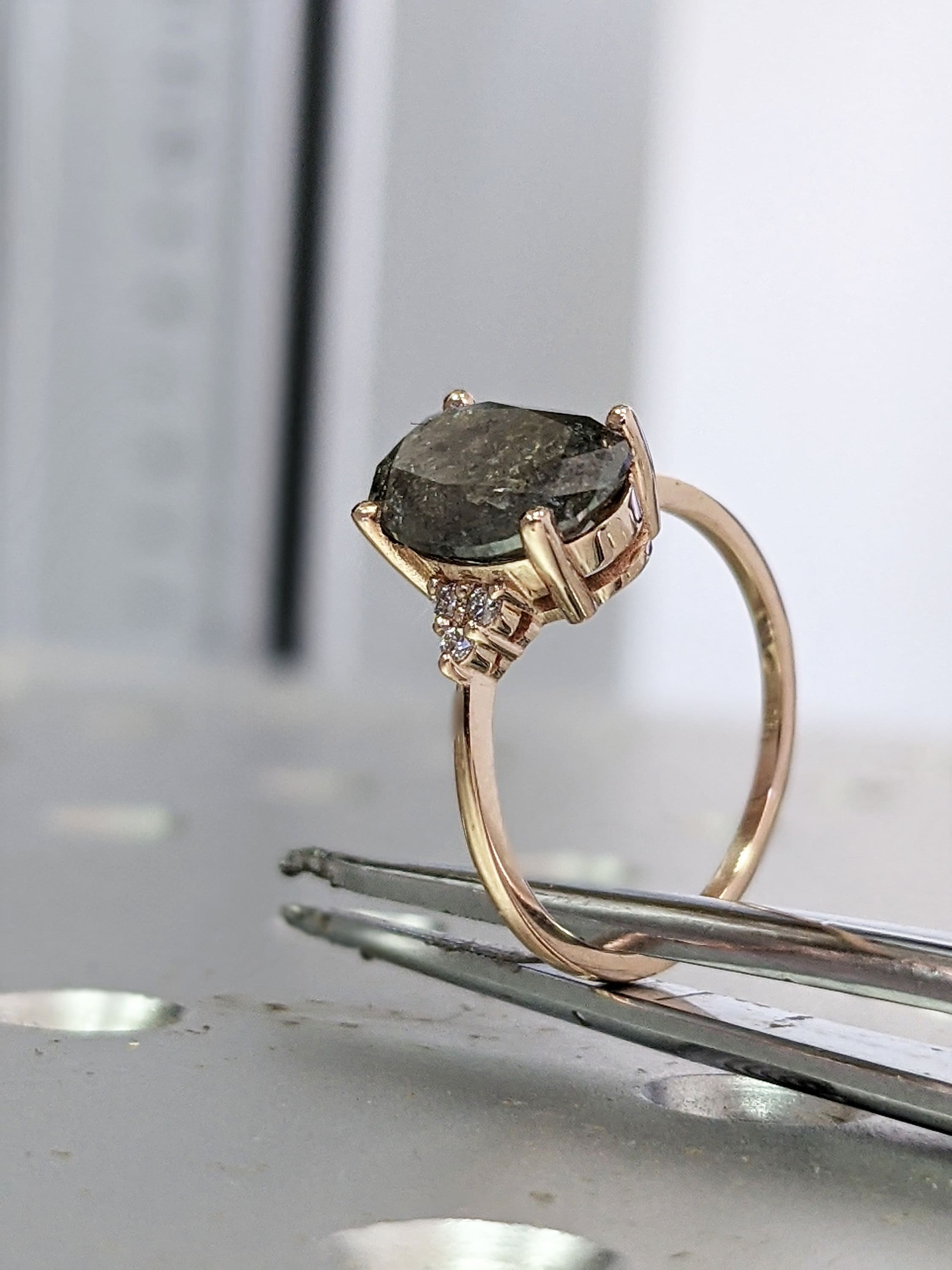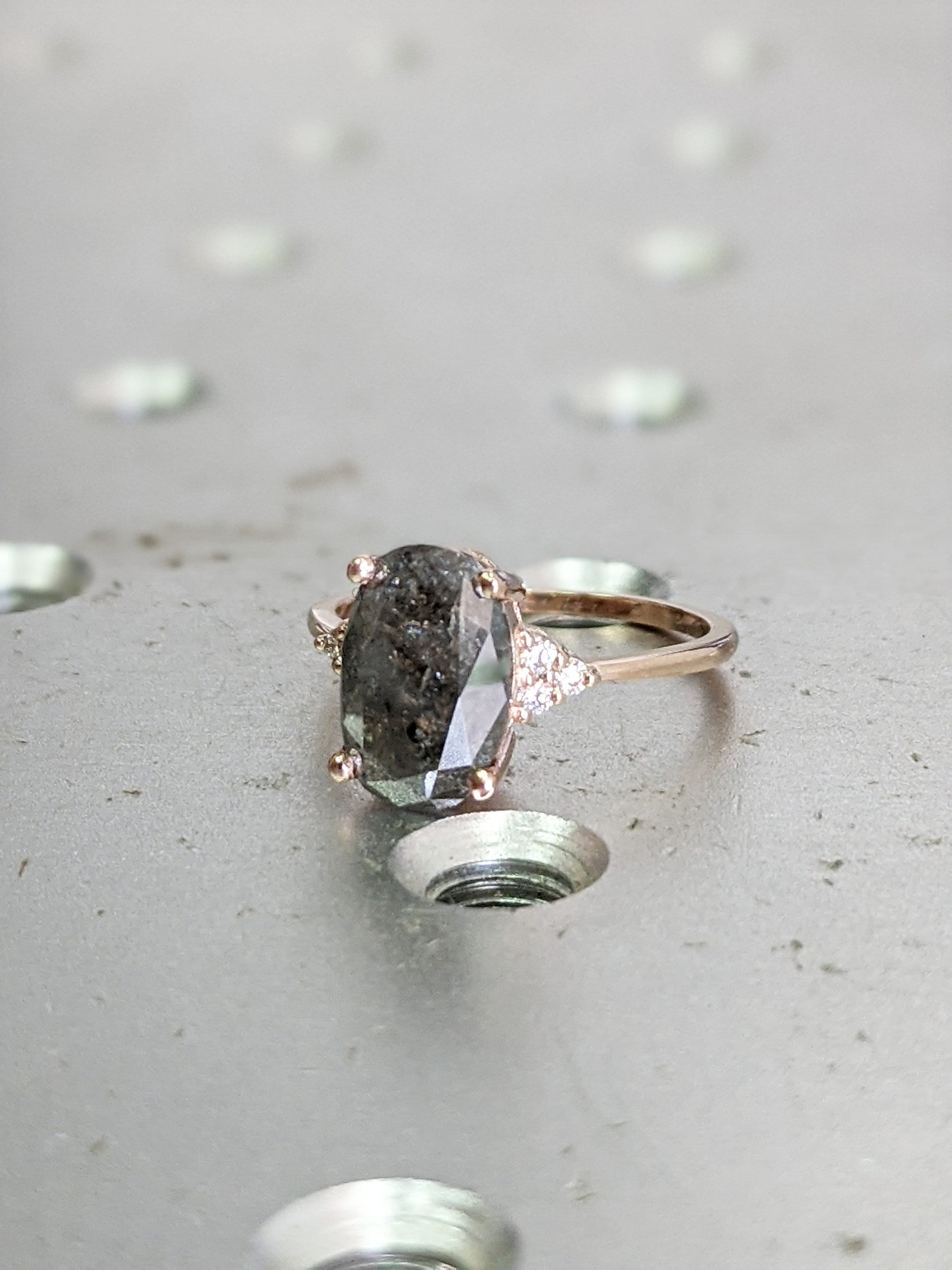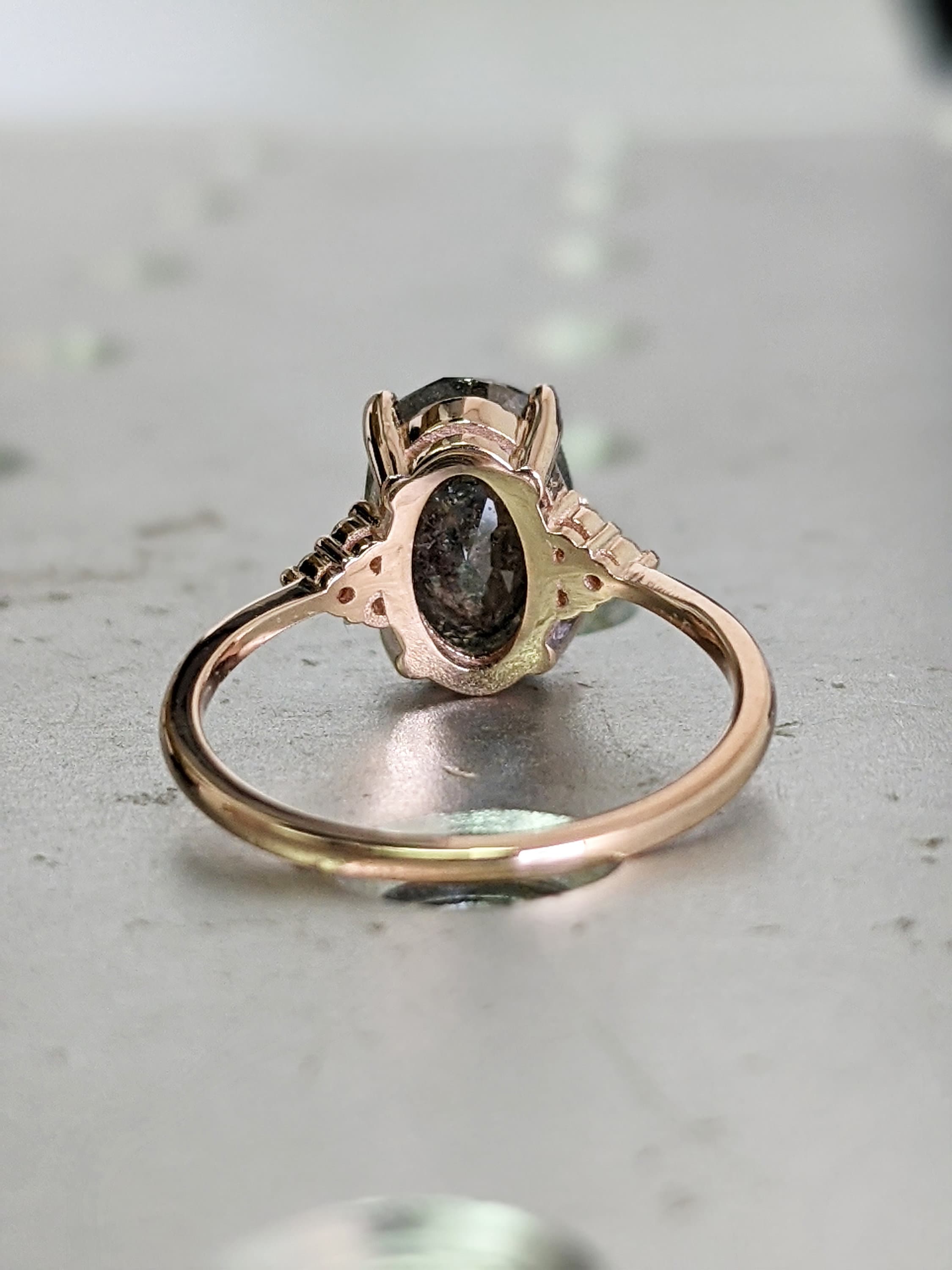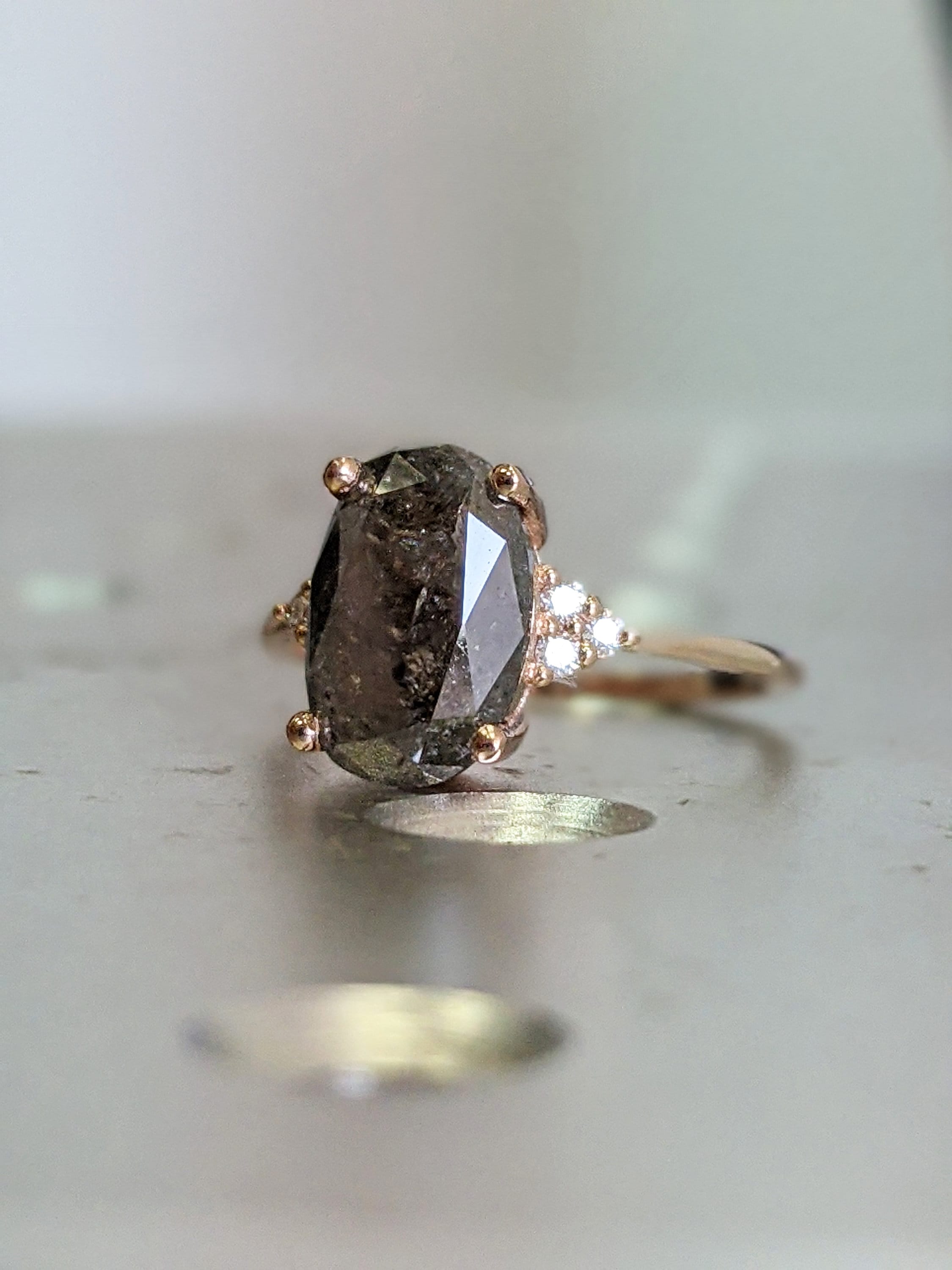 A cluster of 6 round brilliant cut diamonds, with brilliant sparkle and luster, accompany the center salt and pepper diamond, with a oval cut diamond, that gives a strong presence of vintage scent. This beautiful ring is made to order from hand selected and cut