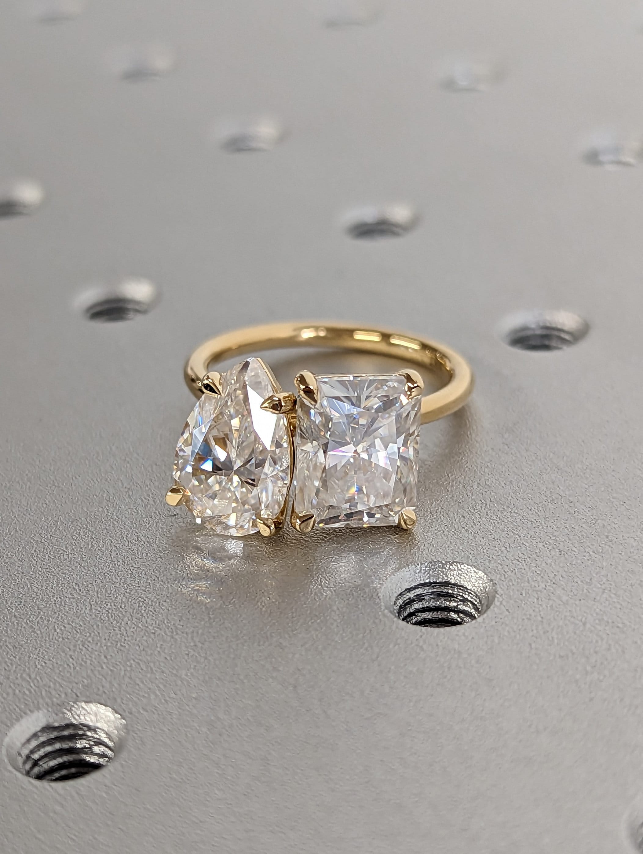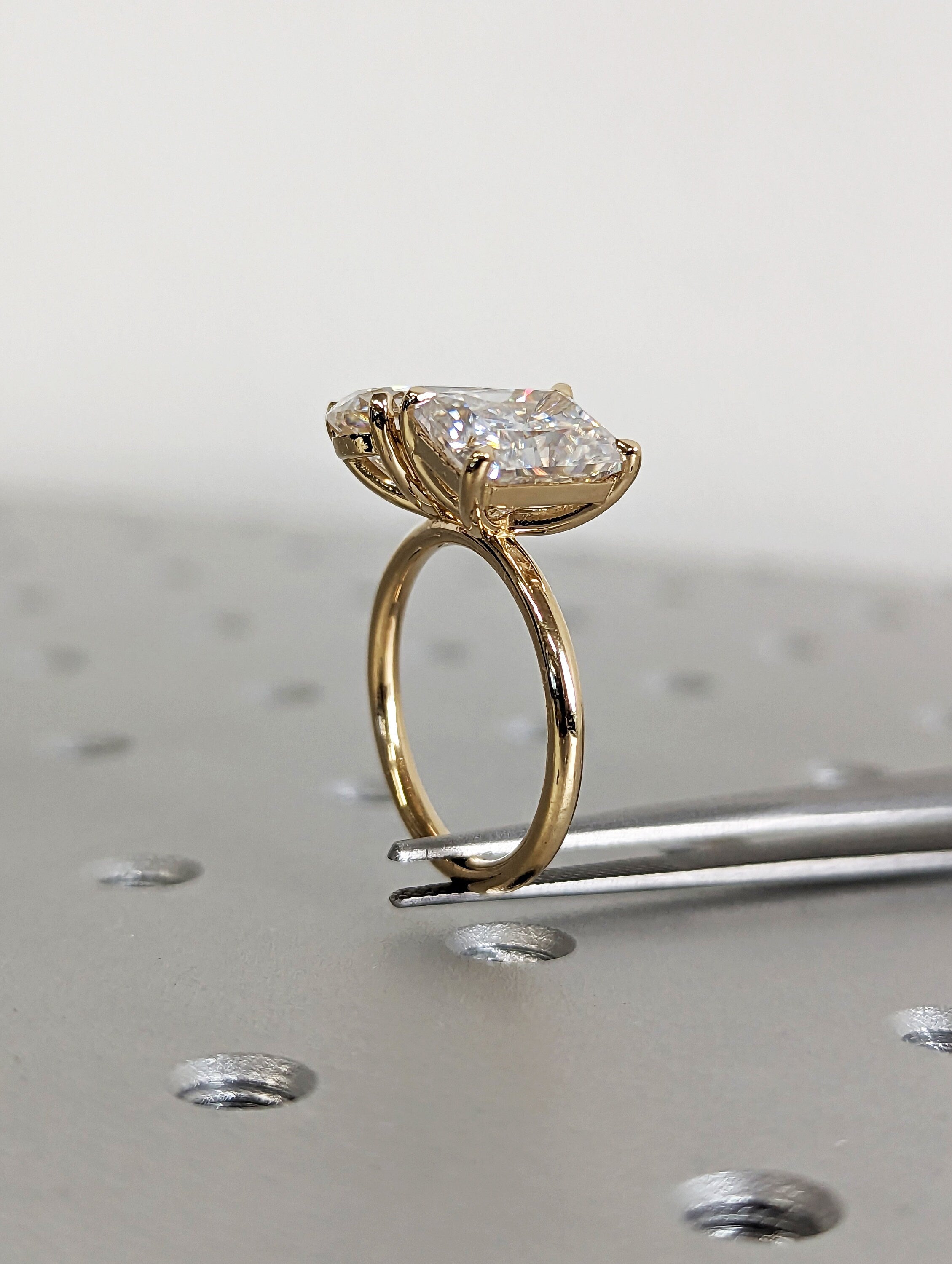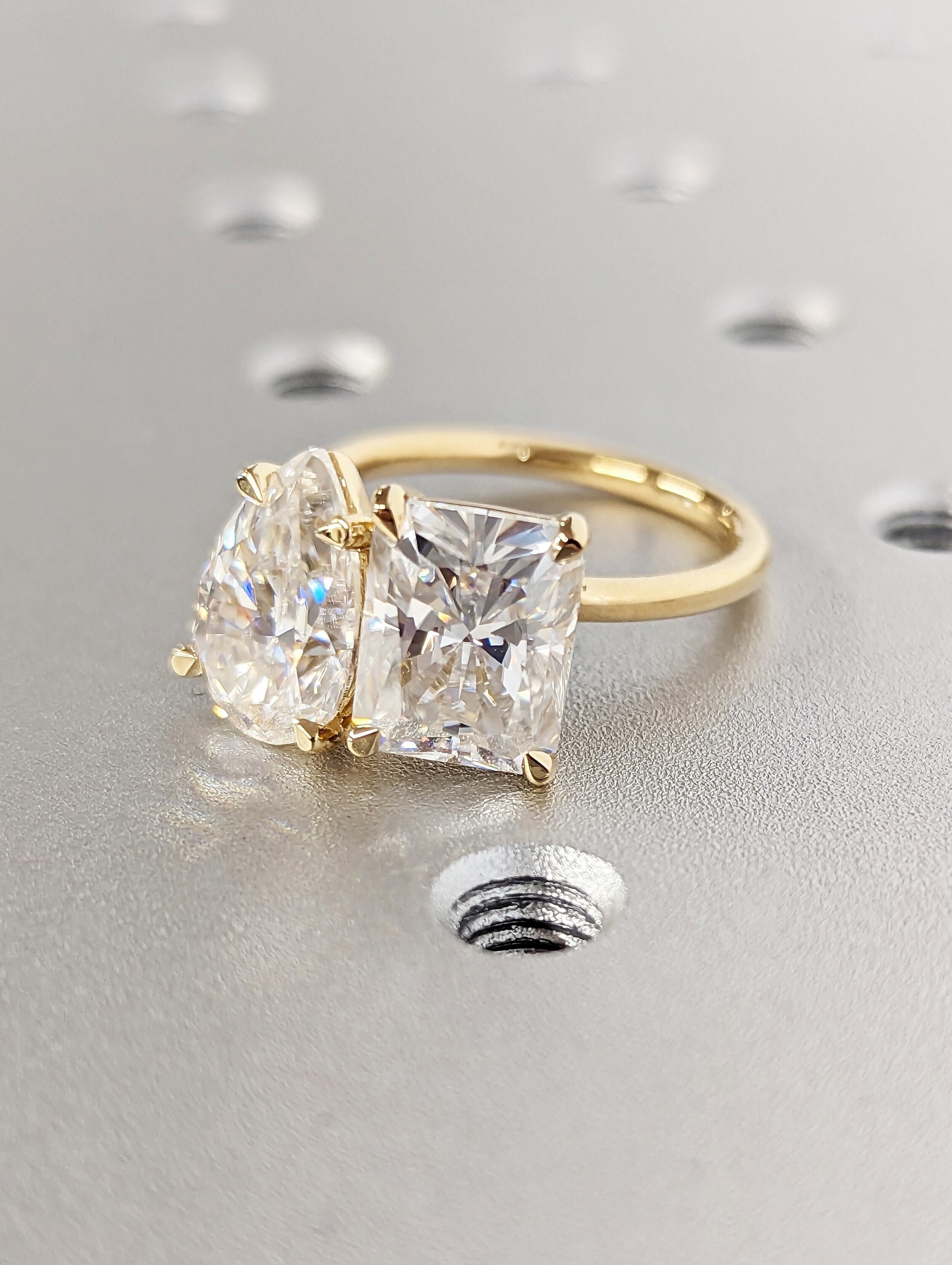 A beautiful dual radiant and pear shaped moissanites, set with a super delicate and thin setting the unique and delicate