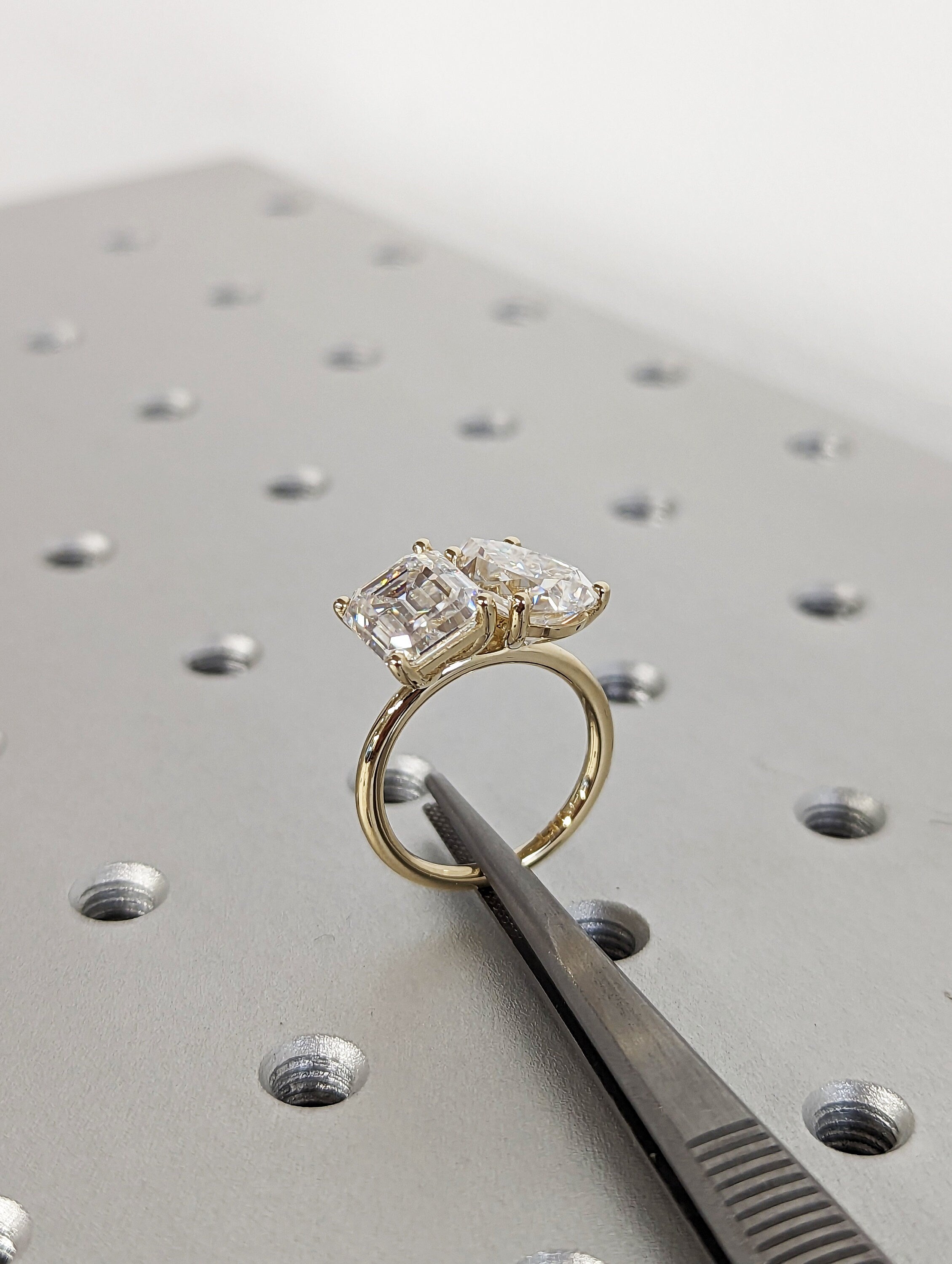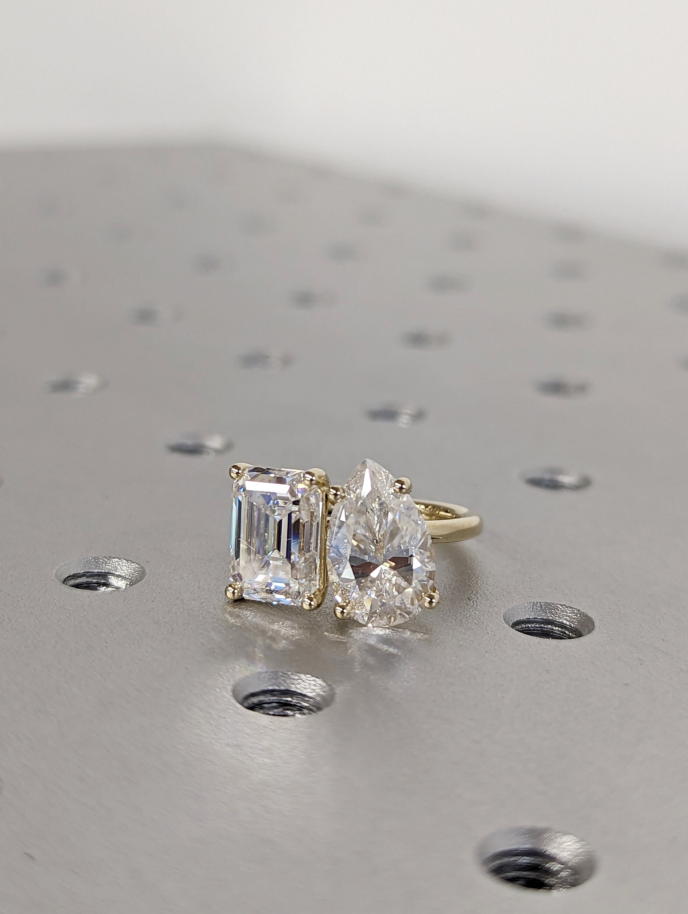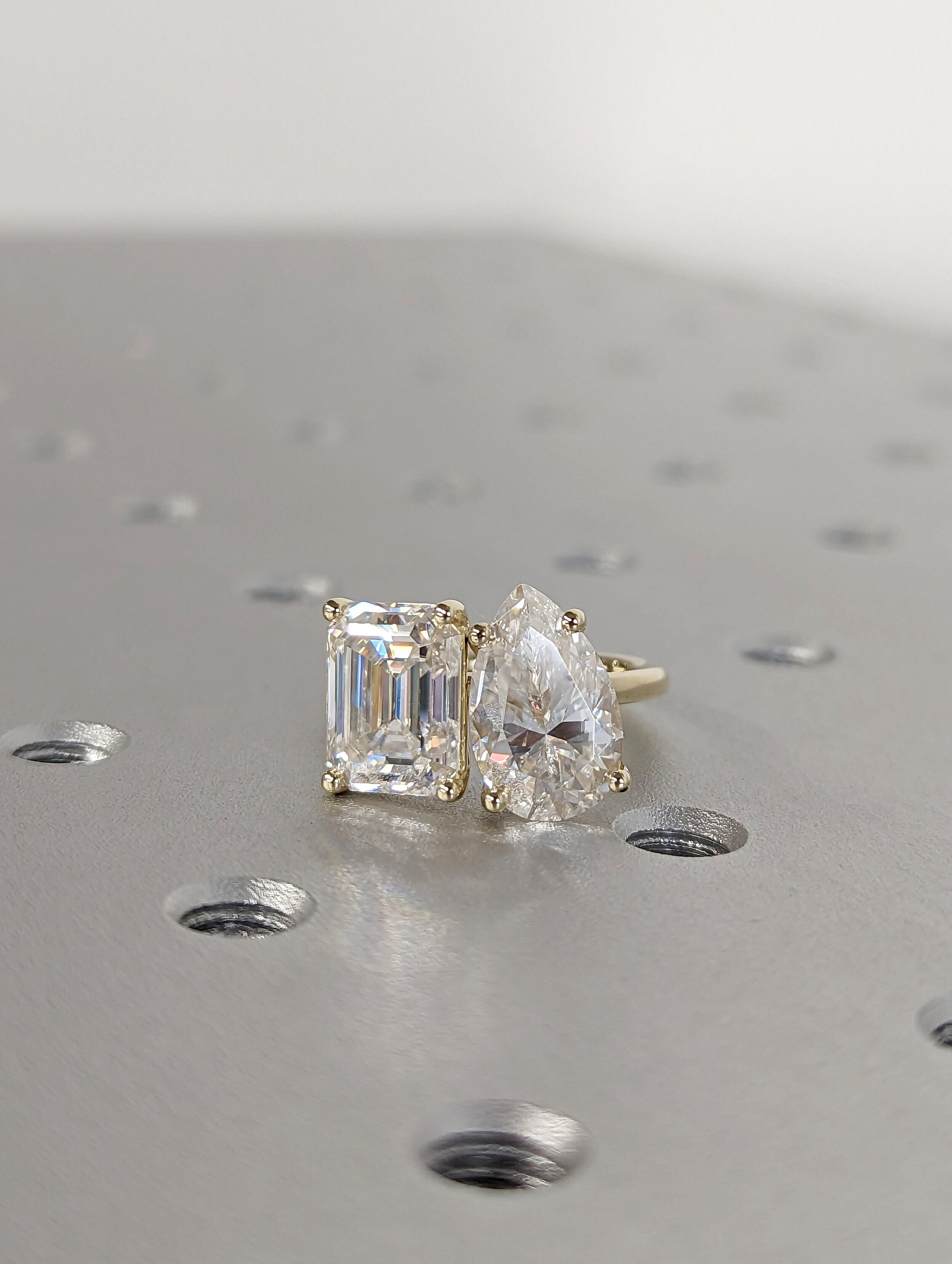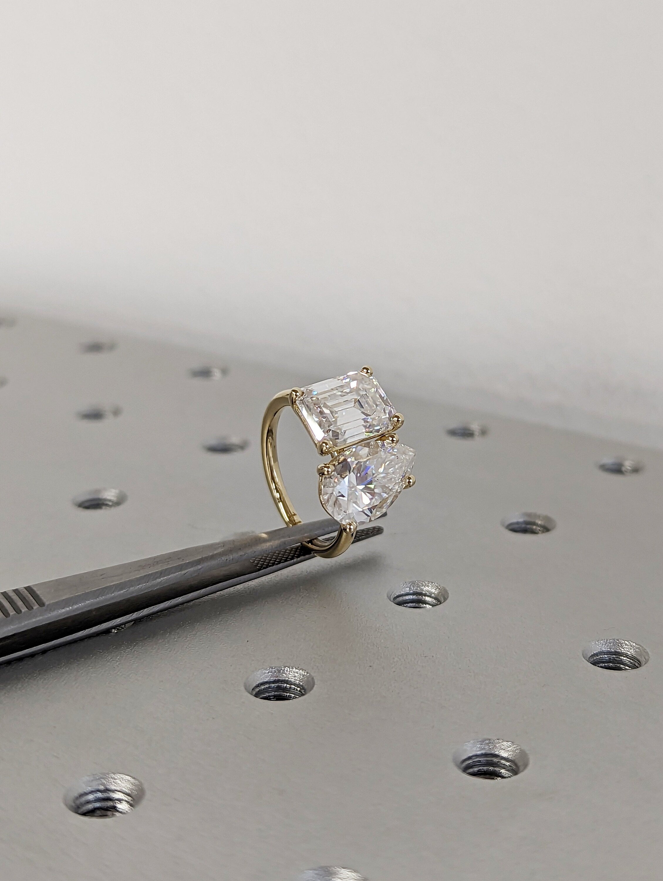 A beautiful dual emerald and pear shaped moissanites, set with a super delicate and thin setting the unique and delicate