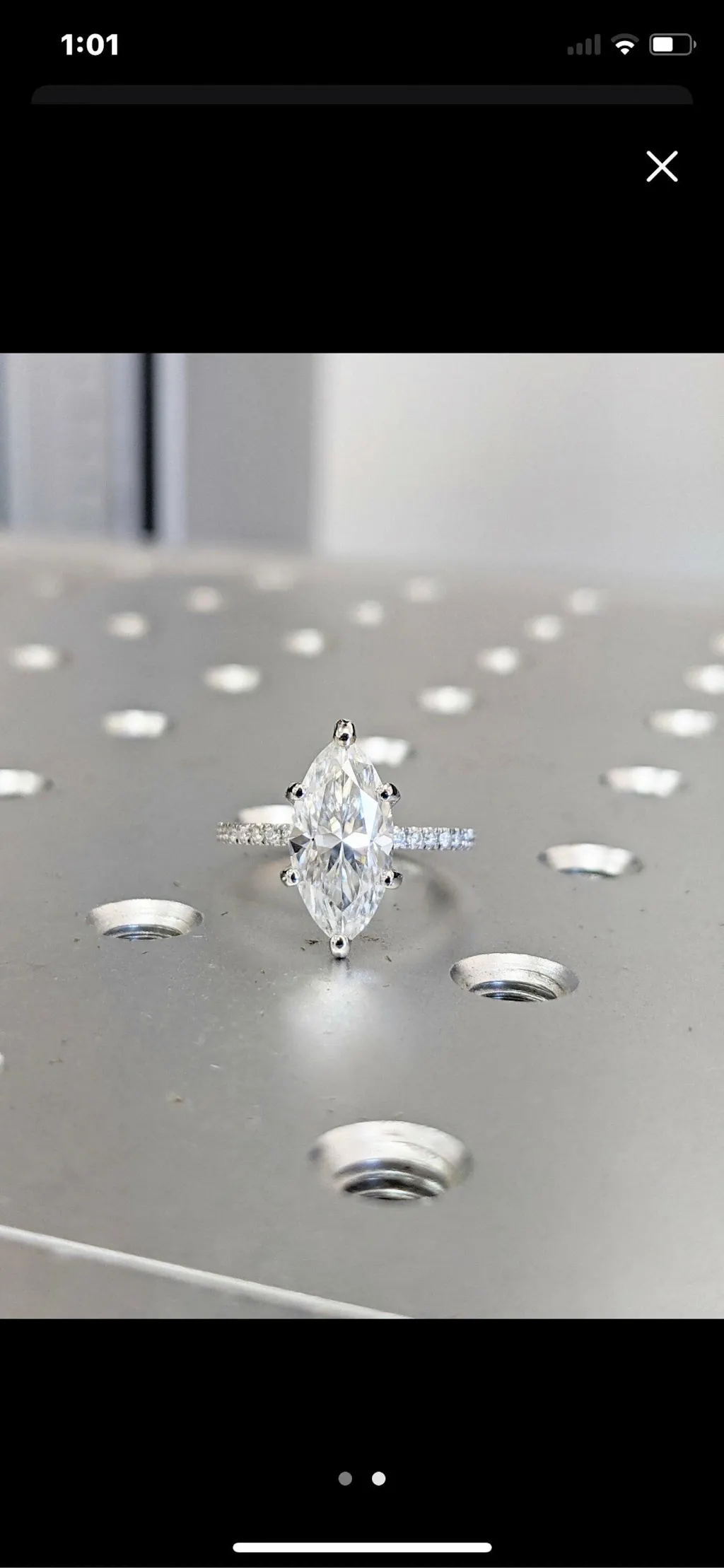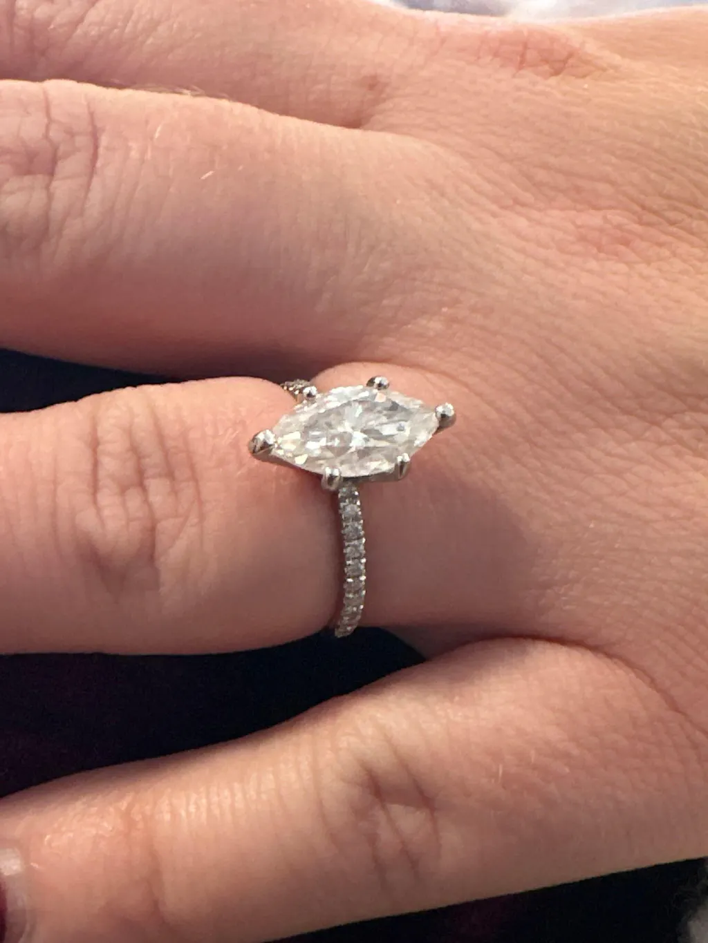 A beautiful marquise shaped moissanite, set with a super delicate and thin setting, paved with a row of moissanites from both sides, a thin band of 1.6mm width, make this ring a true stunner!