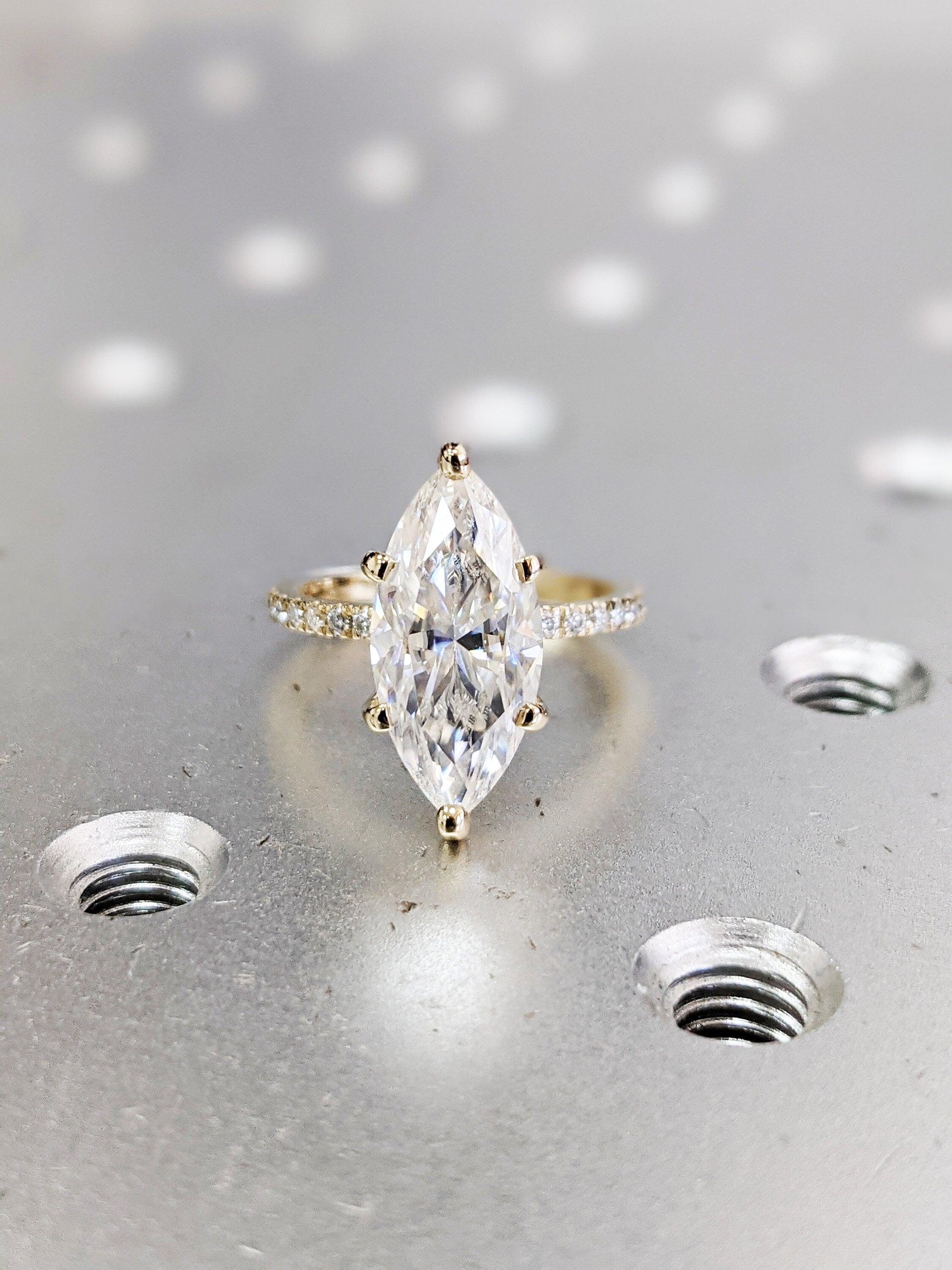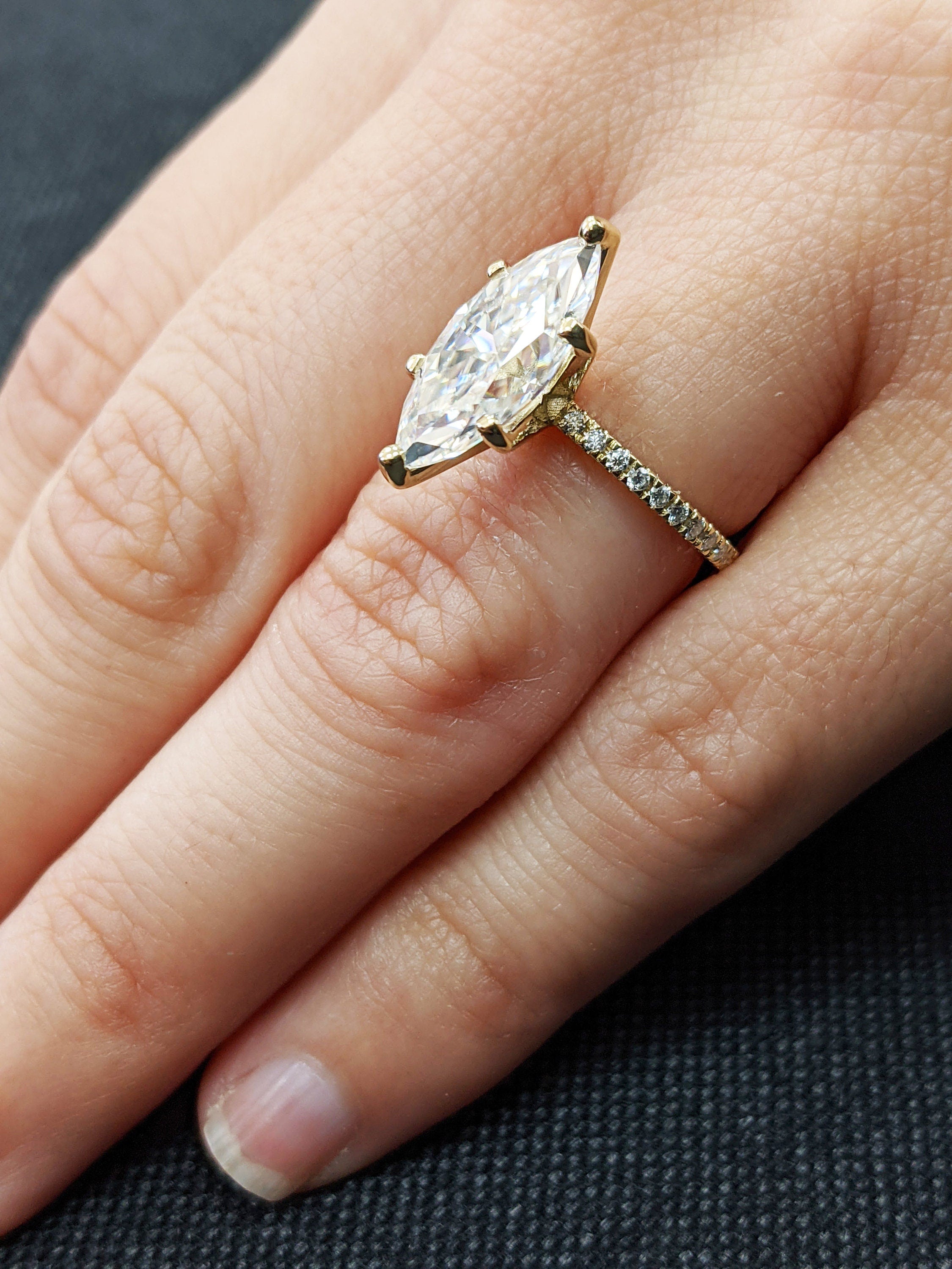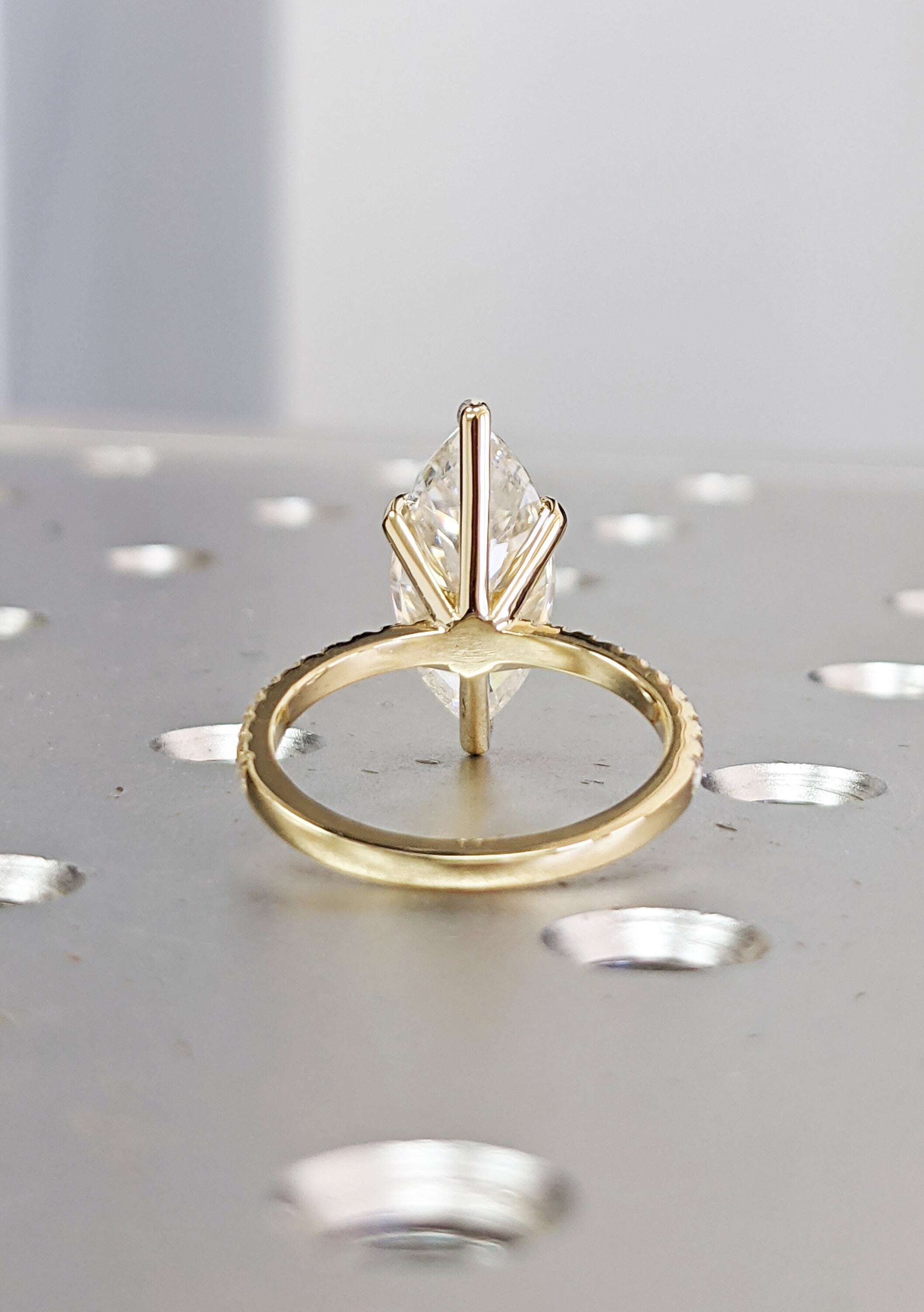 A beautiful marquise shaped moissanite, set with a super delicate and thin setting, paved with a row of moissanites from both sides, a thin band of 1.6mm width, make this ring a true stunner!