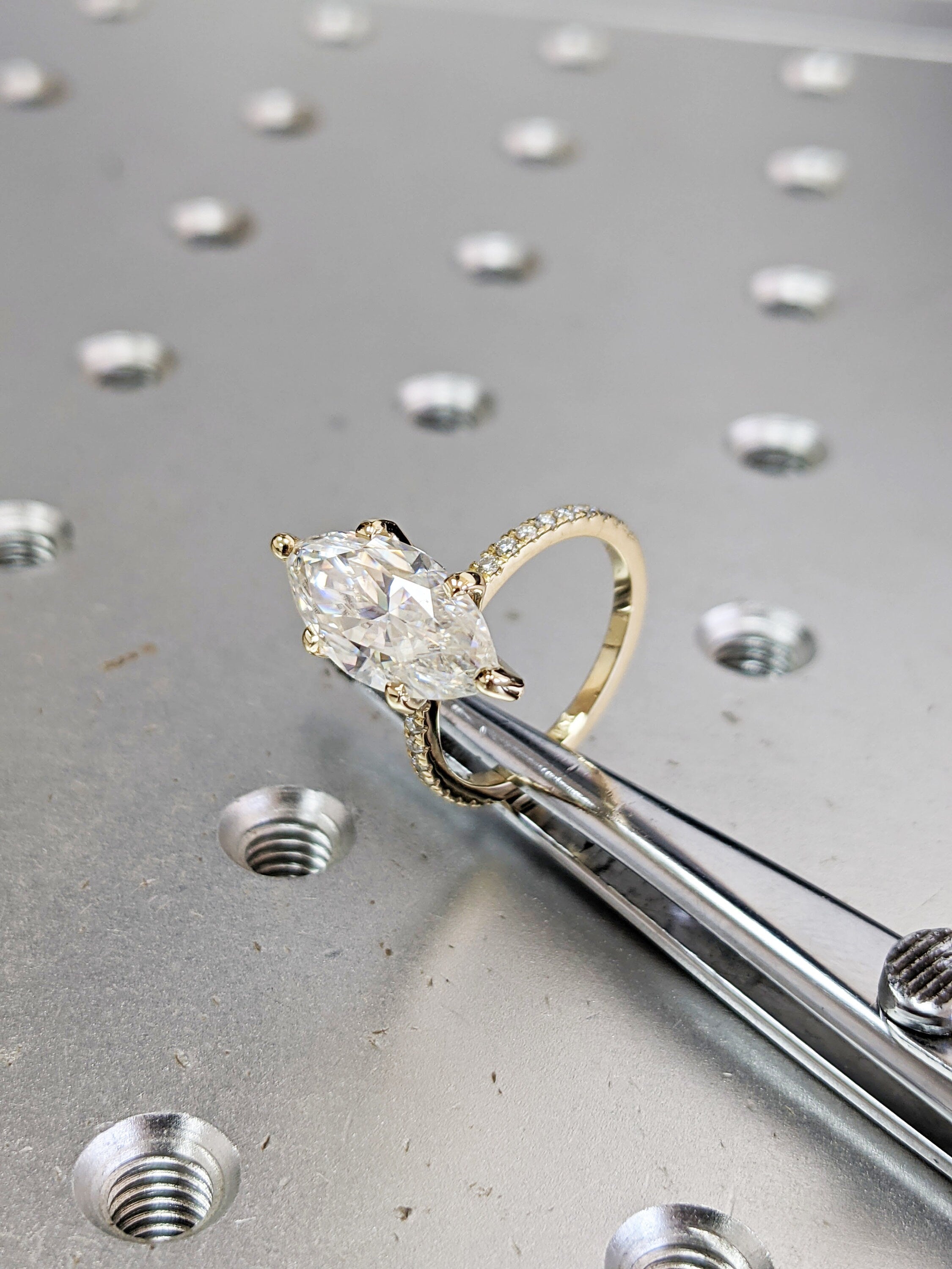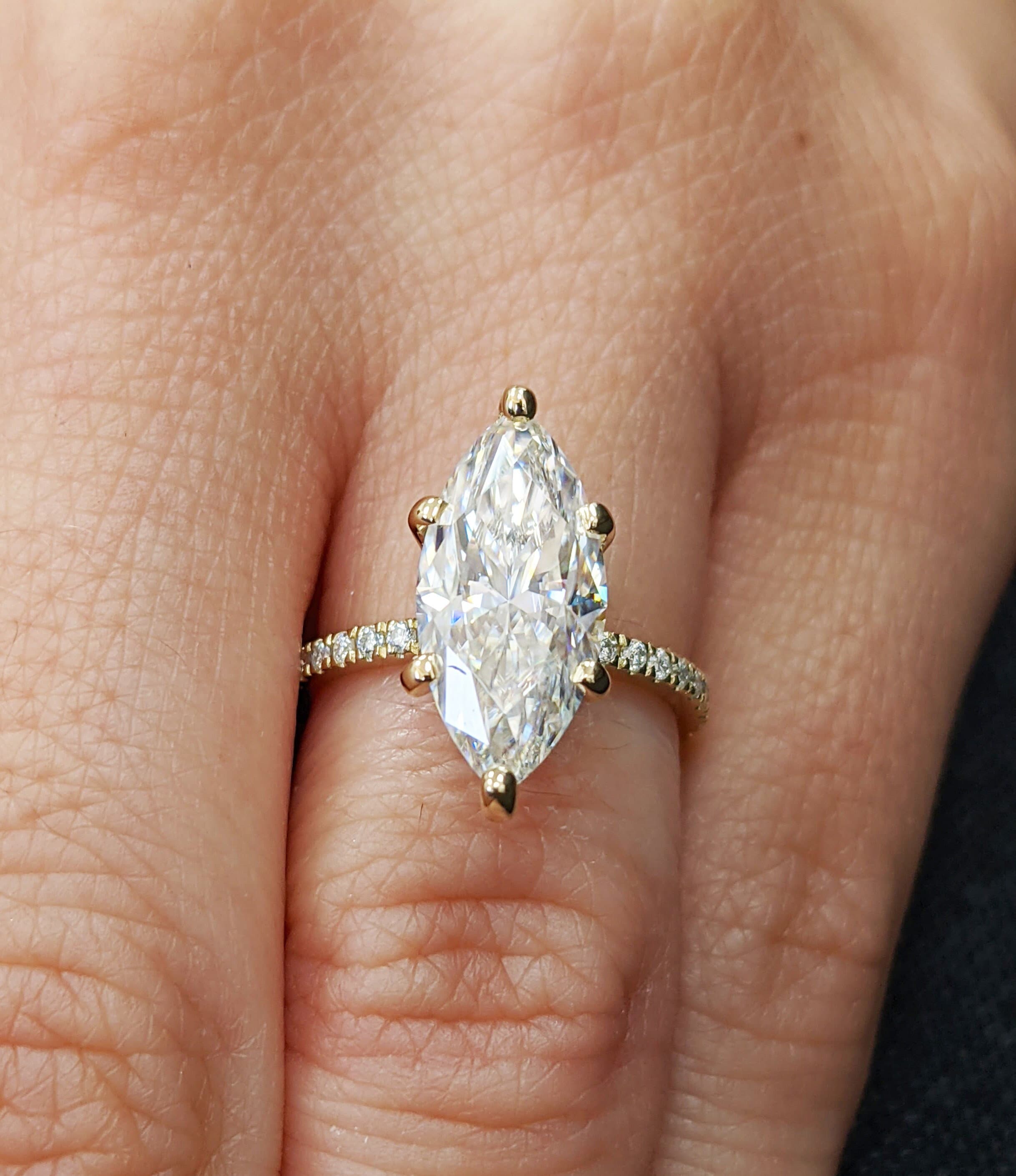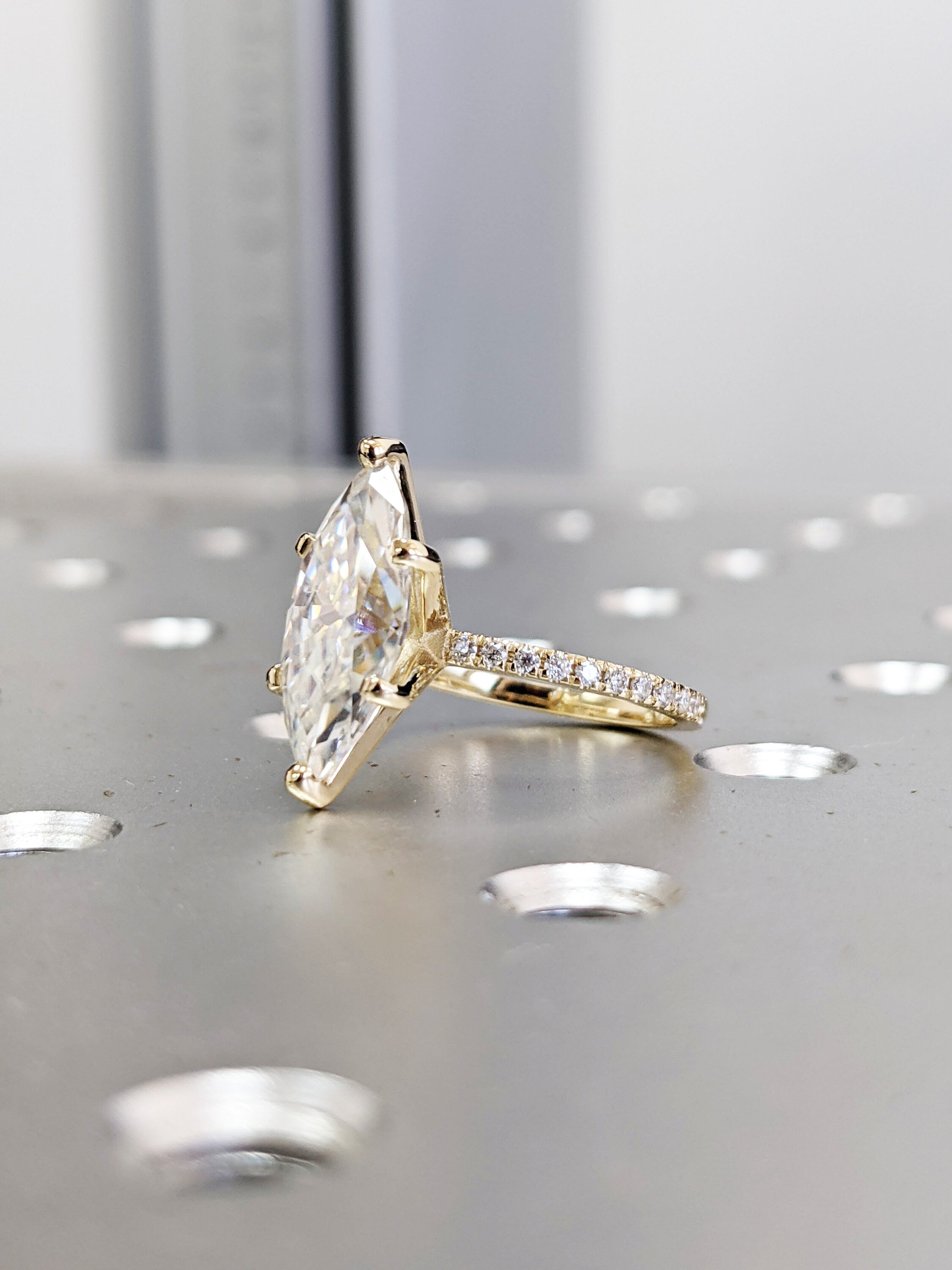 A beautiful marquise shaped moissanite, set with a super delicate and thin setting, paved with a row of moissanites from both sides, a thin band of 1.6mm width, make this ring a true stunner!