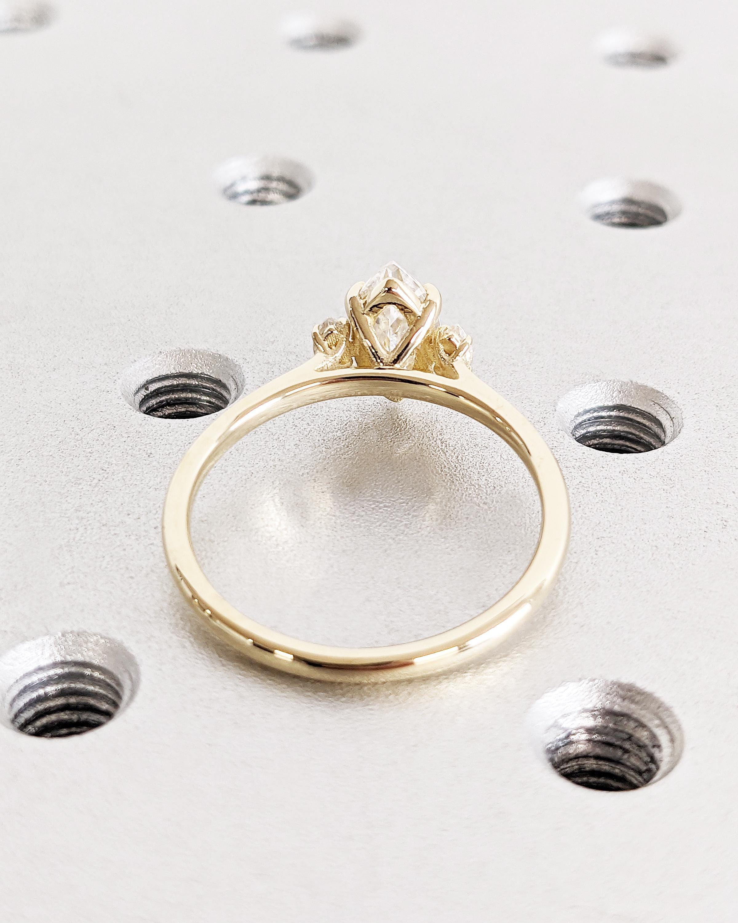 A romantic marquise cut center stone is complemented by two marquise side stones in this balanced, three-stone design. Three stones are a timeless symbol of your shared past, present, and future. The side stones are available in lab diamond, moissanite, or natural diamond. A graceful and heartfelt choice a meaningful proposal, or lasting reminder of a special bond.