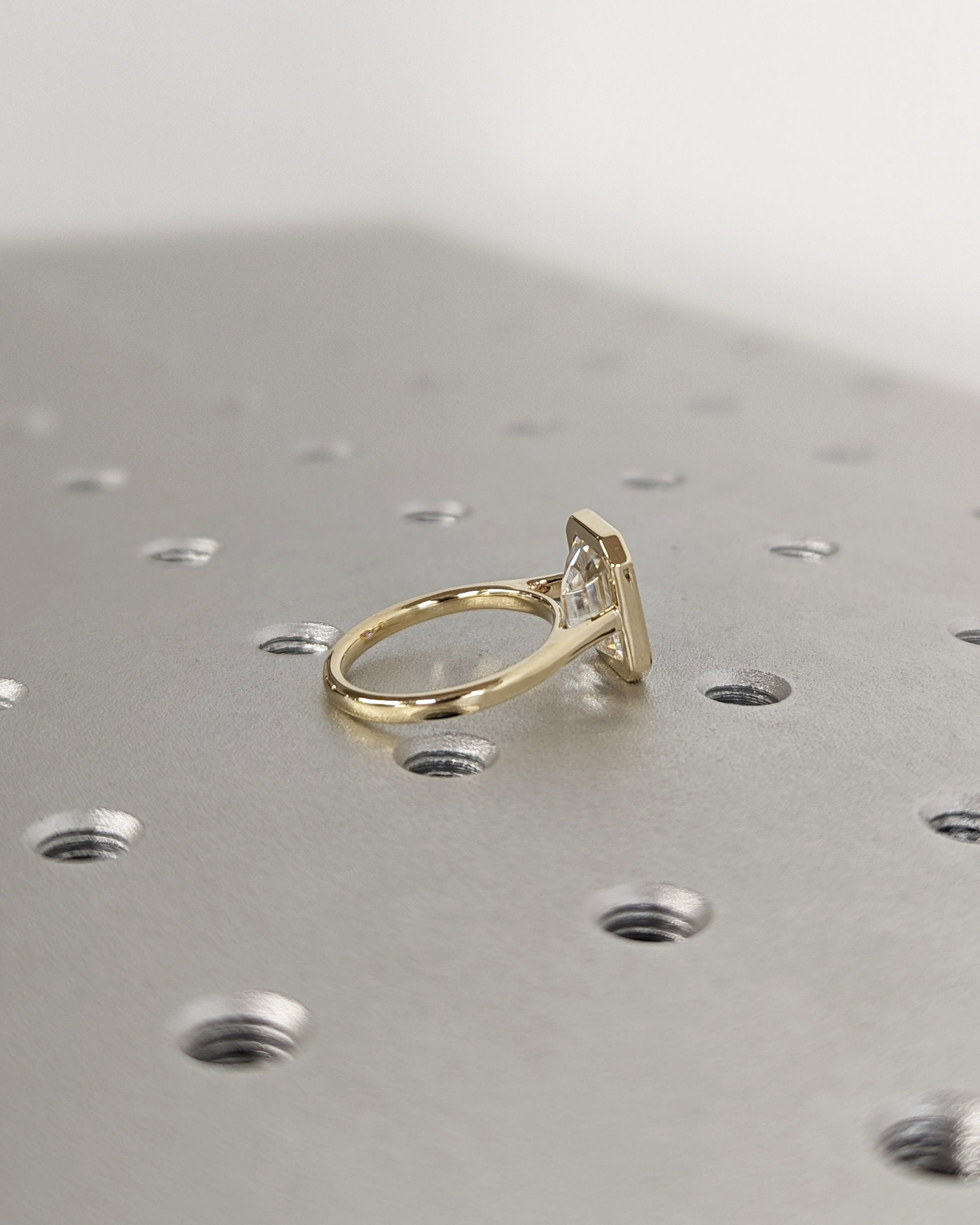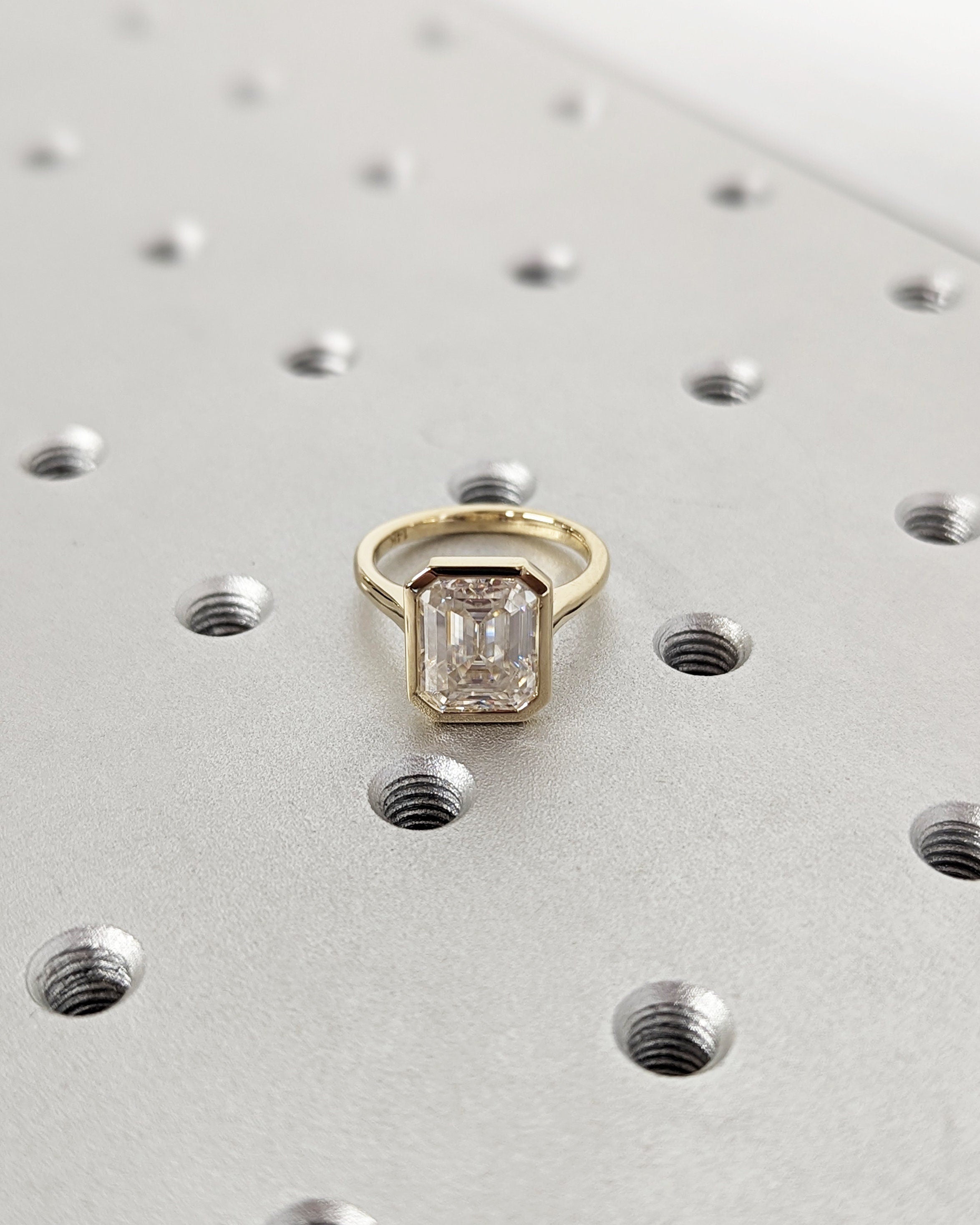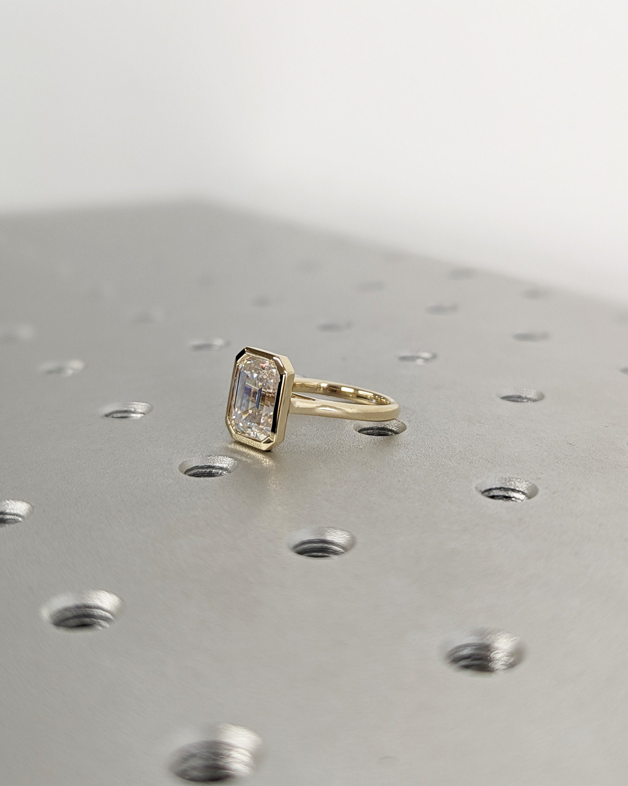 Explore a world of elegance with our emerald cut gemstone engagement ring, graced by a bezel setting for a modern twist. The slender 2.15mm shank adds a touch of sophistication to this exquisite token of love.