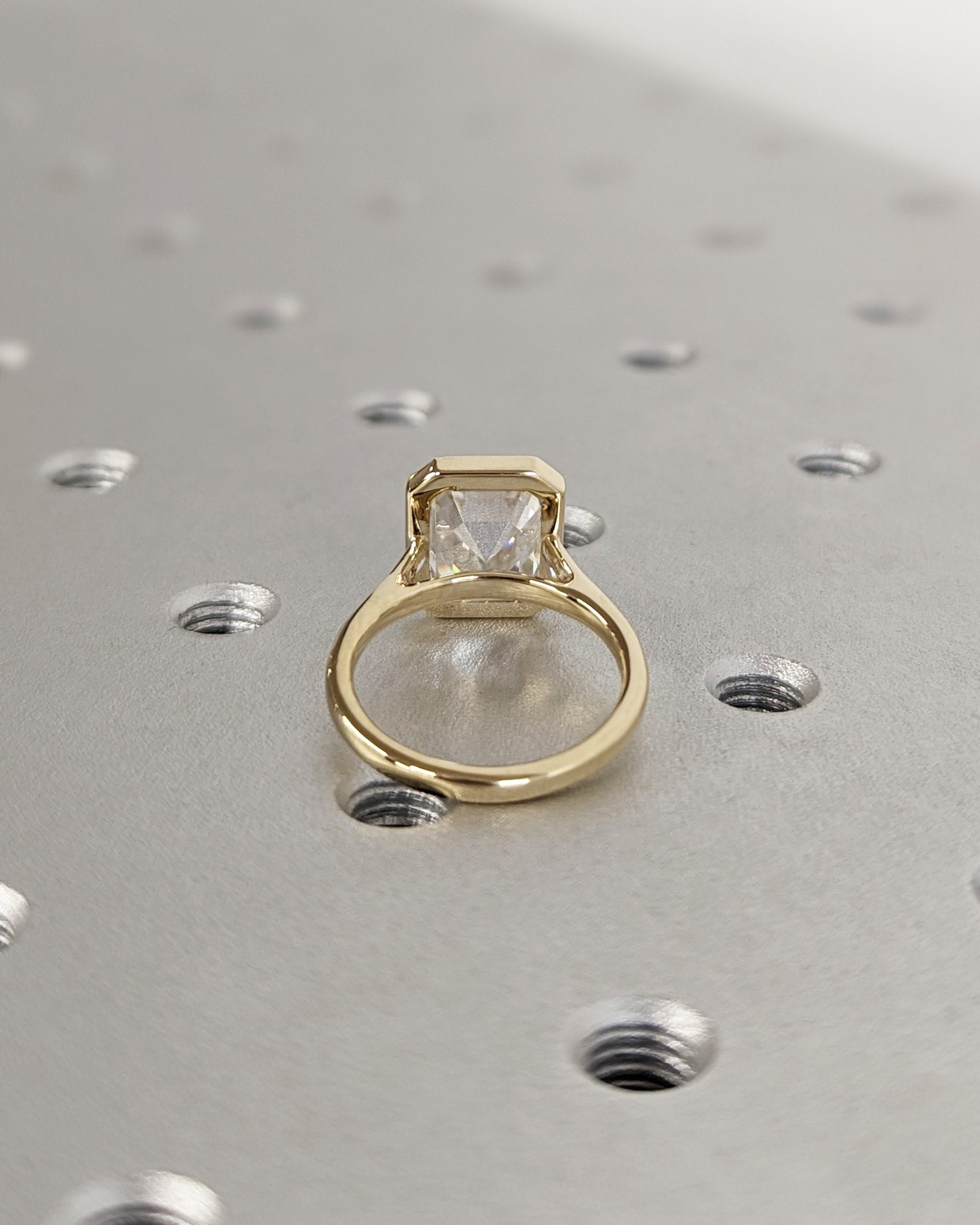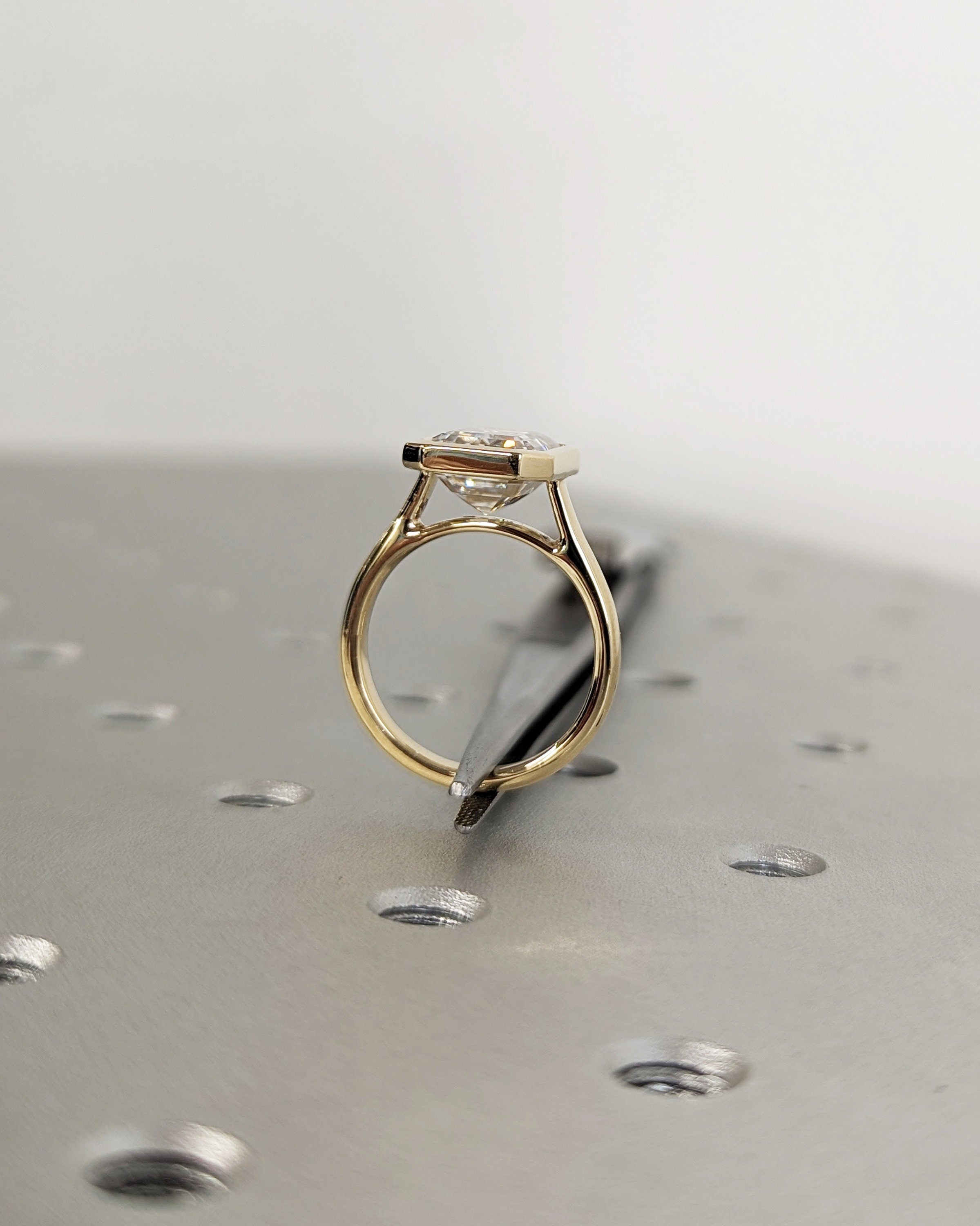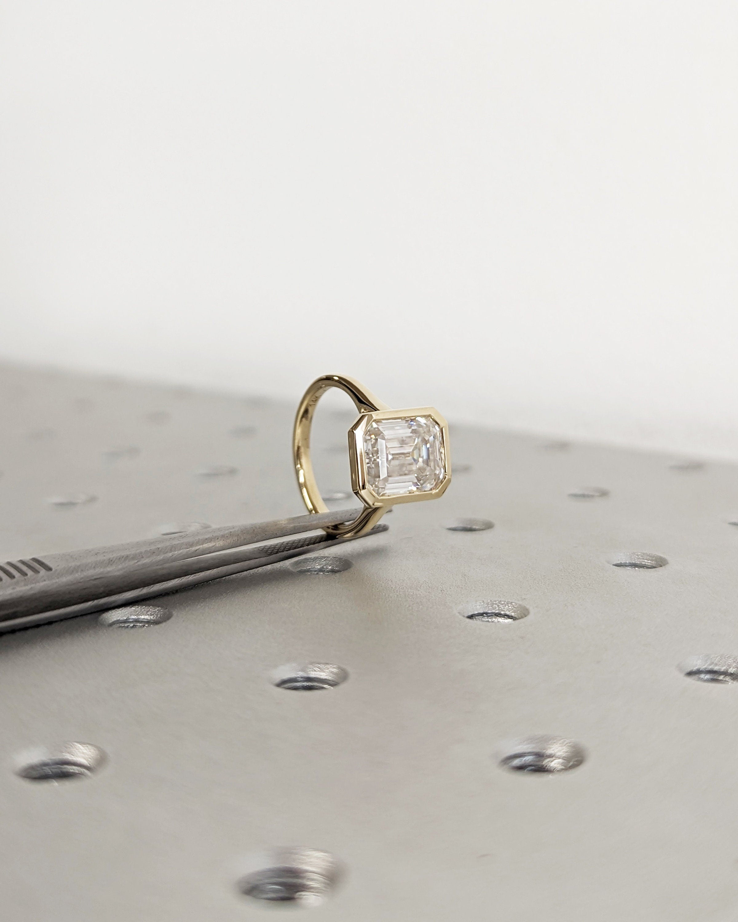 Explore a world of elegance with our emerald cut gemstone engagement ring, graced by a bezel setting for a modern twist. The slender 2.15mm shank adds a touch of sophistication to this exquisite token of love.