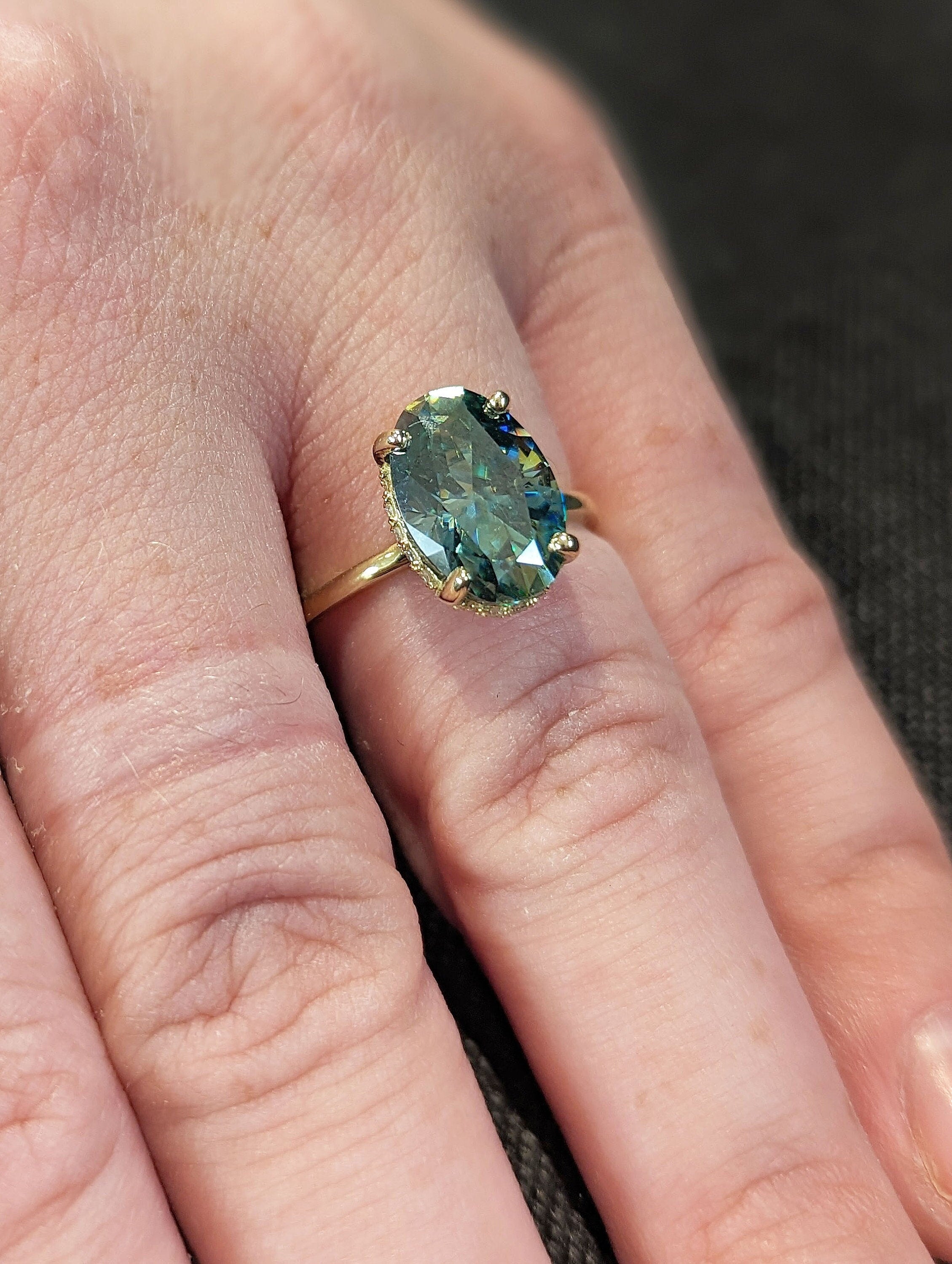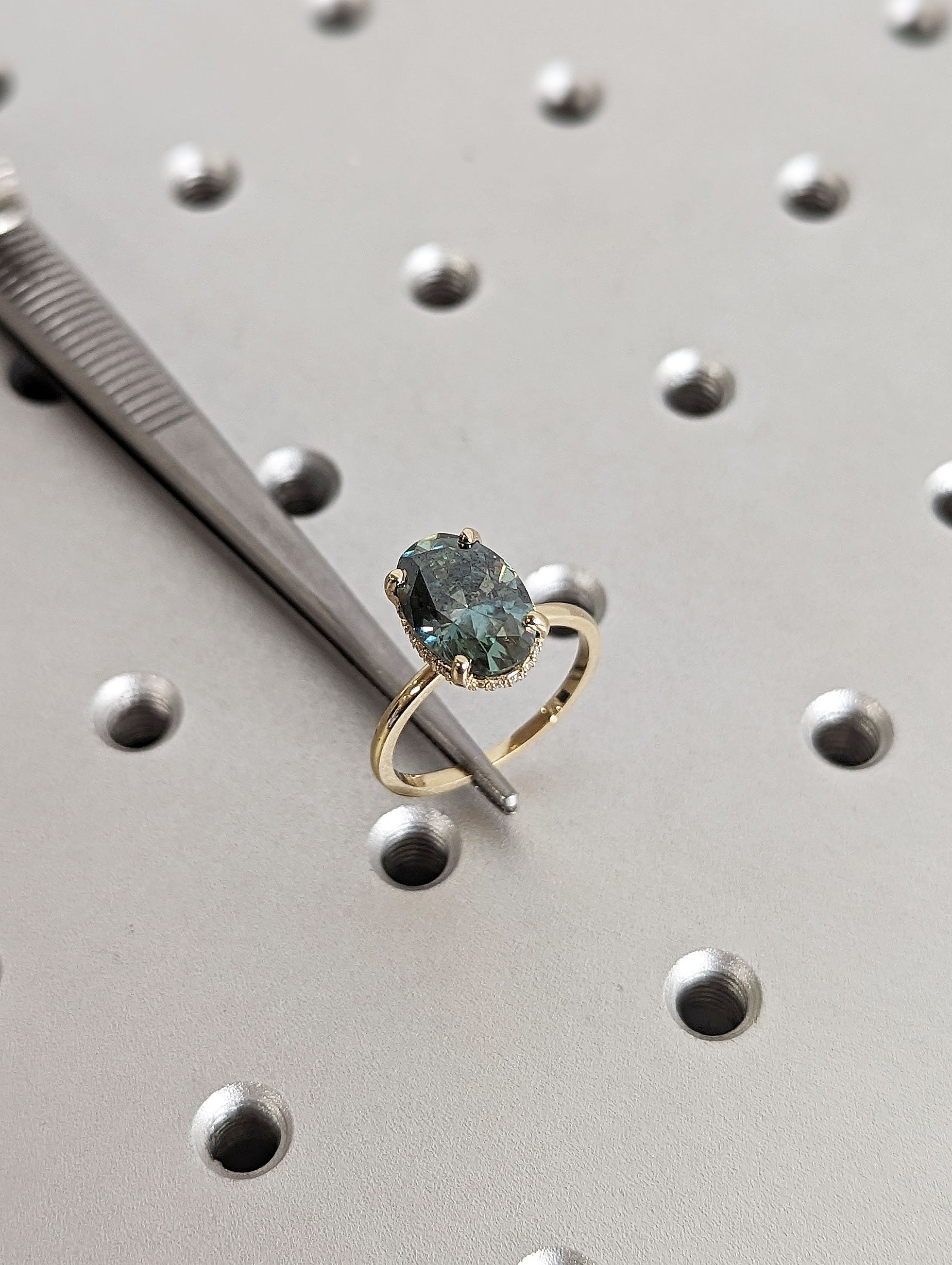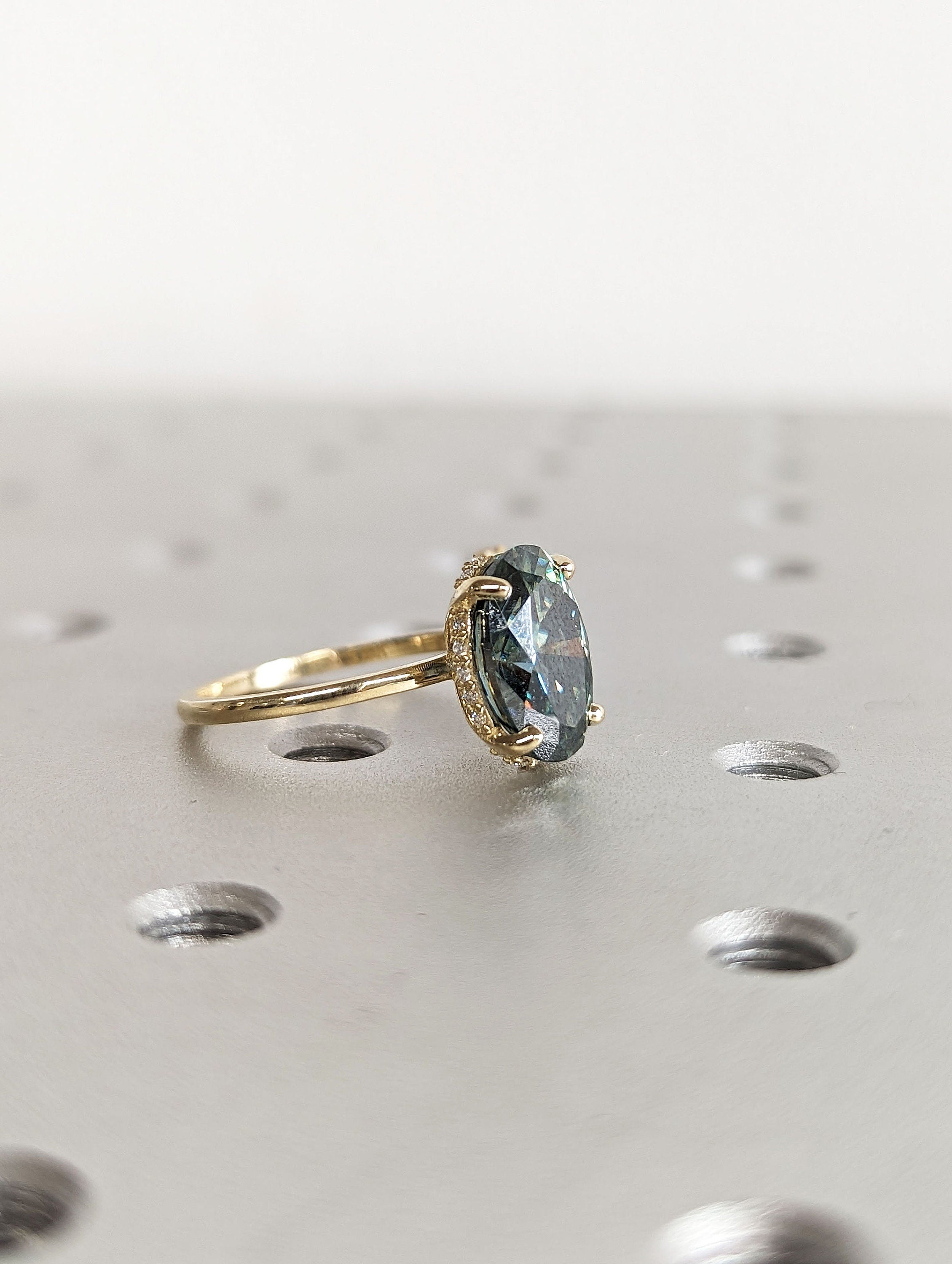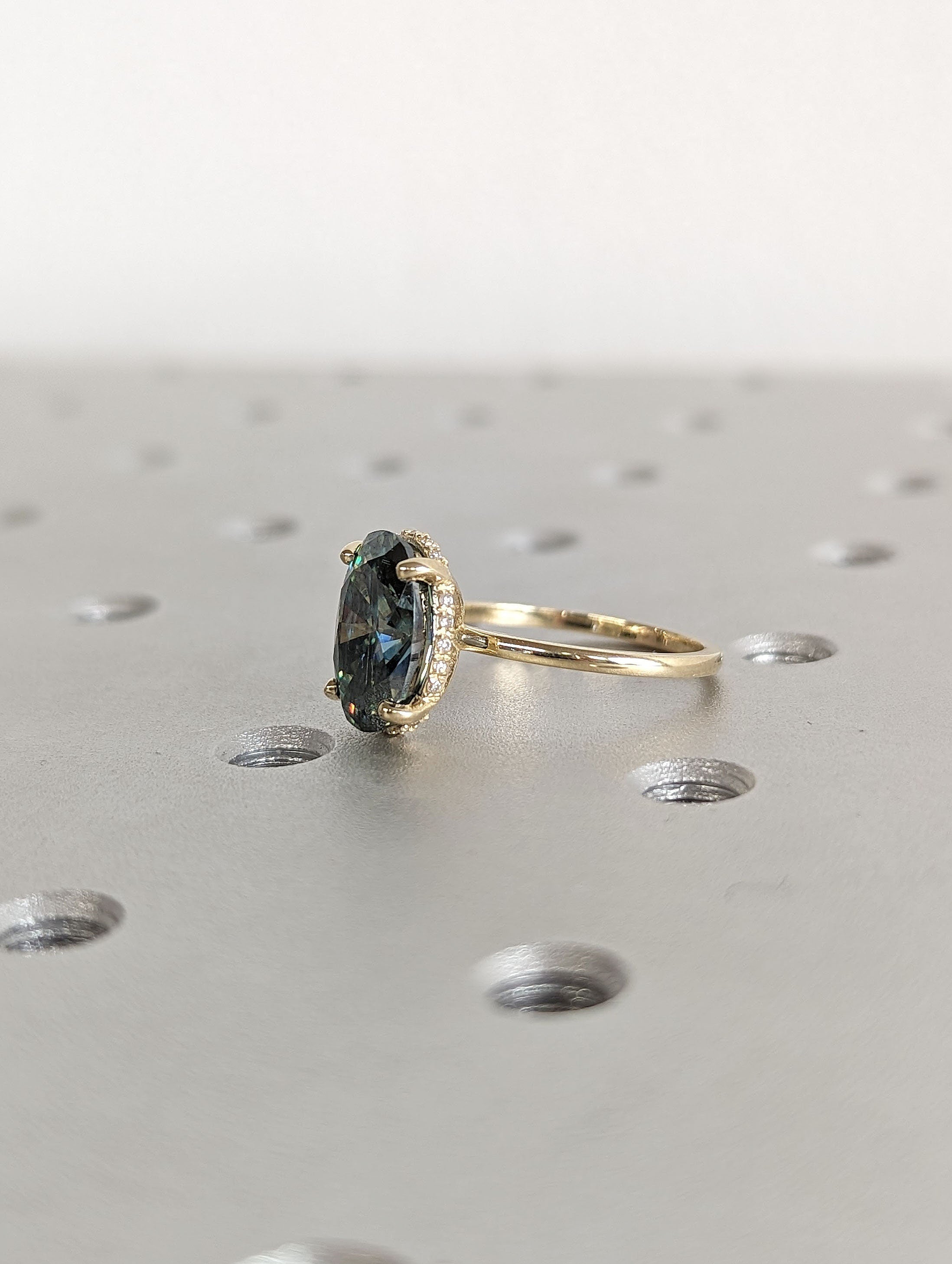 A beautiful oval shaped Moissanite, set with a super delicate and thin setting, atop a paved moissanites hidden halo on a thin band of 1.6mm width. With its alluring blue green hue, this simple and elegant handcrafted statement ring is a great addition to your jewelry collection.