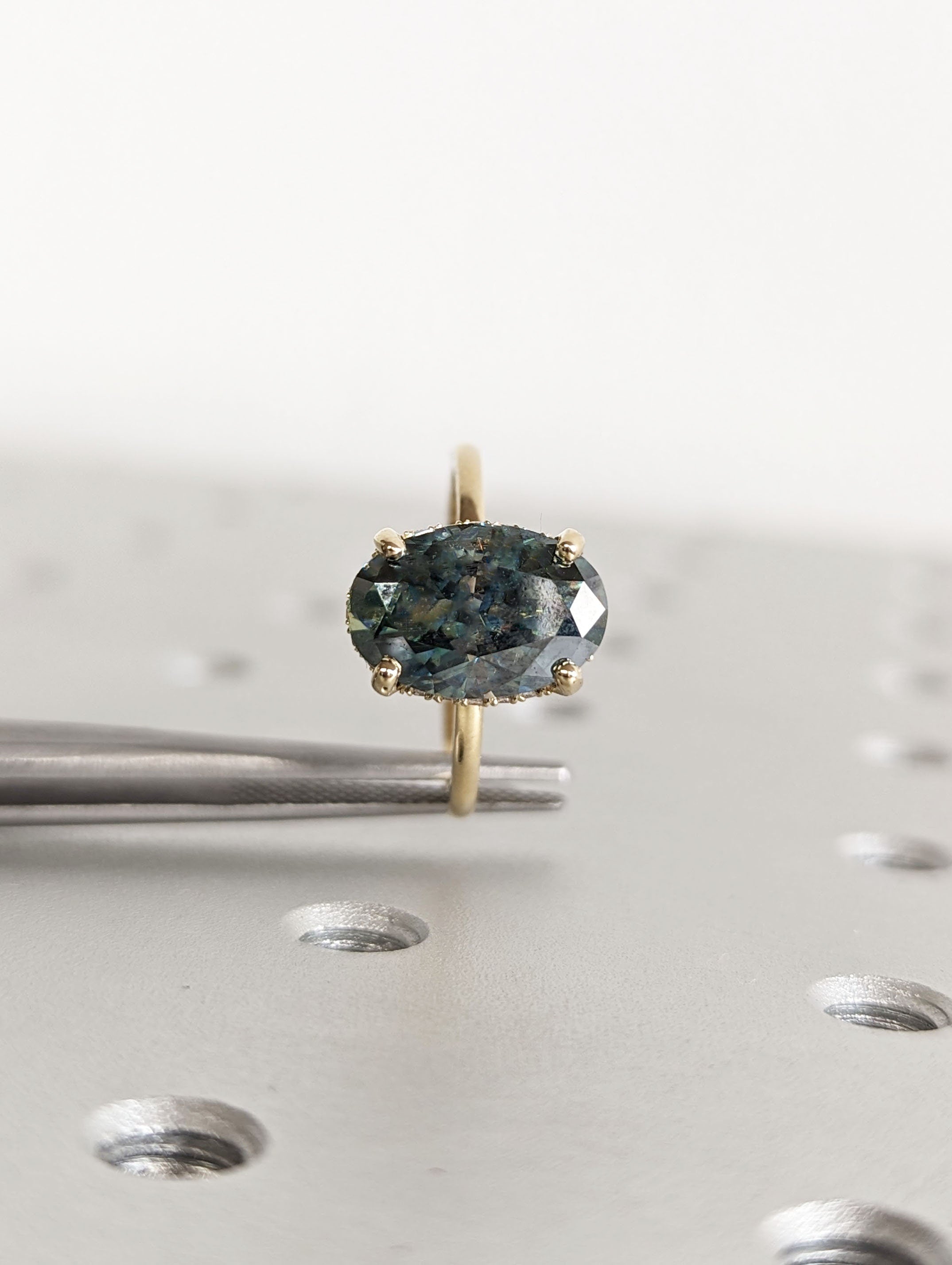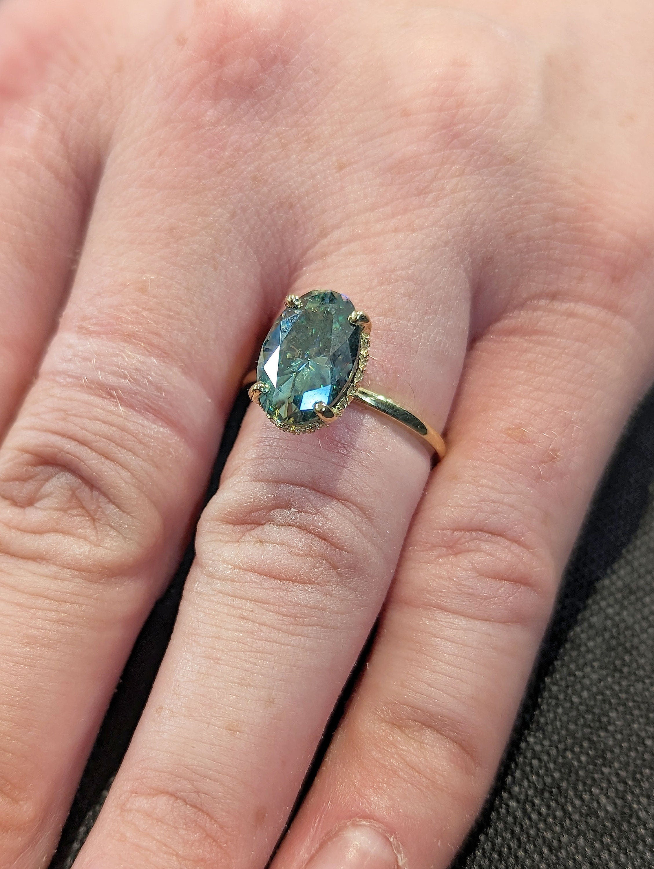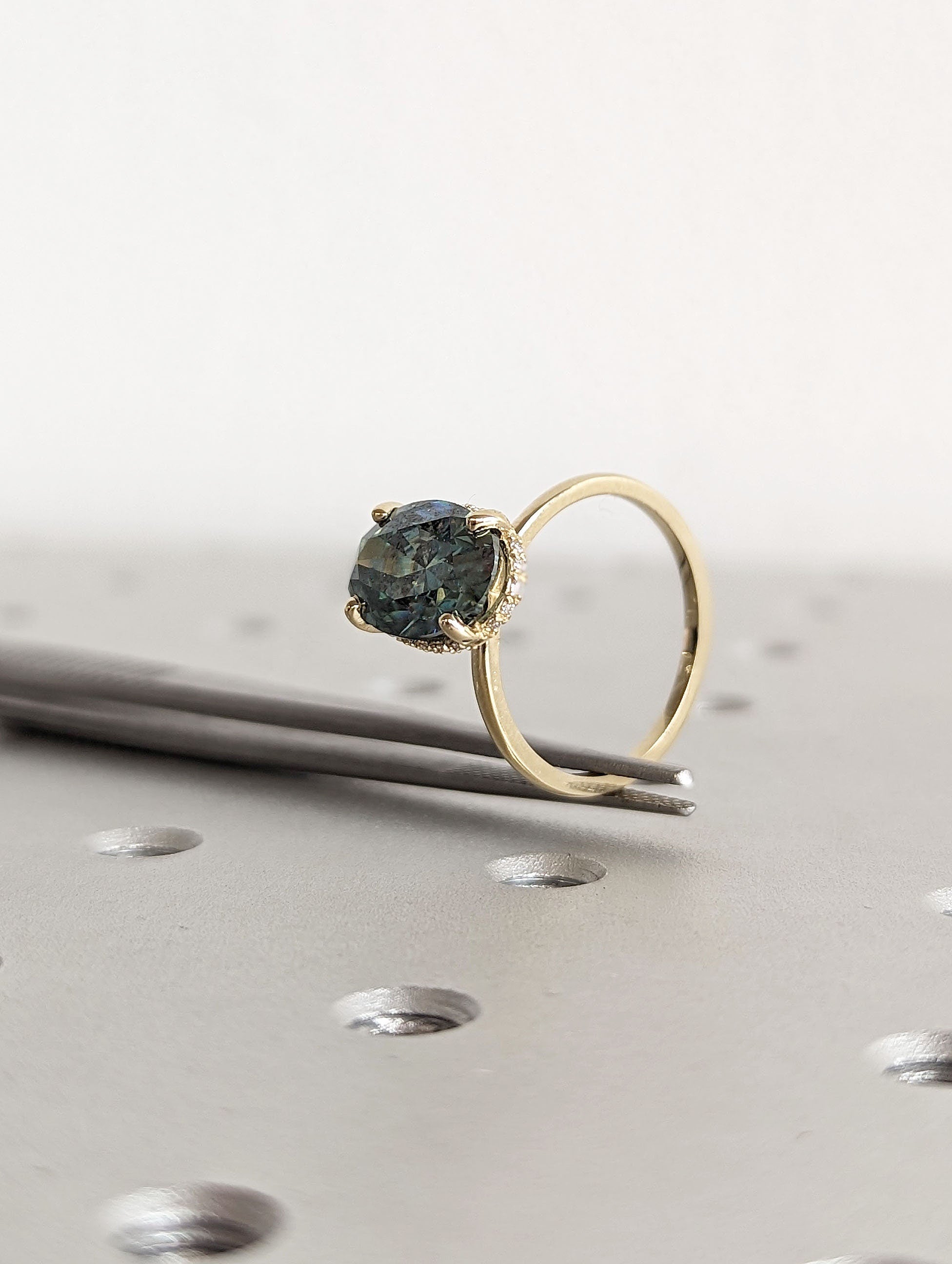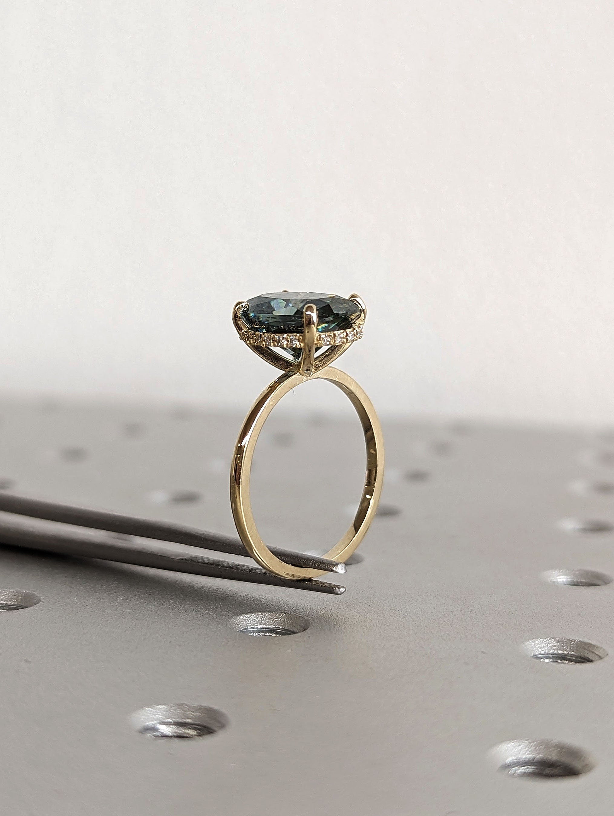 A beautiful oval shaped Moissanite, set with a super delicate and thin setting, atop a paved moissanites hidden halo on a thin band of 1.6mm width. With its alluring blue green hue, this simple and elegant handcrafted statement ring is a great addition to your jewelry collection.