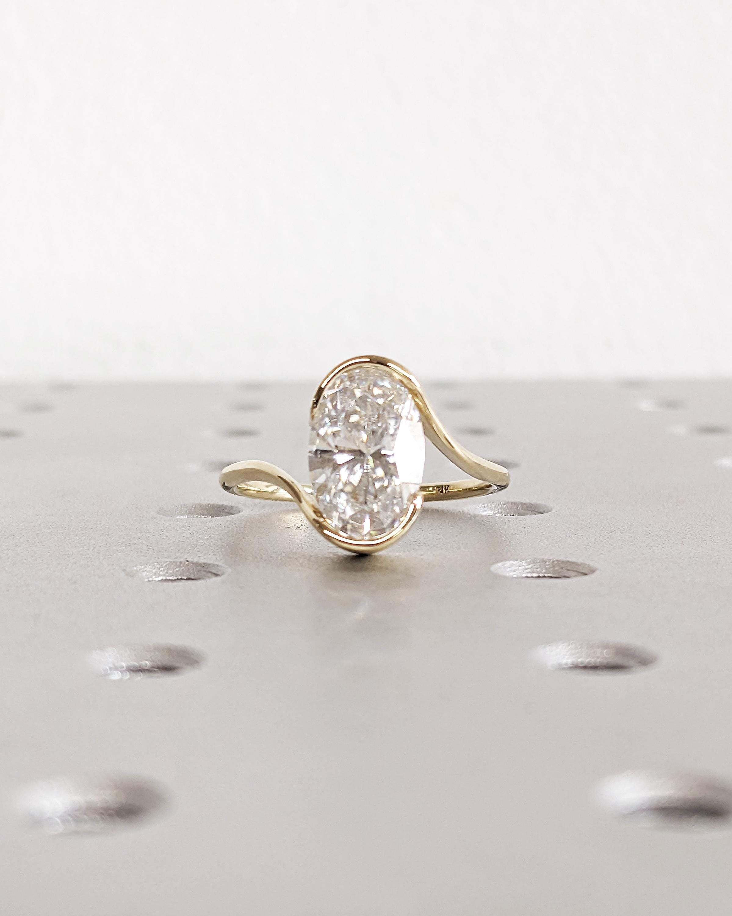 Modern and unique, a bezel set bypass ring featuring an oval cut lab Diamond center stone, set on a dainty 1.6mm width band. This minimalist yet trendy statement ring makes it a wonderful complementing jewelry for any occasion.
