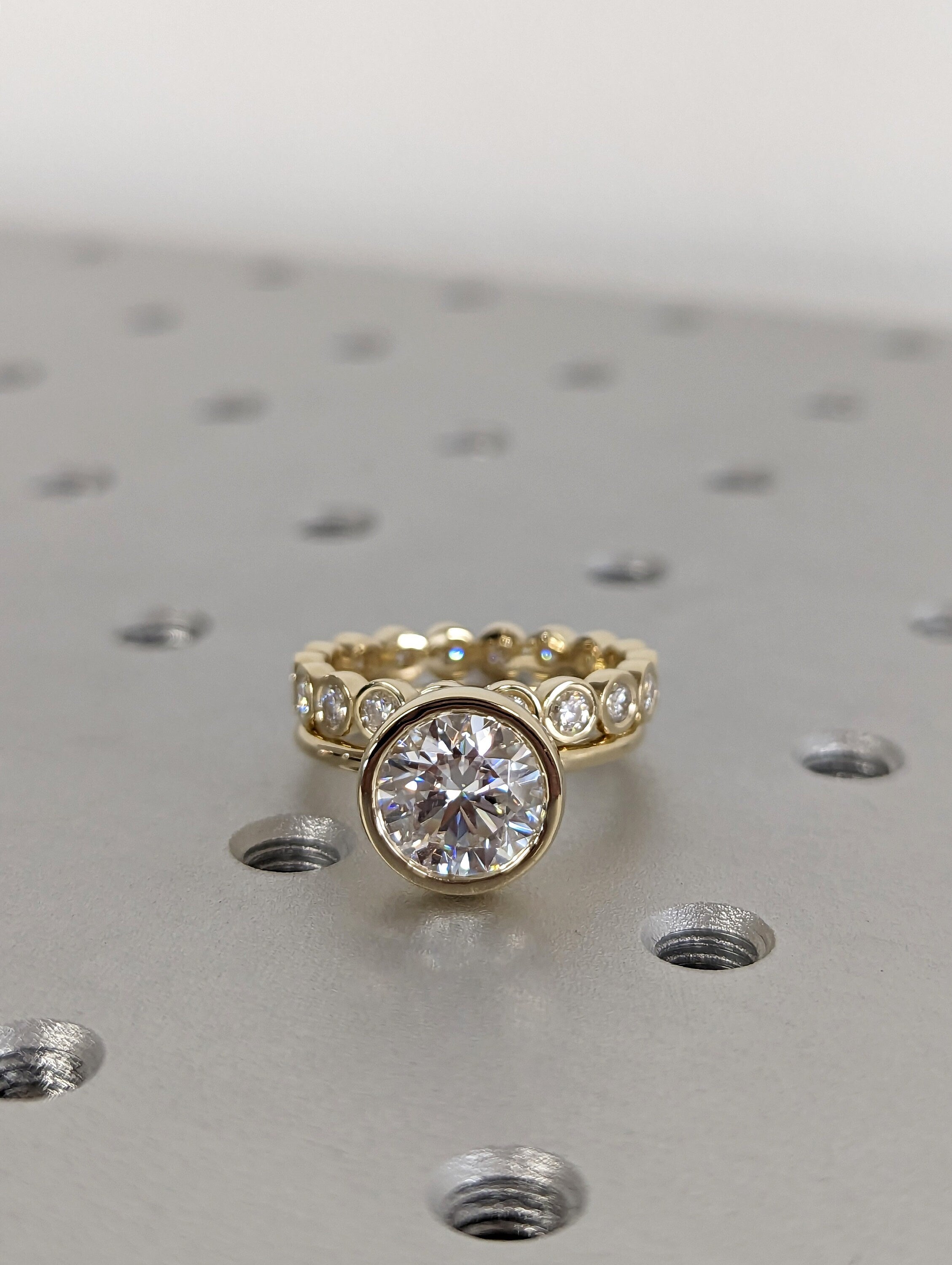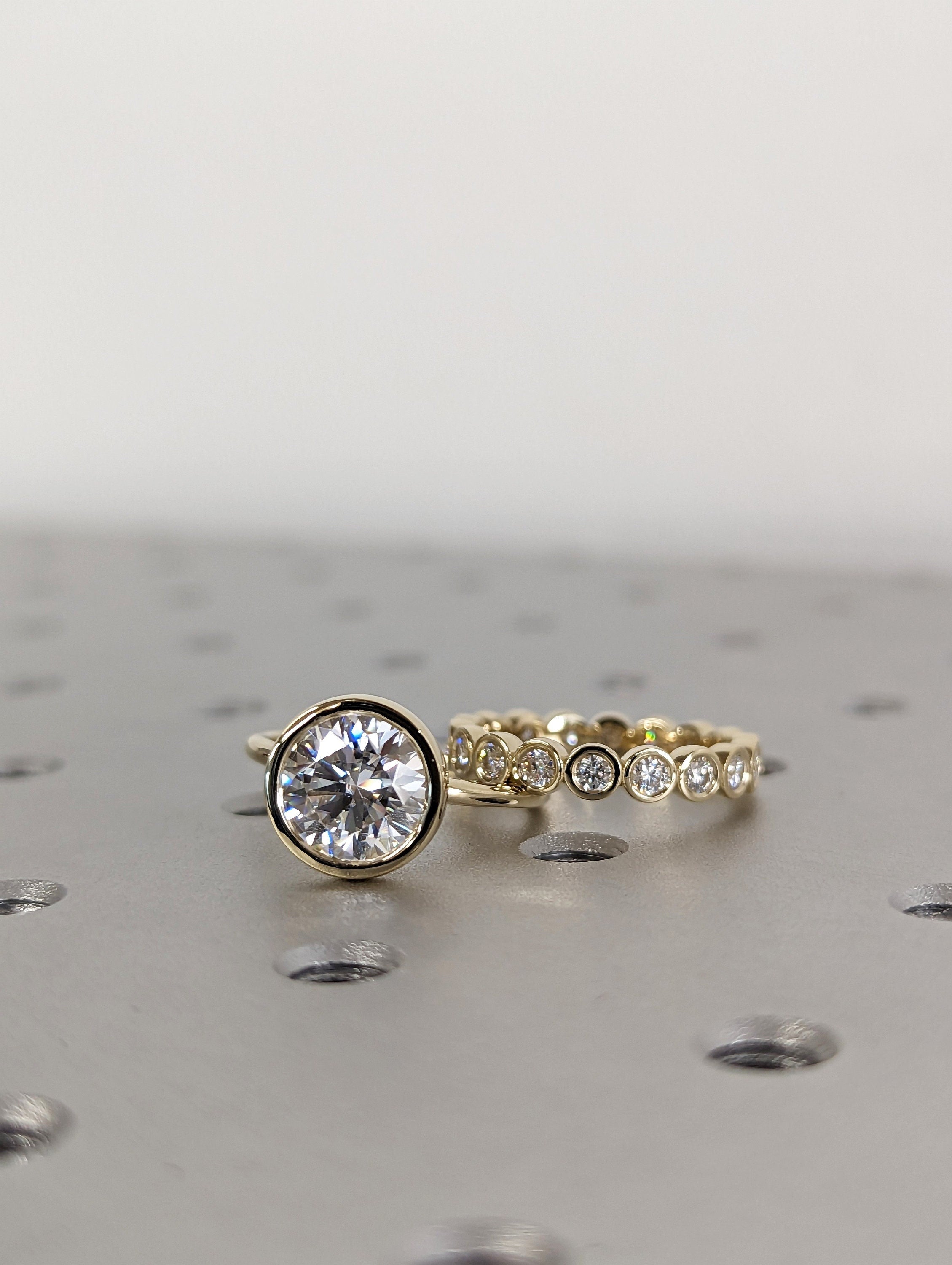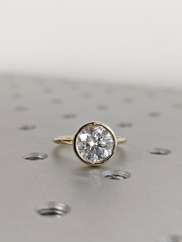 Understated and elegant, this sophisticated engagement ring features a round bezel setting atop a delicate rounded band. Can be matched with a full eternity diamond band.