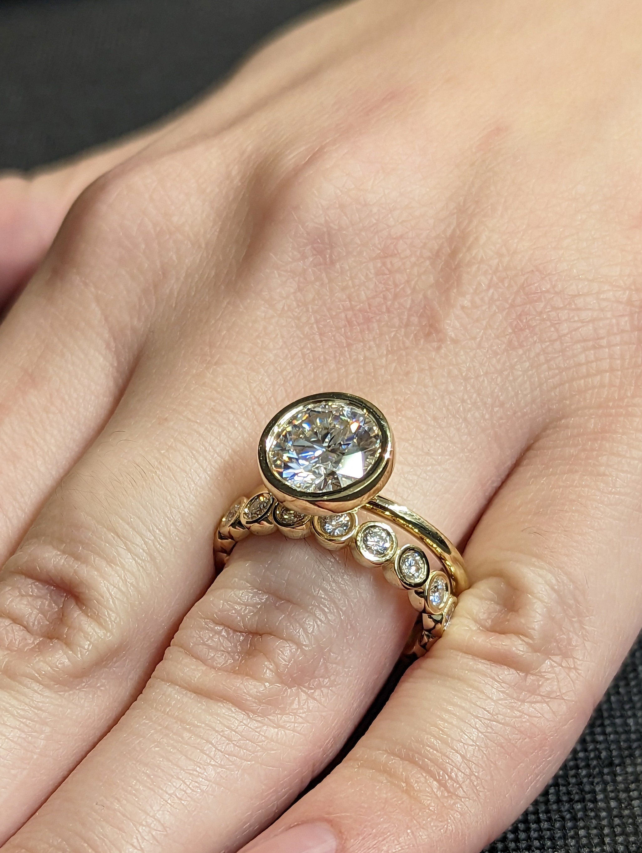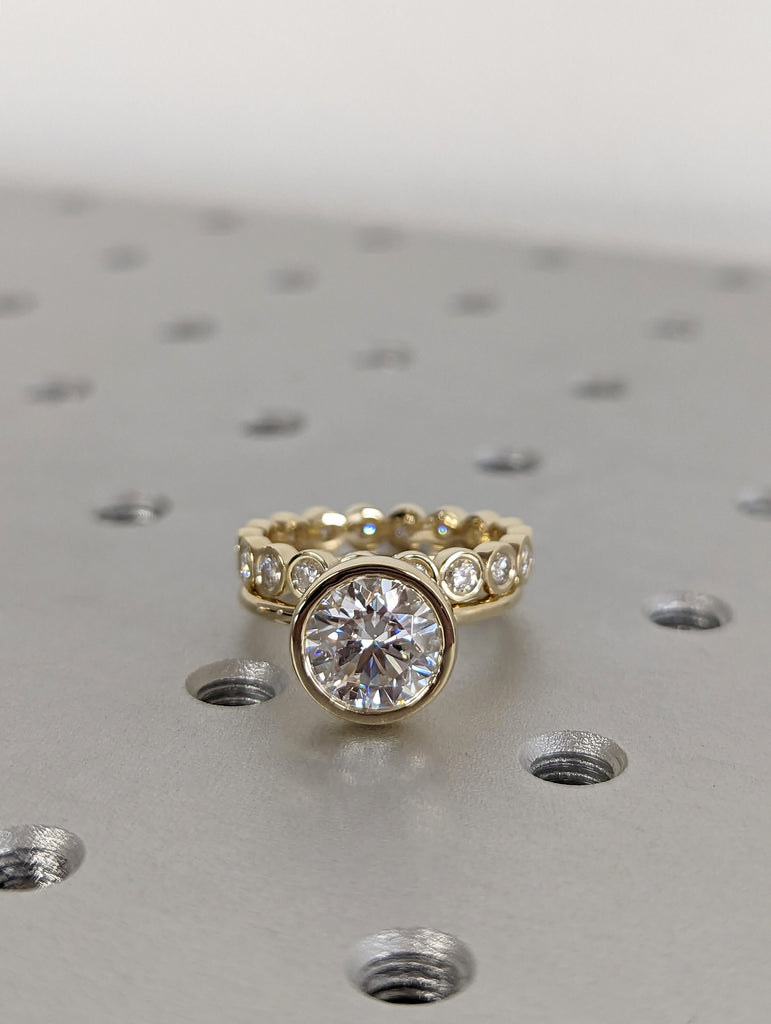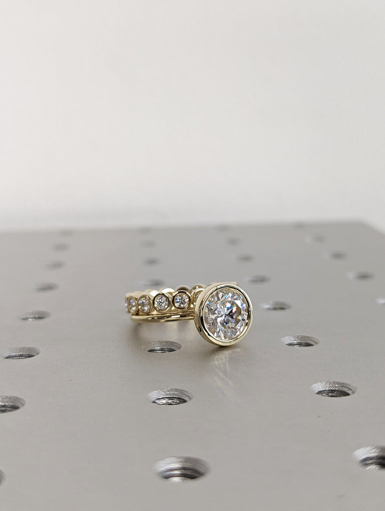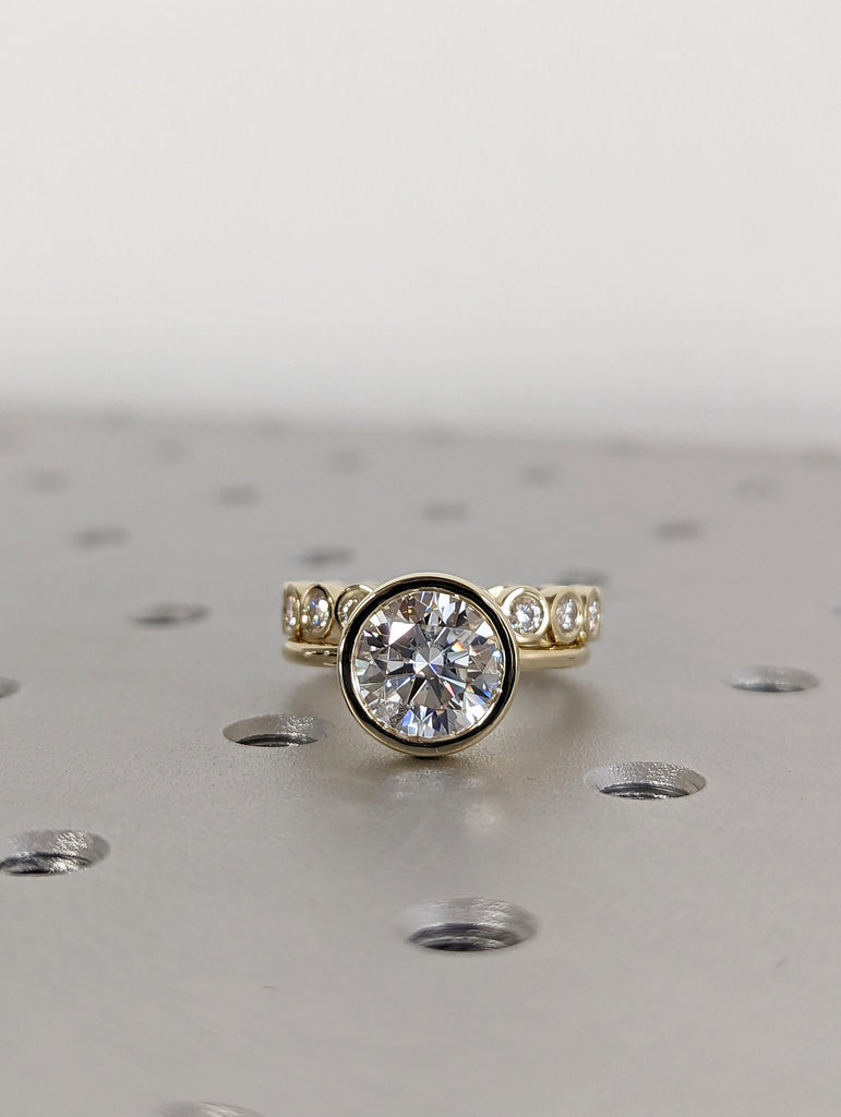 Understated and elegant, this sophisticated engagement ring features a round bezel setting atop a delicate rounded band. Can be matched with a full eternity diamond band.
