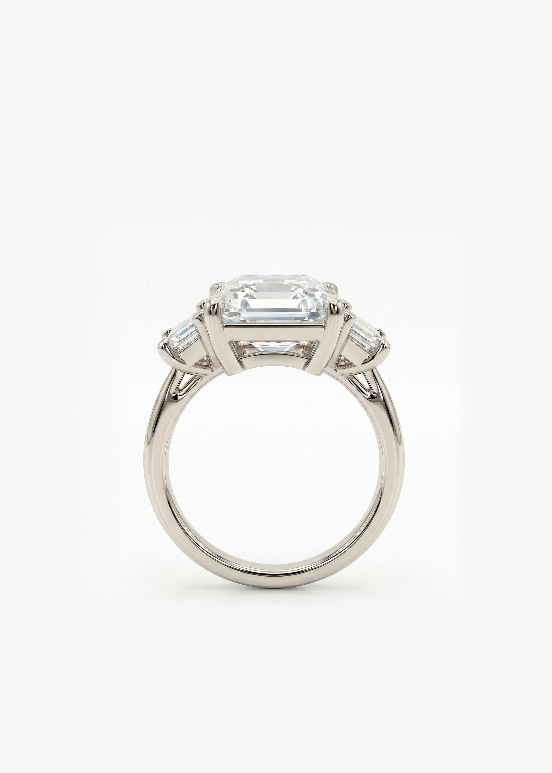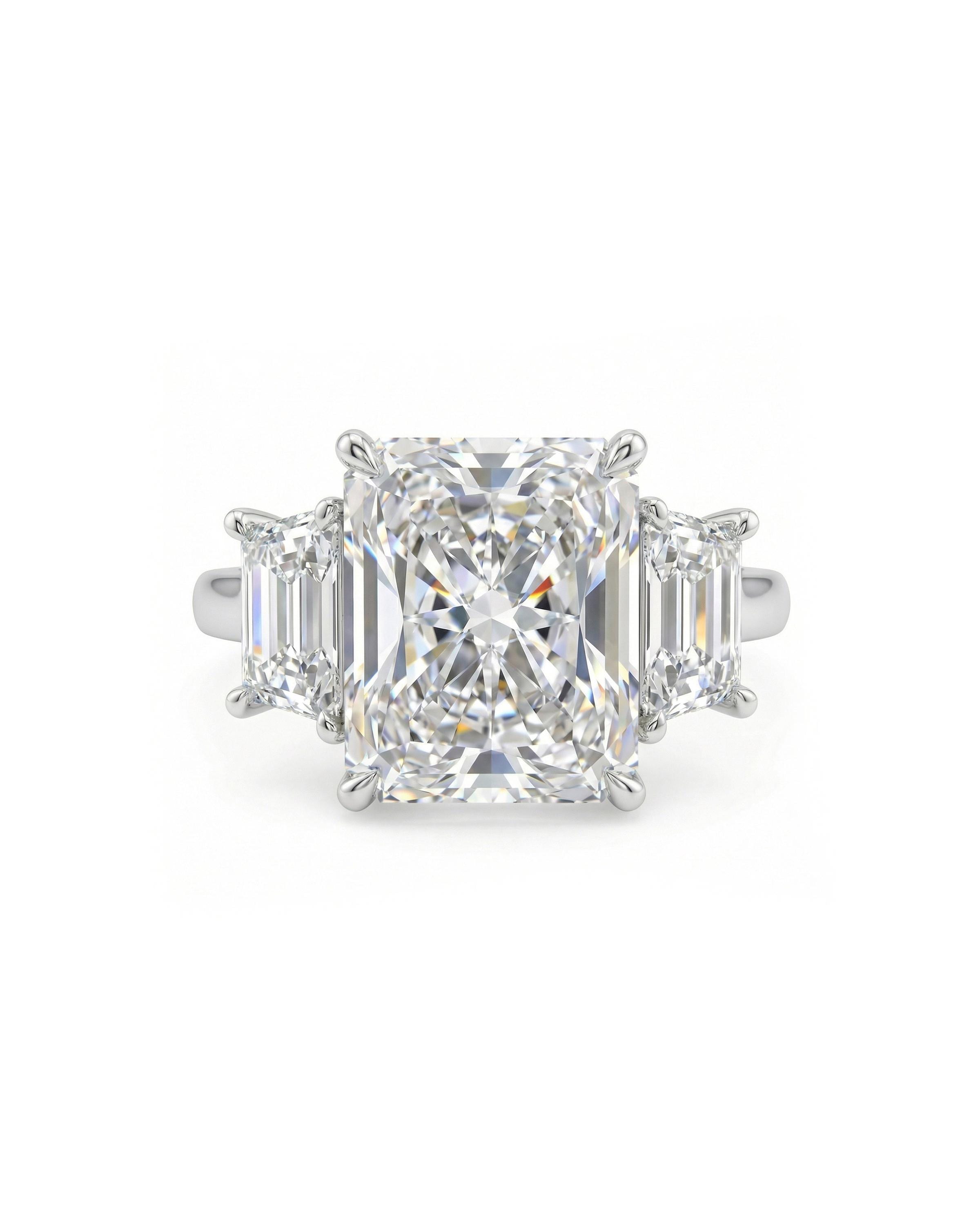 This radiant cut Lab Grown Diamond engagement ring makes a bold yet refined statement. Beautifully framed by sleek trapezoid-cut side stones that enhance its brilliance and symmetry, creating a timeless ring that feels both modern and luxurious.