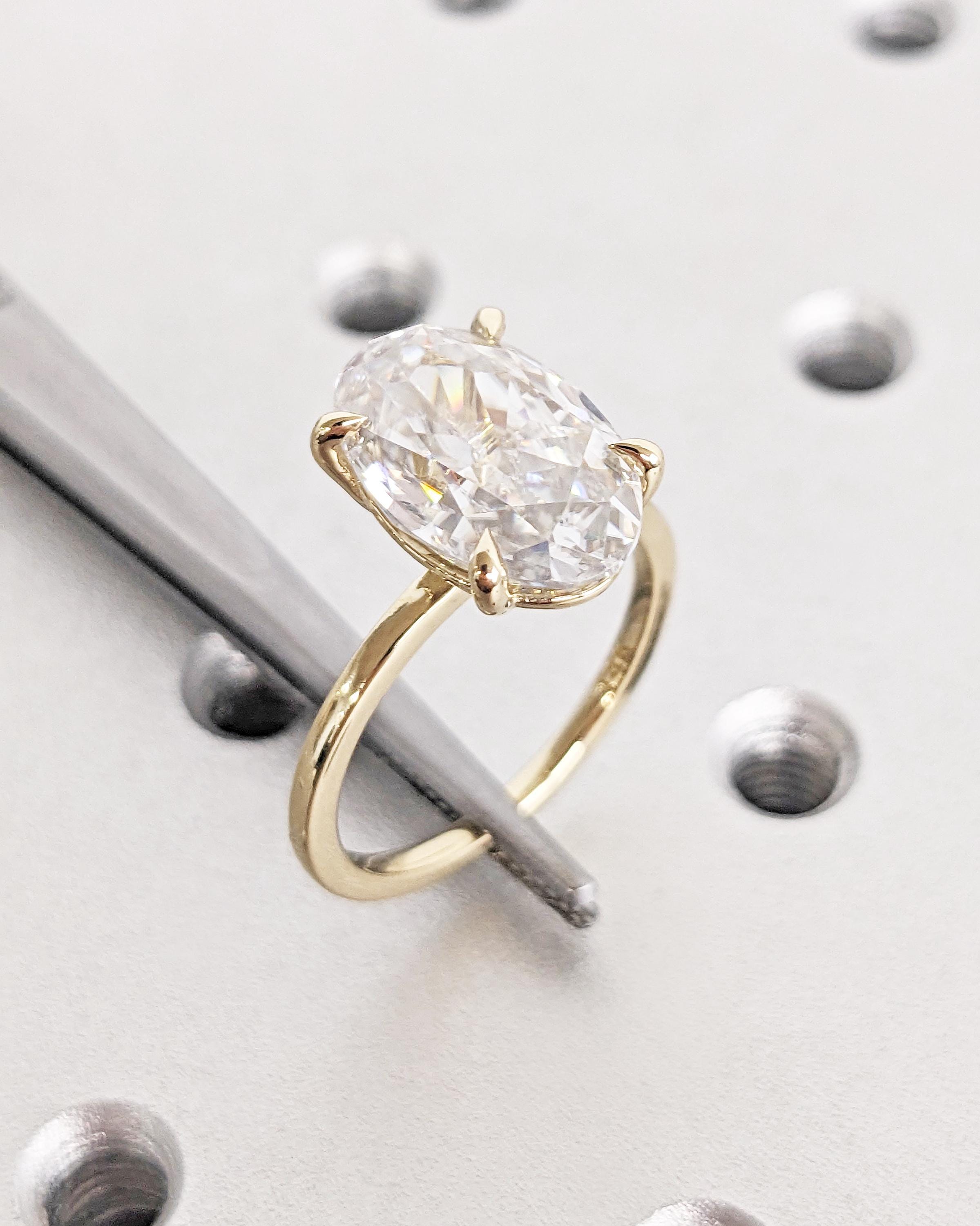 Experience the allure of our exquisite 5 carat lab diamond engagement ring. A stunning oval shape center stone, meticulously crafted with crushed ice facets. Enhanced by a delicate, super-thin setting and a 1.6mm dainty band, this ring epitomizes elegance and beauty.
