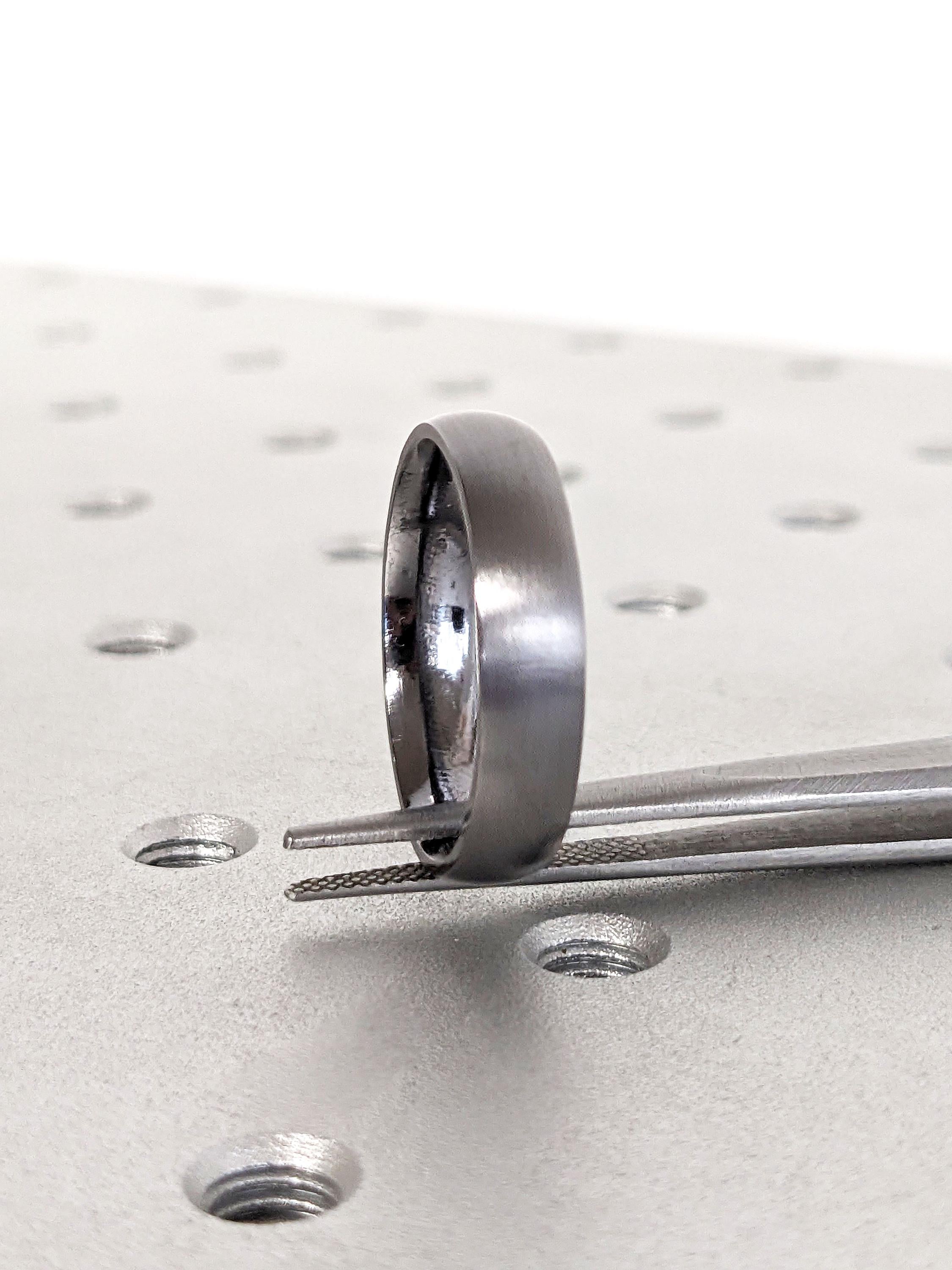 A minimalist, matte/brushed finishing, 5mm width ring for him, in classic court shape for a comfortable everyday wear. Made with rare earth metal, Tantalum, its sophisticated gunmetal color, corrosion-resistant and hypoallergenic quality, making this ring the perfect alternative choice for people with sensitive skin, or allergies to nickel or metal.